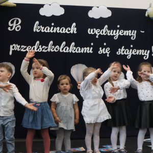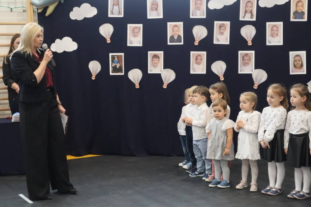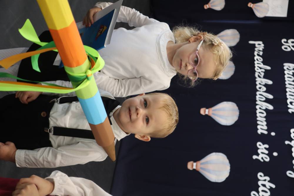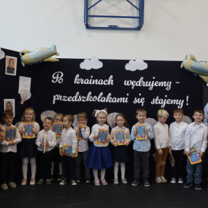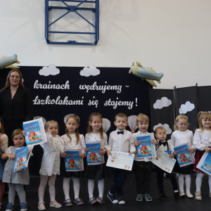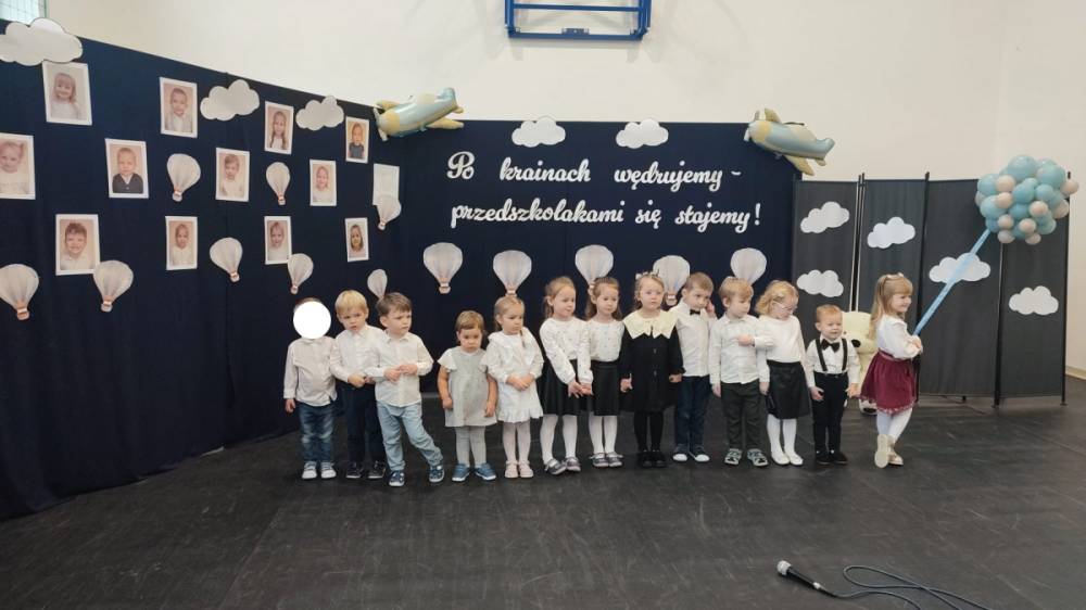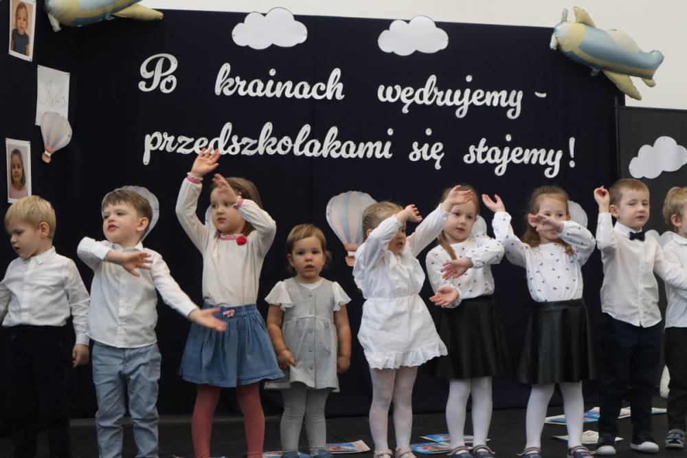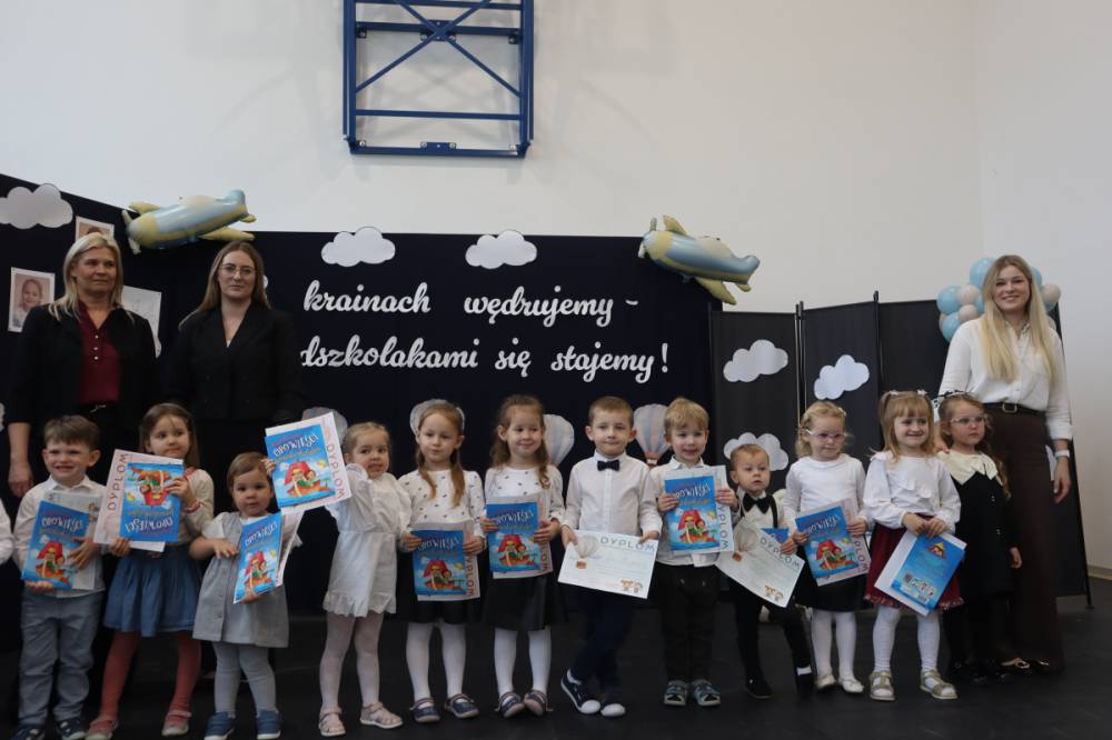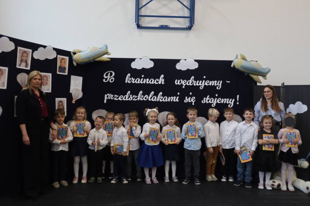 Po krainach wędrujemy – przedszkolakami się stajemy! Pod takim hasłem odbyło się dzis w naszej szkole wyjątkowe wydarzenie – Pasowanie na Przedszkolaka. Z dumą patrzylismy, jak nasi najmłodsi odkrywcy z Punktu Przedszkolnego „Kubuś” przemierzali krainy tanca, spiewu i mądrosci, by na koncu podróży oficjalnie wstąpic do grona przedszkolaków. Razem z naszymi maluchami występowały również dzieci z Oddziału Przedszkolnego, które dały piękny przykład młodszym i dodały im pewności siebie na scenie. Przedstawienie zostało przygotowane z ogromnym zaangażowaniem przez Panią Alicję Malicką, Panią Karolinę Swit oraz Panią Łucję Srokę, które zadbały, aby każdy moment był pełen magii, radosci i przedszkolnego ciepła. W tworzeniu dekoracji ogromnym wsparciem były panie: Joanna Smulczyk oraz Beata Boron. Gratulujemy wszystkim nowo pasowanym przedszkolakom! Niech każdy dzien będzie dla Was nową przygodą pełną usmiechu, nauki i zabawy.