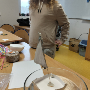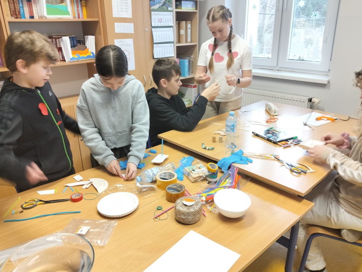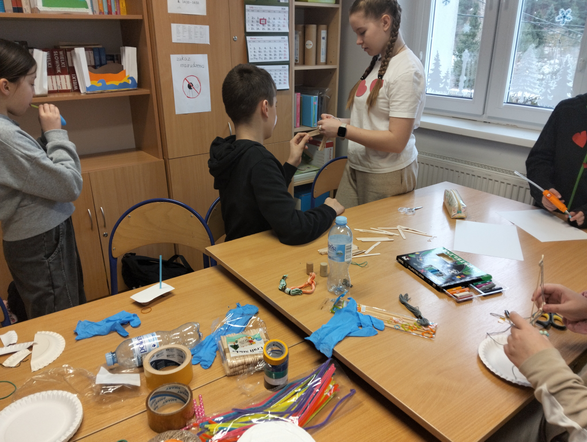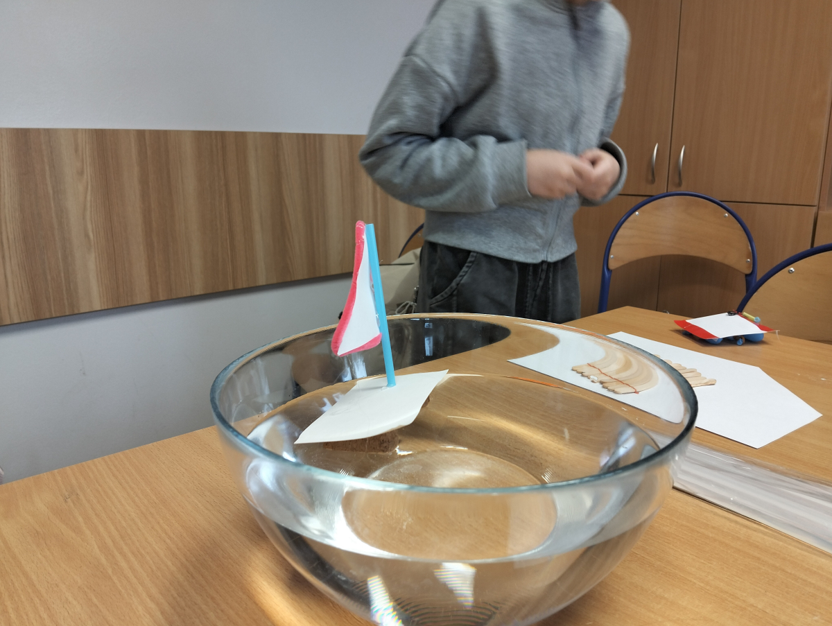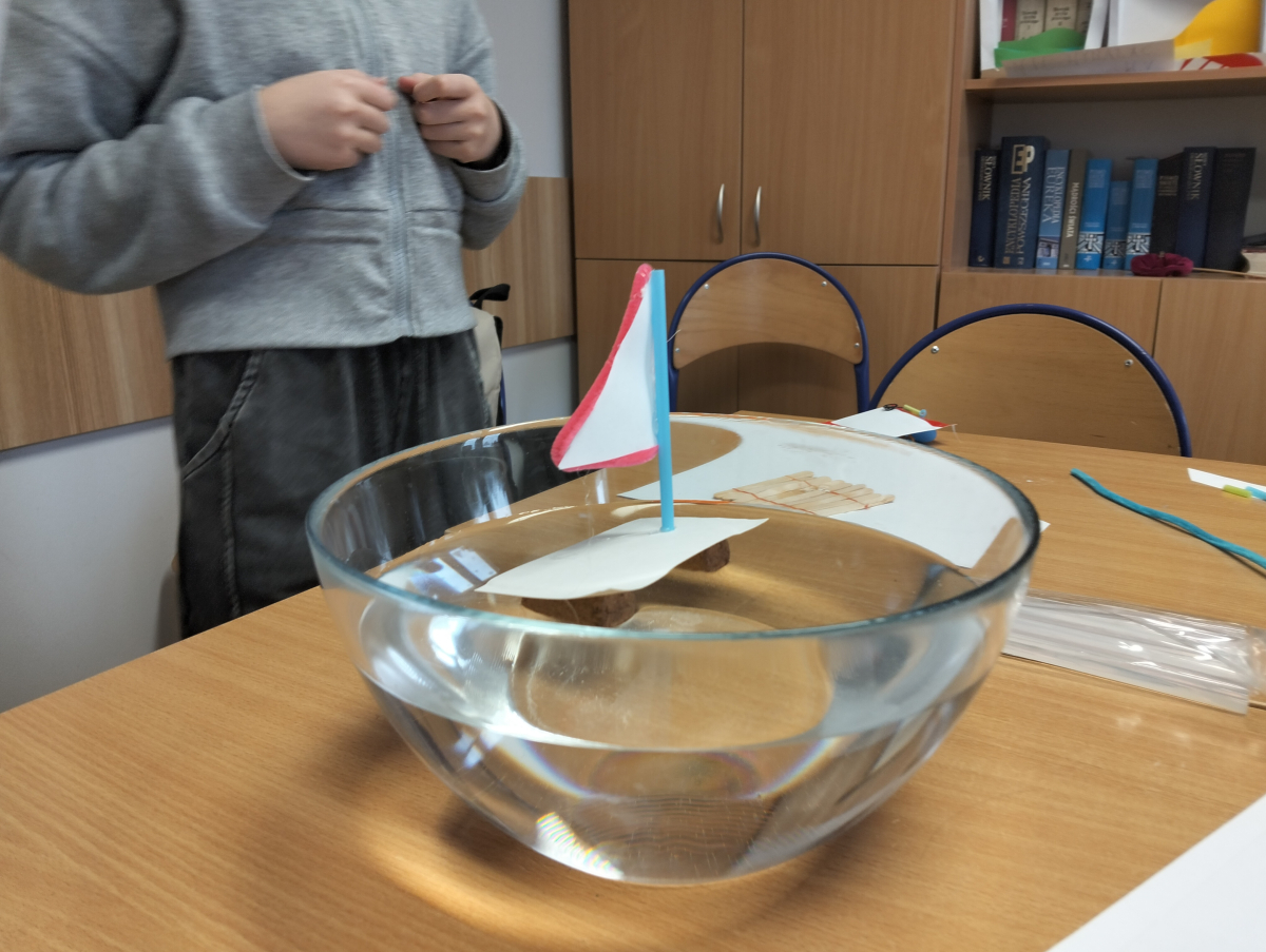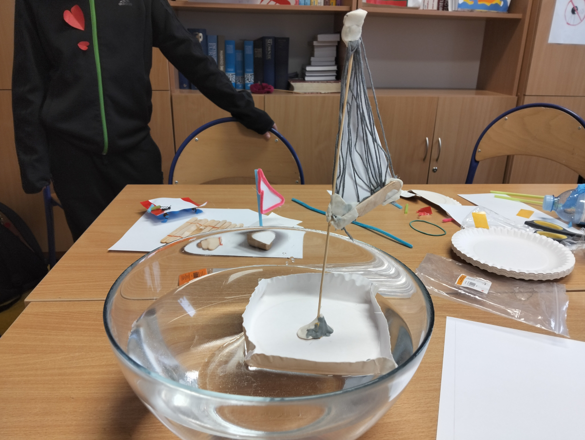 Uczniowie zapoznali się z różnorodnymi pojazdami pływającymi, a poprzez widoeprezentację przyjrzeli się dokładnie ich budowie. Następnie wcielili się w rolę konstruktorów i przystąpili do budowy modeli statków oraz innych pojazdów pływających, tj. żaglówka, katamaran czy tratwa. Kolejnym etapem zajęć było testowanie wykonanych modeli na wodzie i poszukiwanie odpowiedzi na pytania: czy utrzymują się one na wodzie, co decyduje, że nie toną, czy posiadają jakieś wady konstrukcyjne oraz (ewentualnie) dlaczego toną?