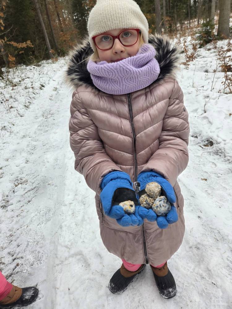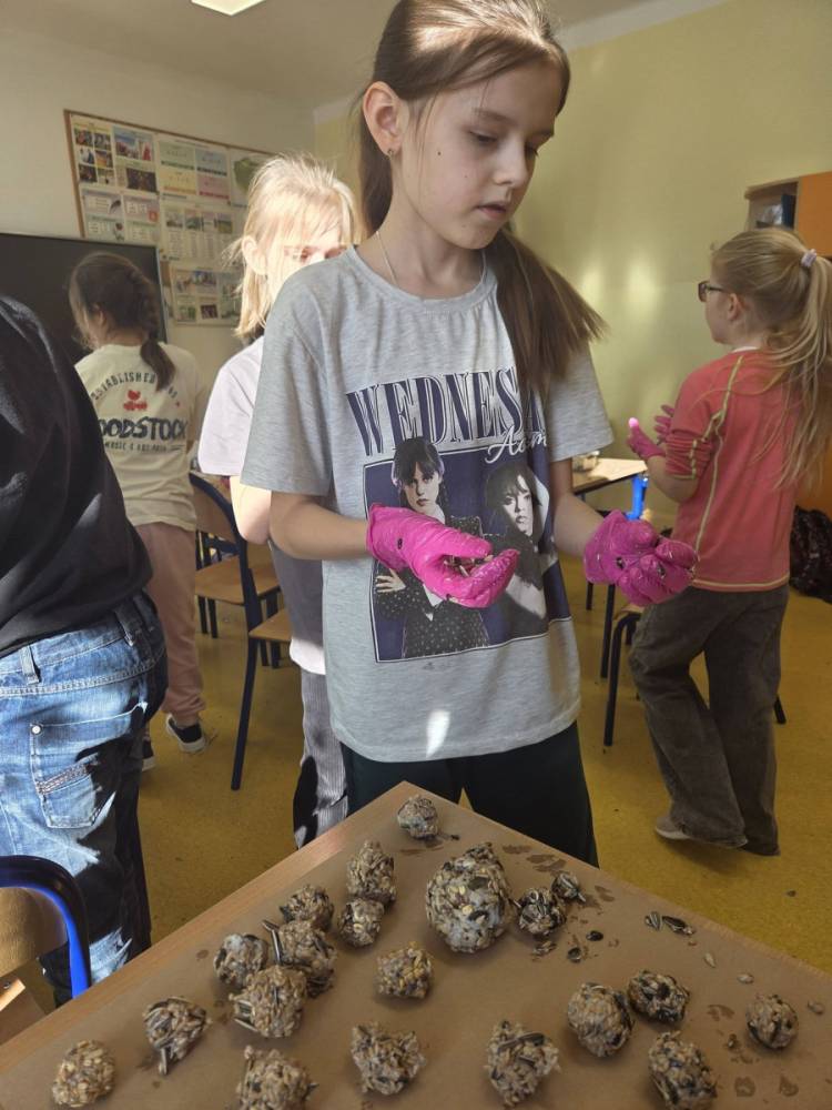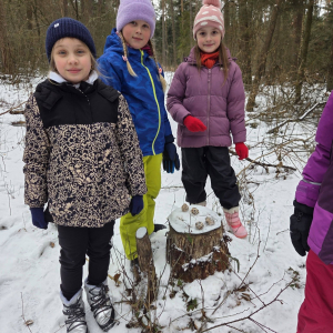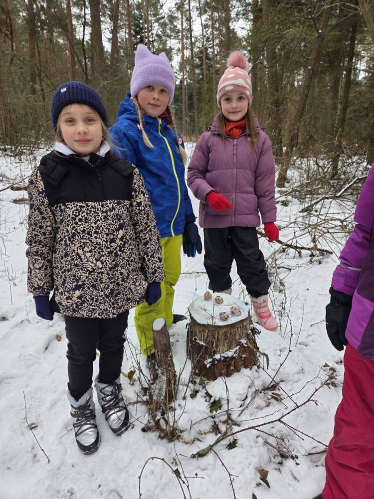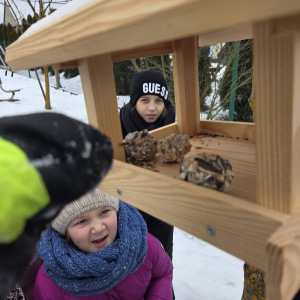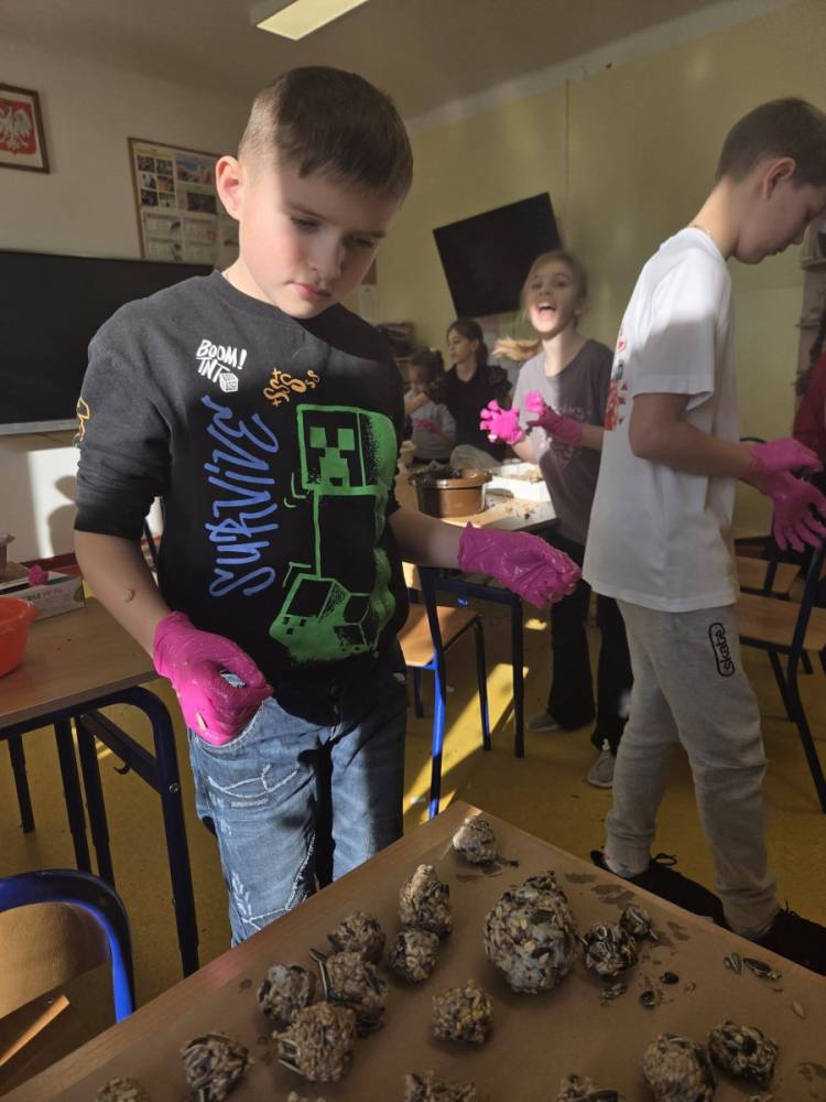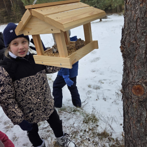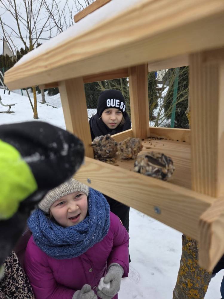 Zima to trudny czas dla ptaków, dlatego nasi najmłodsi uczniowie wyruszyli z wcześniej przygotowanym pokarmem. Z uśmiechami na twarzach i wielkimi sercami roznosili jedzenie do karmników oraz do lasu, pomagając skrzydlatym przyjaciołom przetrwać mroźne dni. To były małe gesty, ale o ogromnym znaczeniu. Tak właśnie rodzi się empatia odpowiedzialność i miłość do przyrody.