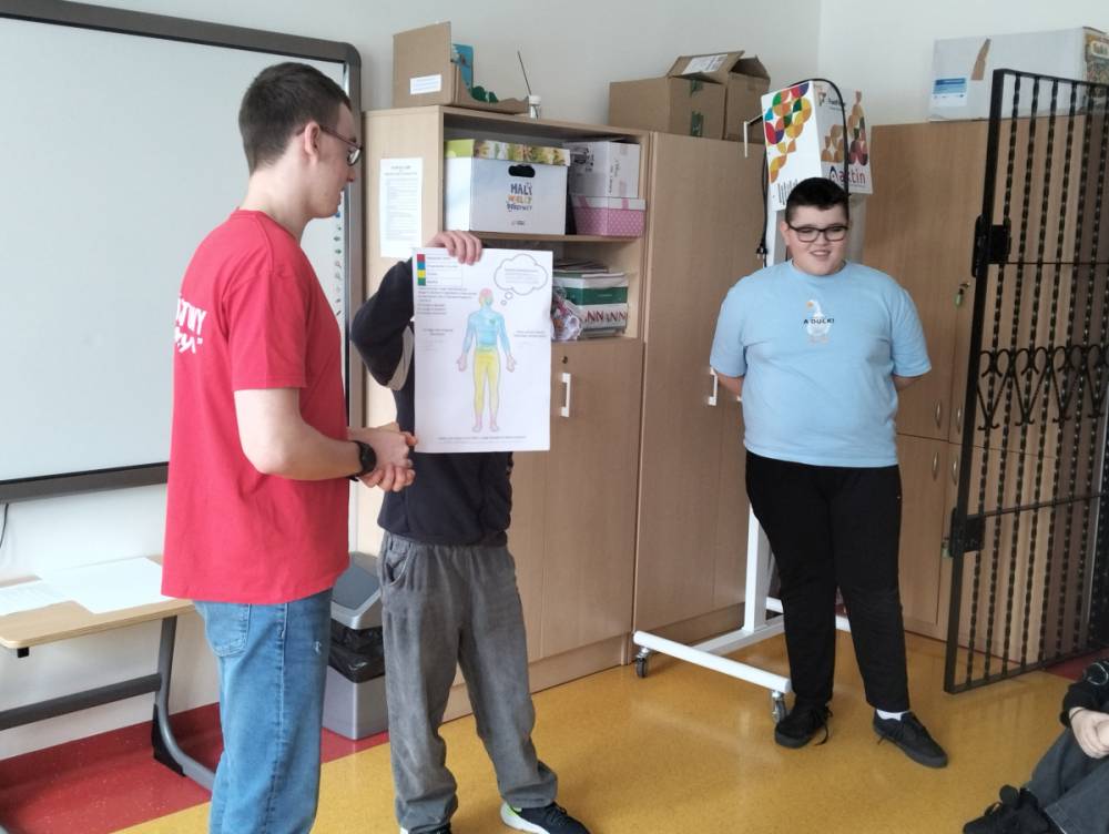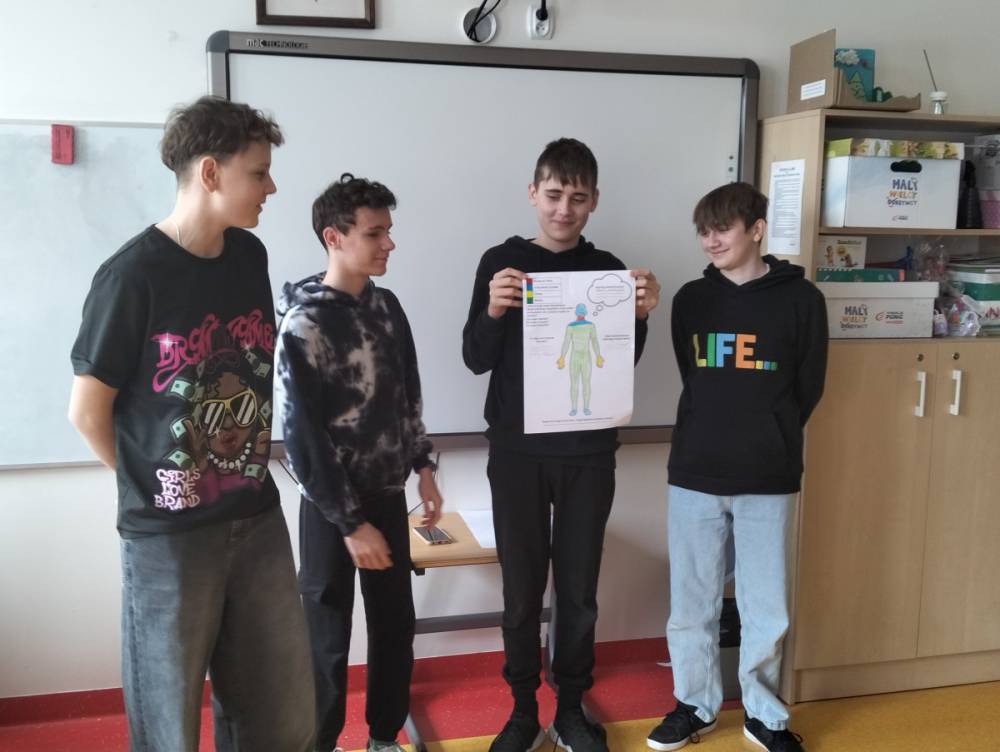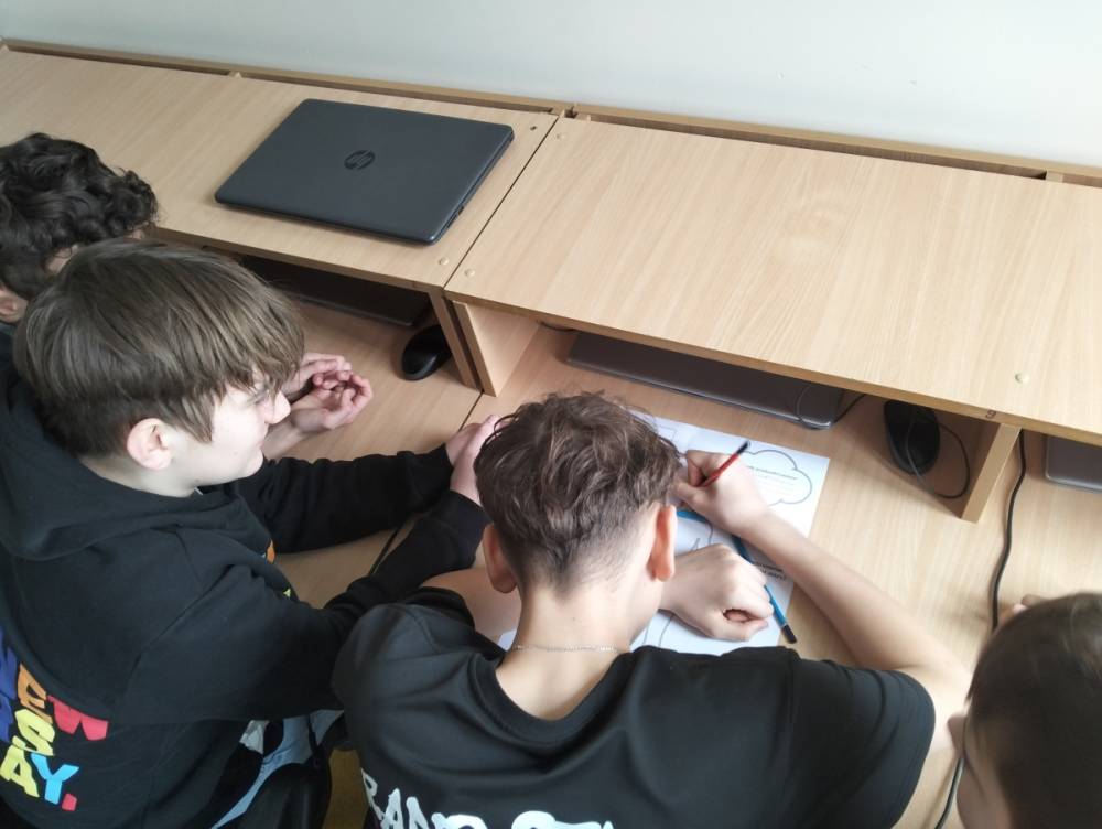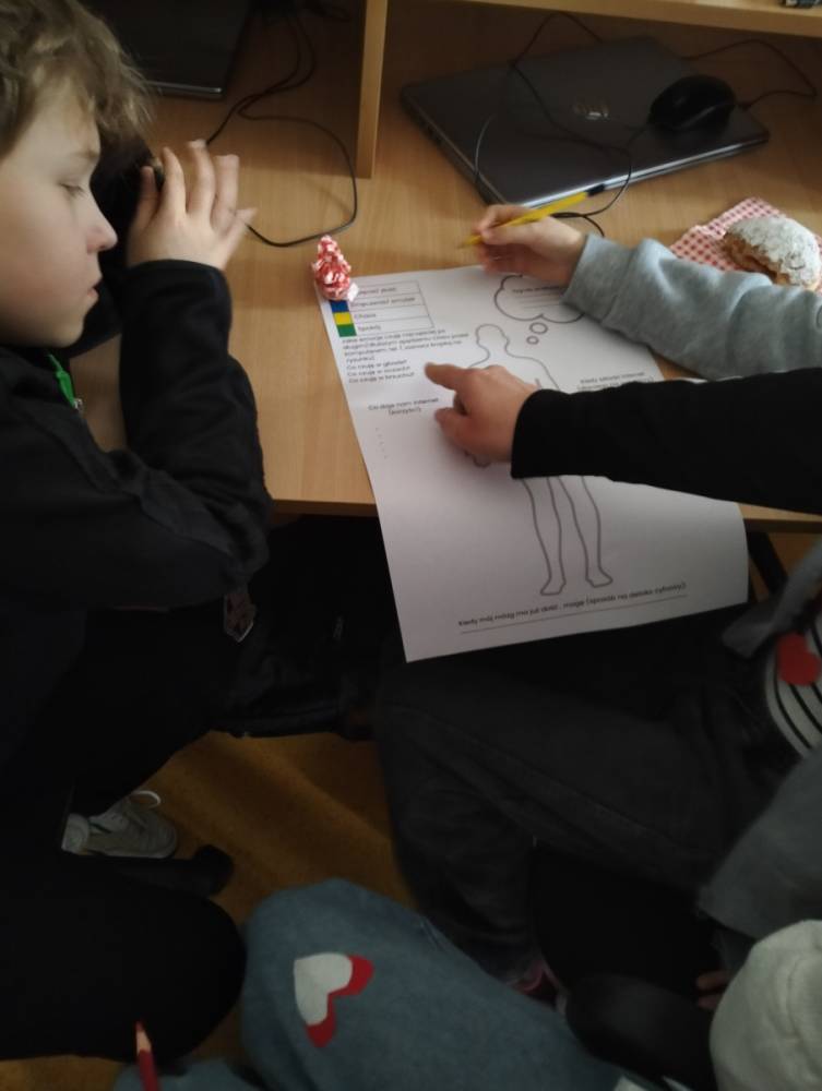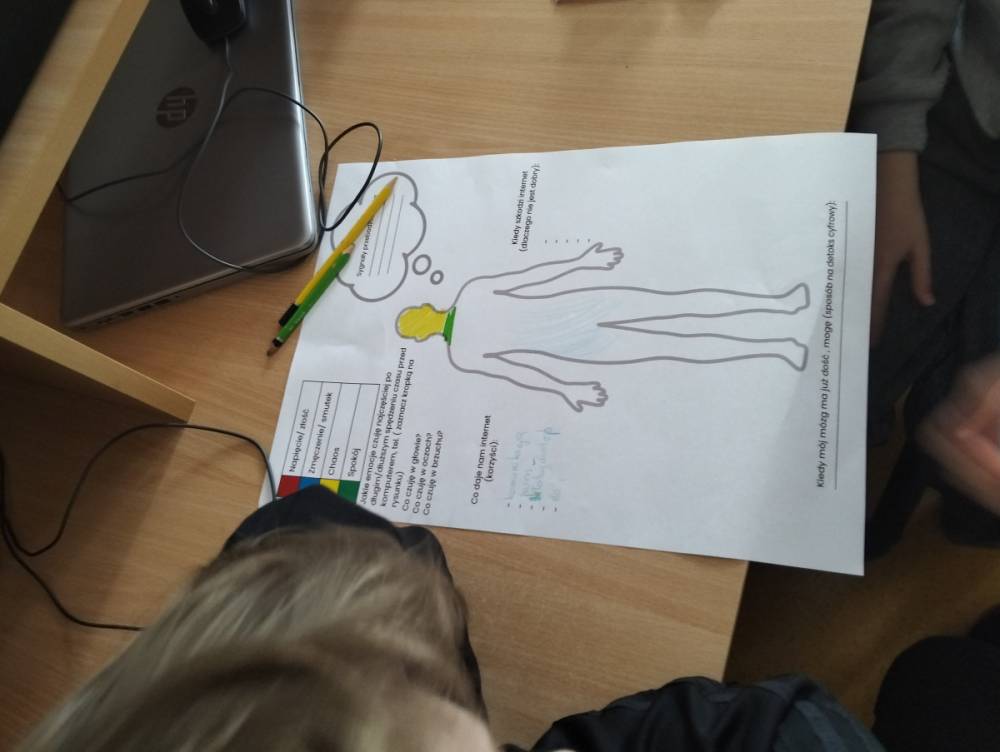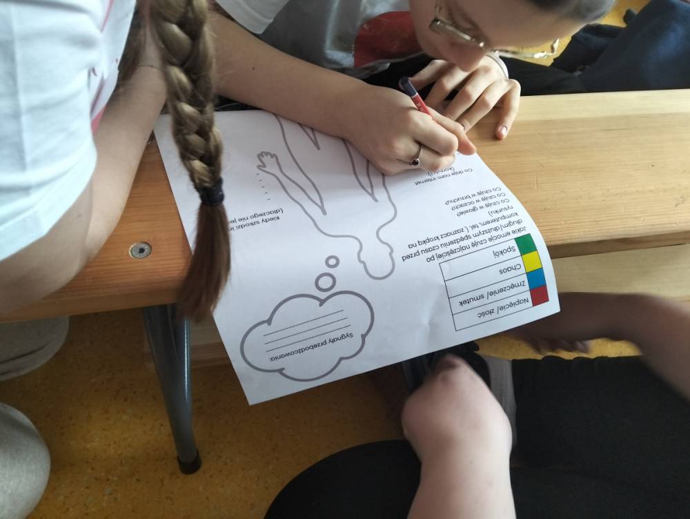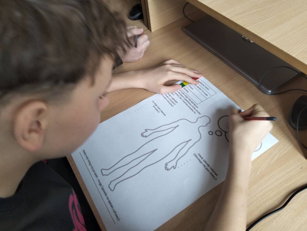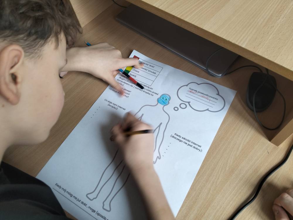 Po części teoretycznej przyszedł czas na warsztaty praktyczne, w czasie których uczniowie współpracując ze sobą w grupach podsumowali swoją wiedzę na temat wpływu technologii cyfrowych przez które stale jesteśmy bombardowani ogromną ilością bodźców: informacjami, aktualizacjami, powiadomieniami.
