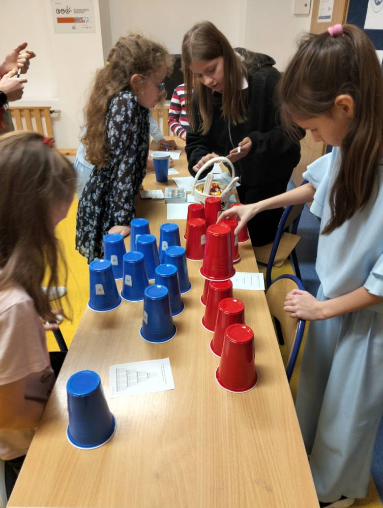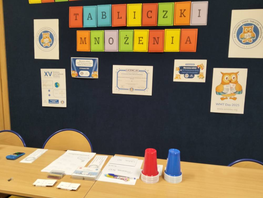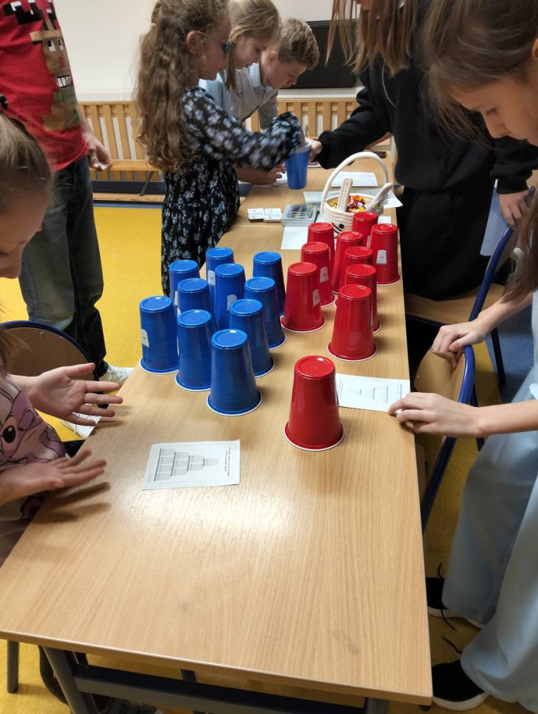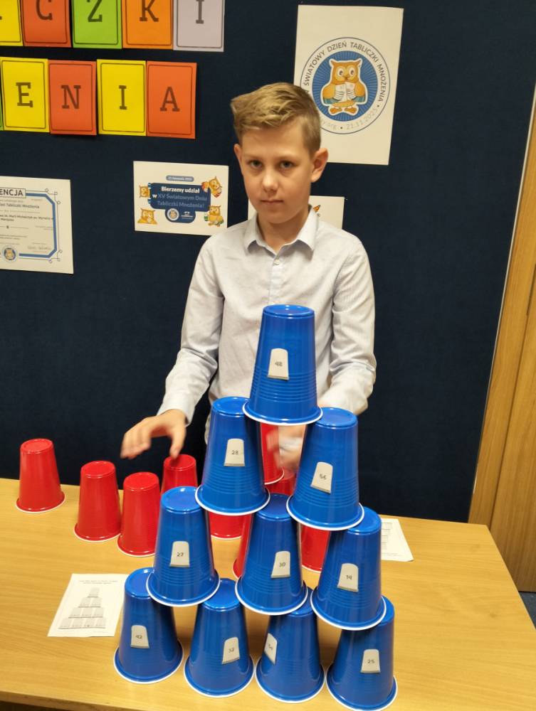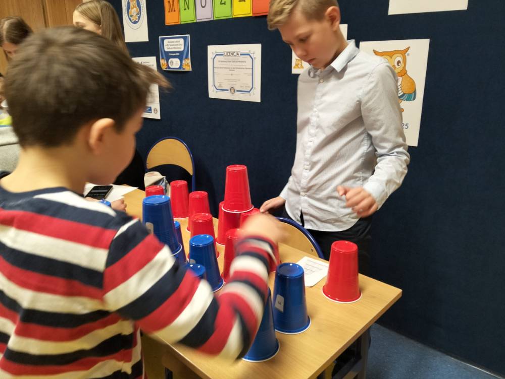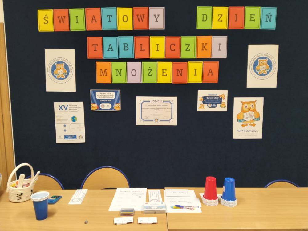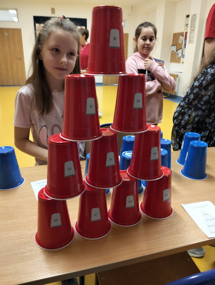 24 listopada 2025 r. obchodziliśmy Światowy Dzień Tabliczki Mnożenia. Akcja ta udowodniła, że nauka przez zabawę motywuje, przynosi efekty, a przede wszystkim odczarowuje matematykę. Szkolna komisja, w składzie Oliwia i Helenka, sprawdzała u młodszych i starszych uczniów oraz odważnych nauczycieli znajomość tabliczki mnożenia w niecodzienny sposób. Kubeczkowe wieże, Łamigłówki zapałczane, Karty Grabowskiego oraz Potęgowe Memory, to tylko niektóre konkurencje z jakimi zmierzyli się egzaminowani.