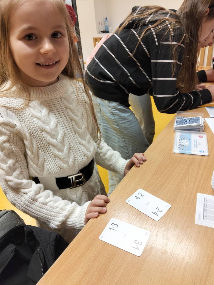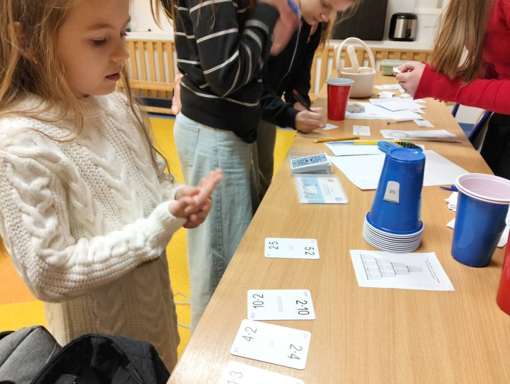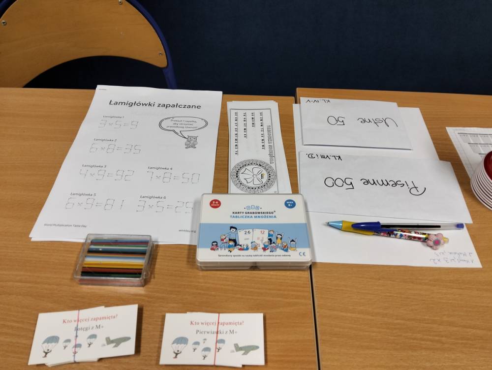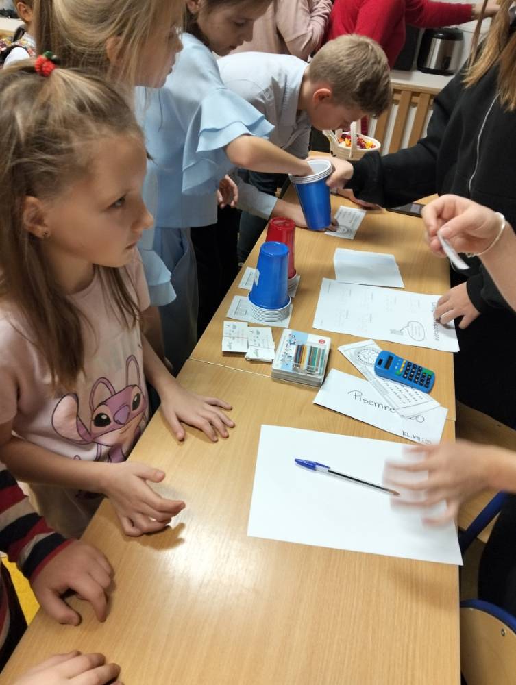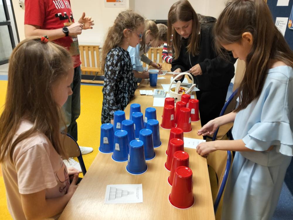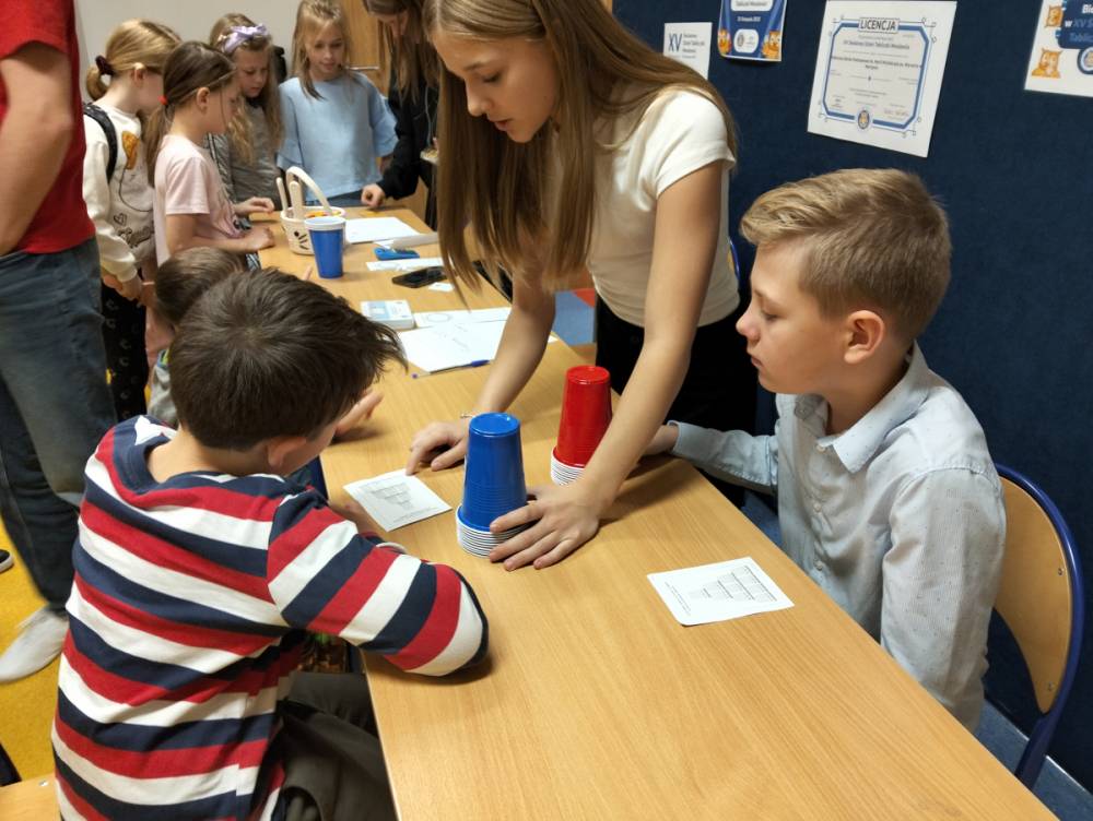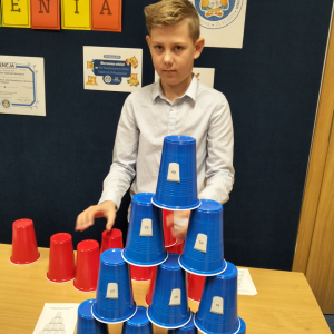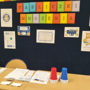 24 listopada 2025 r. obchodziliśmy Światowy Dzień Tabliczki Mnożenia. Akcja ta udowodniła, że nauka przez zabawę motywuje, przynosi efekty, a przede wszystkim odczarowuje matematykę. Szkolna komisja, w składzie Oliwia i Helenka, sprawdzała u młodszych i starszych uczniów oraz odważnych nauczycieli znajomość tabliczki mnożenia w niecodzienny sposób. Kubeczkowe wieże, Łamigłówki zapałczane, Karty Grabowskiego oraz Potęgowe Memory, to tylko niektóre konkurencje z jakimi zmierzyli się egzaminowani.