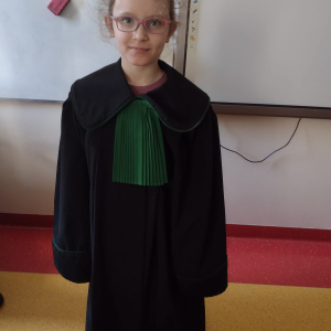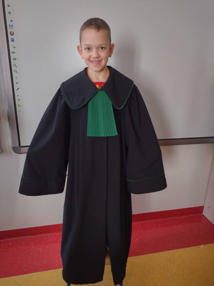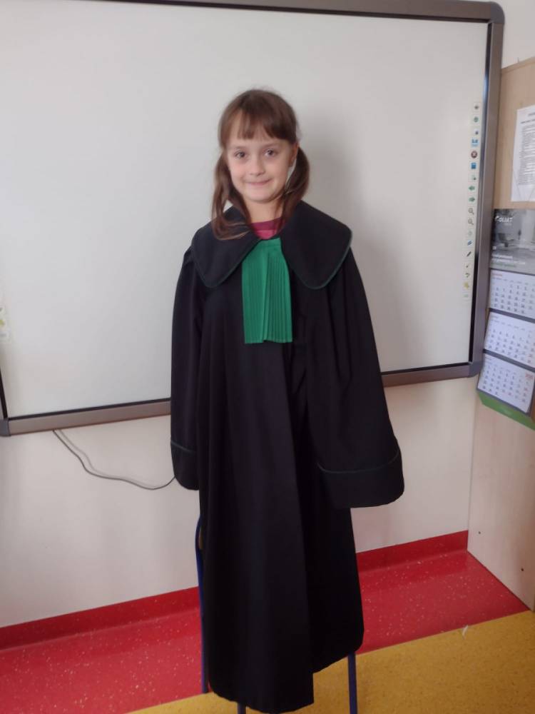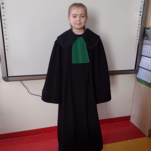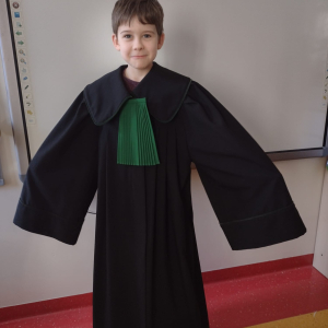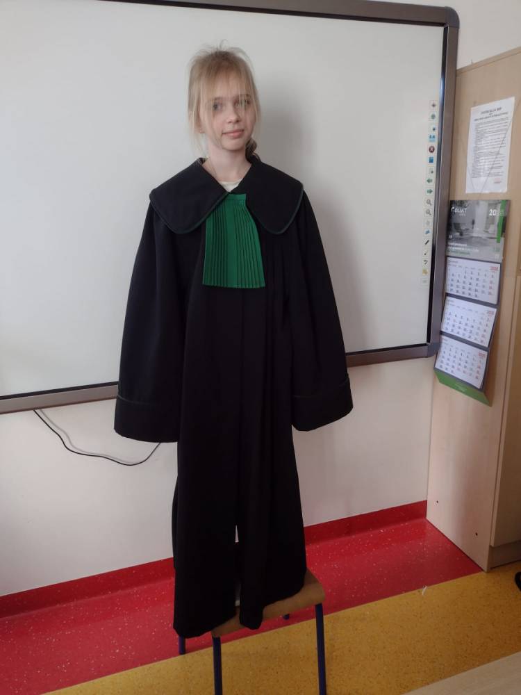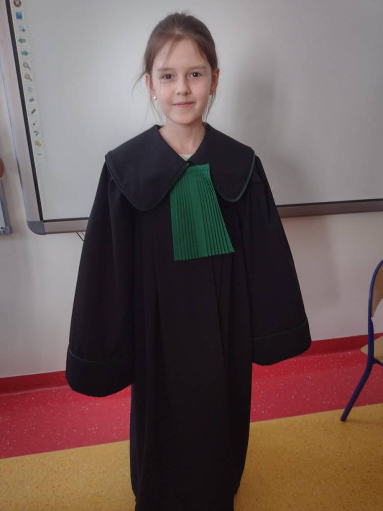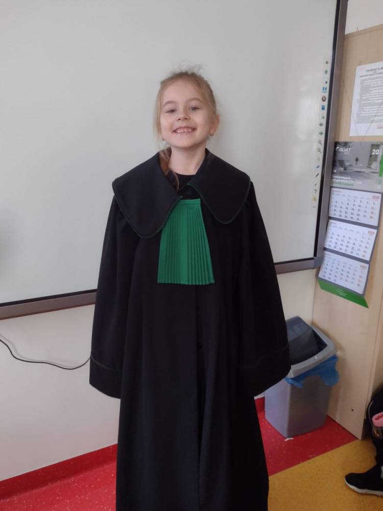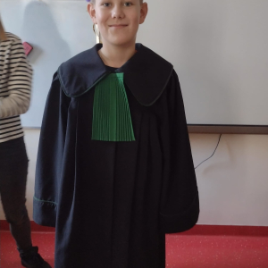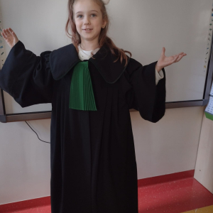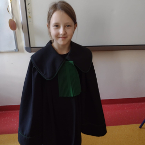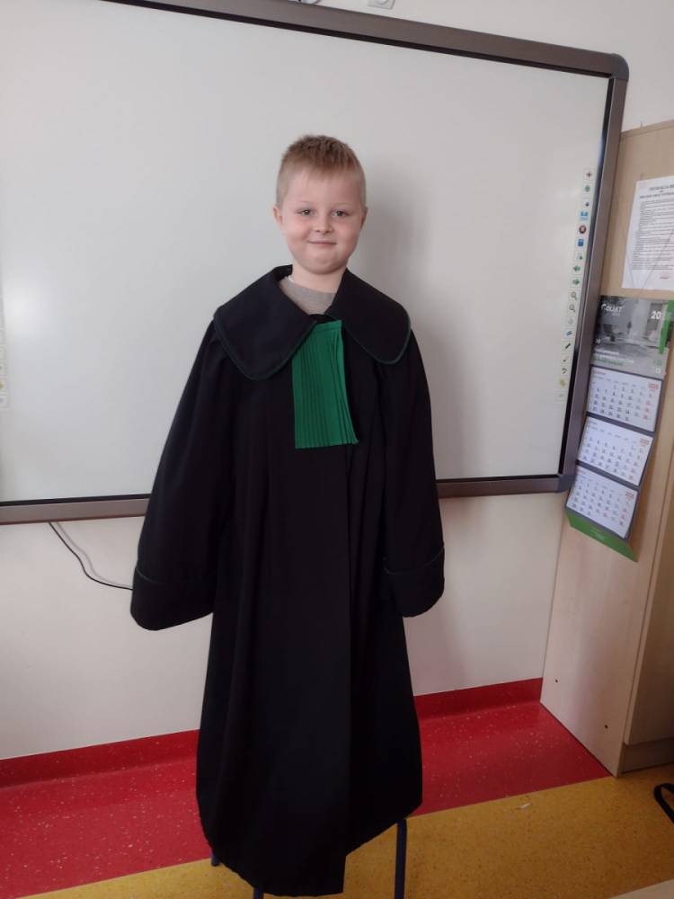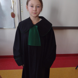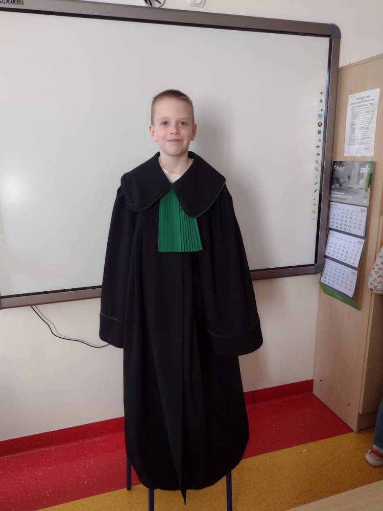 Spotkanie było również okazją do poznania aspektów pracy prawnika, zadań adwokata, sędziego i prokuratora. Uczniowie mieli także okazję zobaczyć i przymierzyć strój adwokacki– czarną togę oraz charakterystyczny zielony żabot.