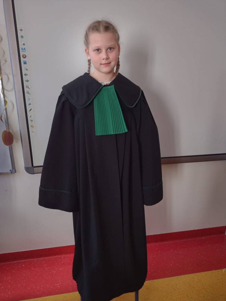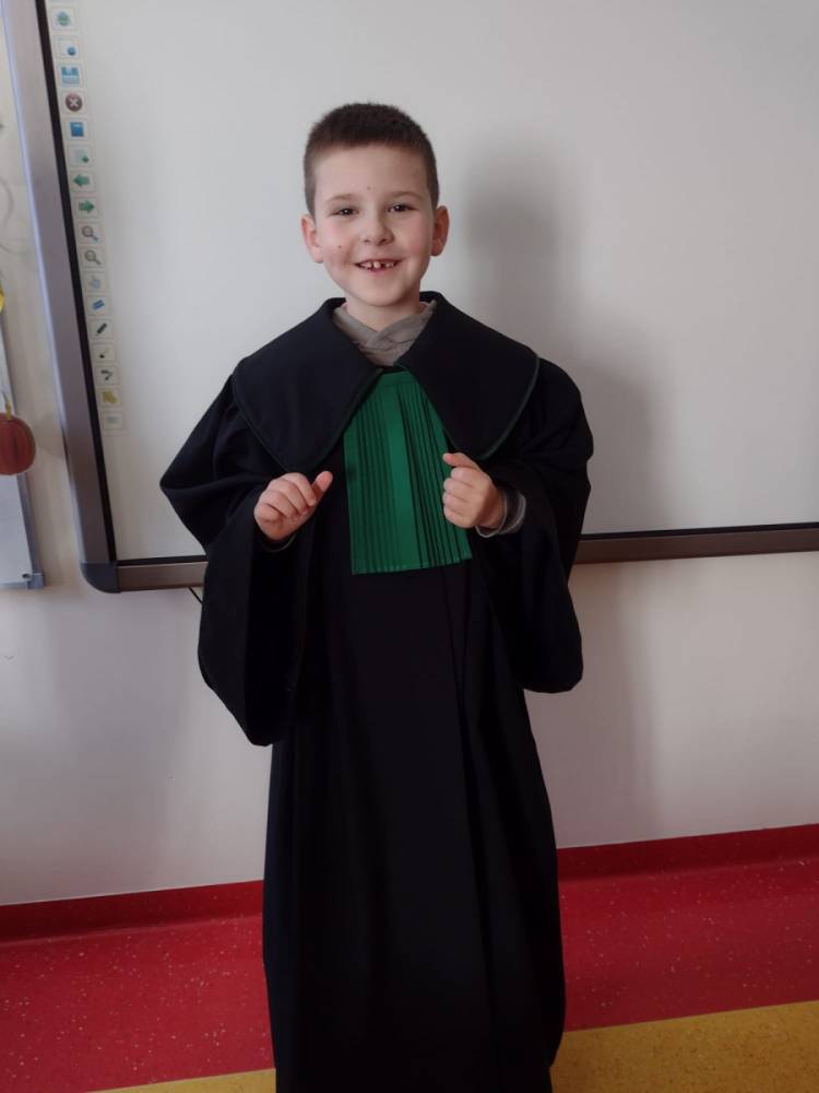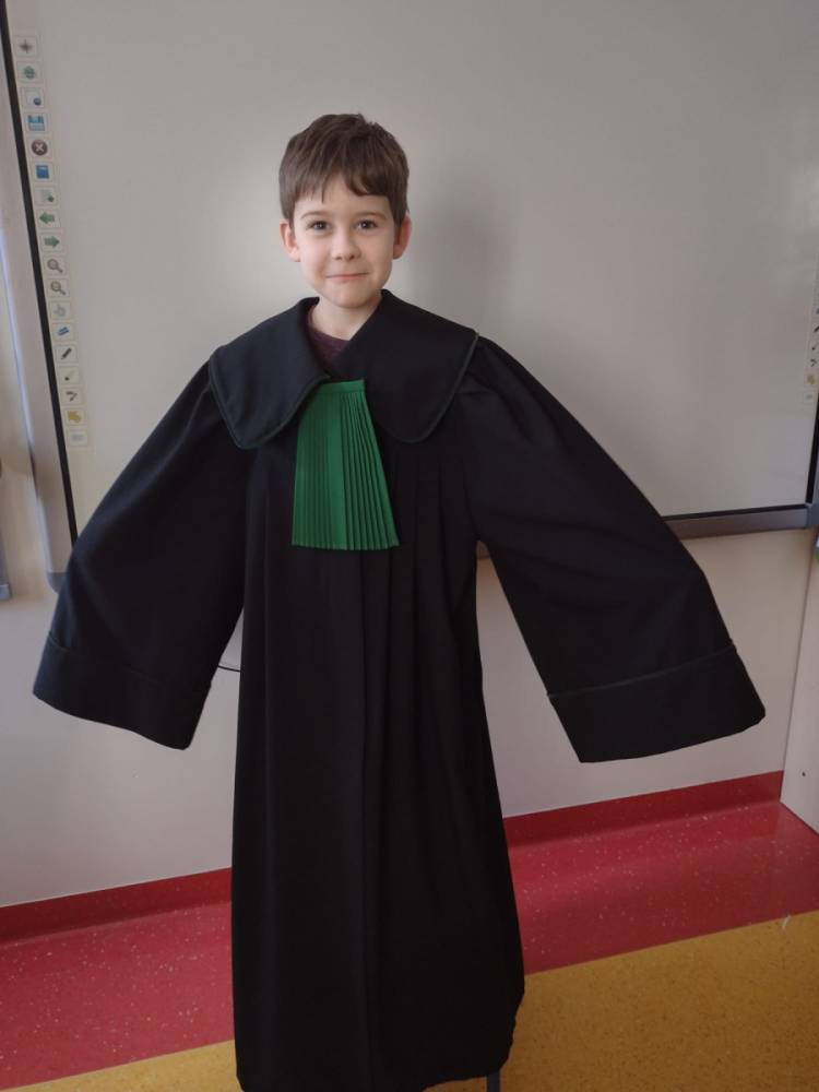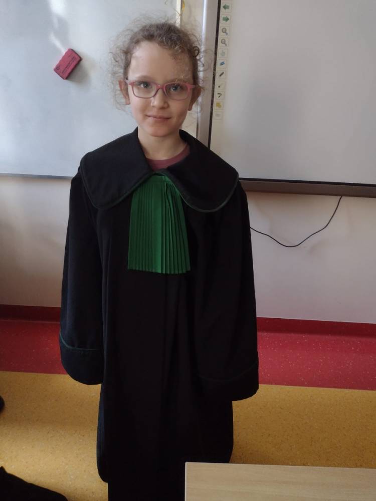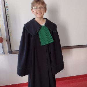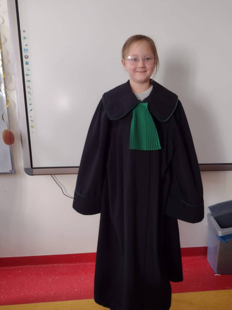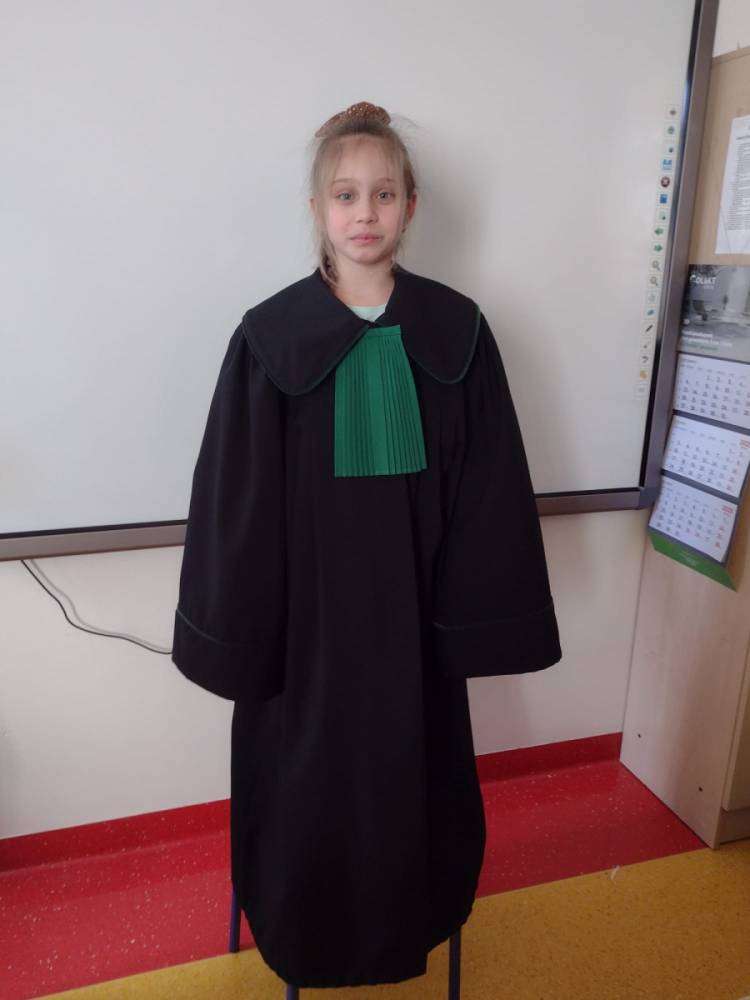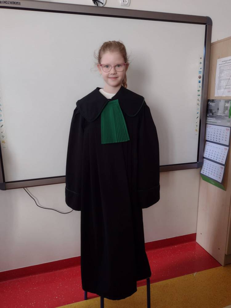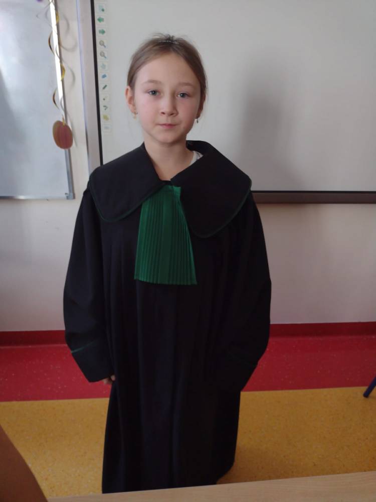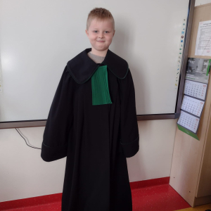Spotkanie było również okazją do poznania aspektów pracy prawnika, zadań adwokata, sędziego i prokuratora. Uczniowie mieli także okazję zobaczyć i przymierzyć strój adwokacki– czarną togę oraz charakterystyczny zielony żabot.