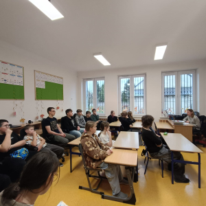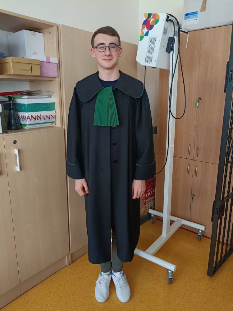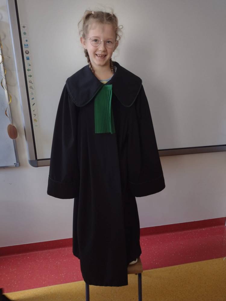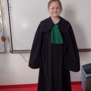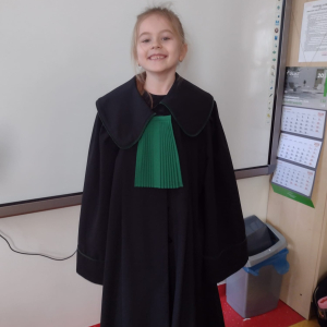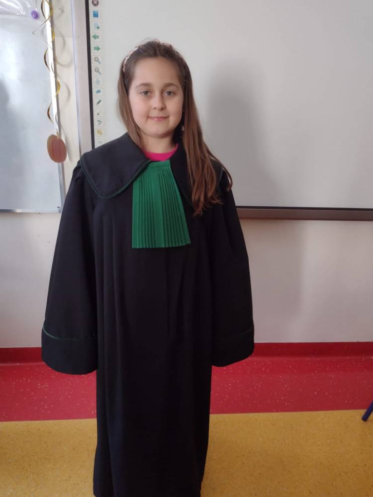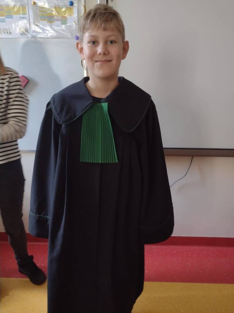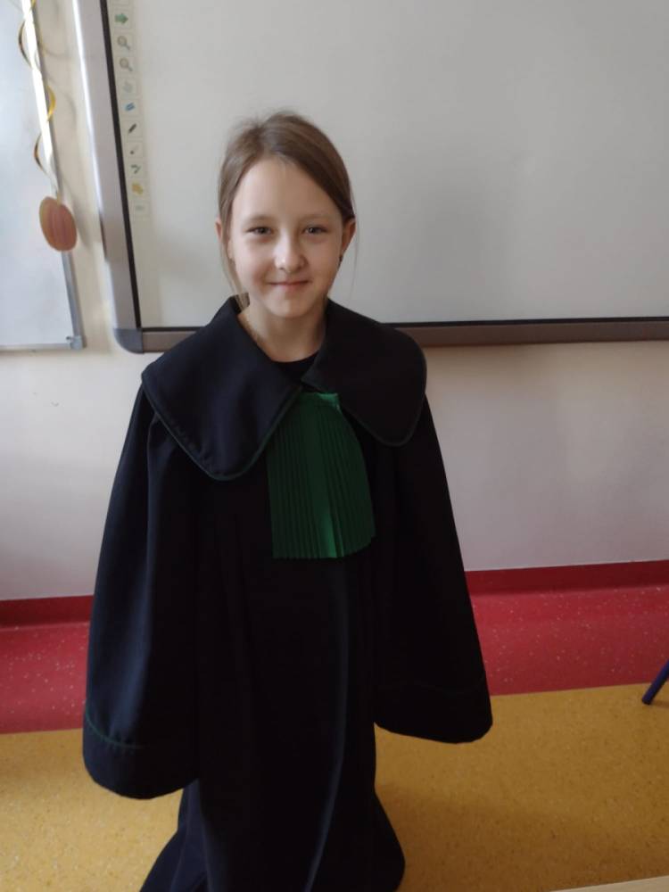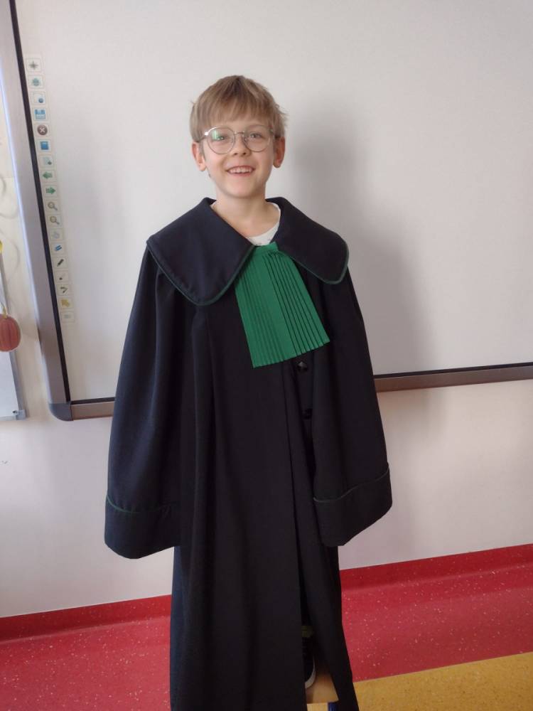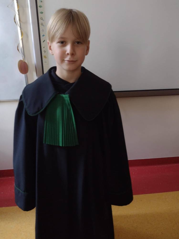 Spotkanie było również okazją do poznania aspektów pracy prawnika, zadań adwokata, sędziego i prokuratora. Uczniowie mieli także okazję zobaczyć i przymierzyć strój adwokacki– czarną togę oraz charakterystyczny zielony żabot.