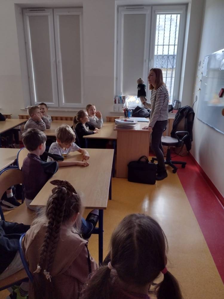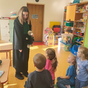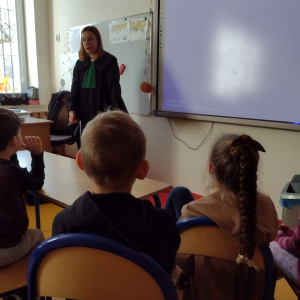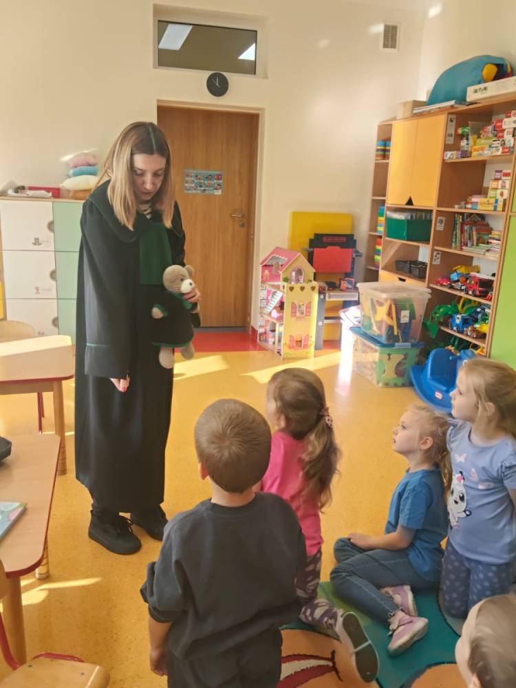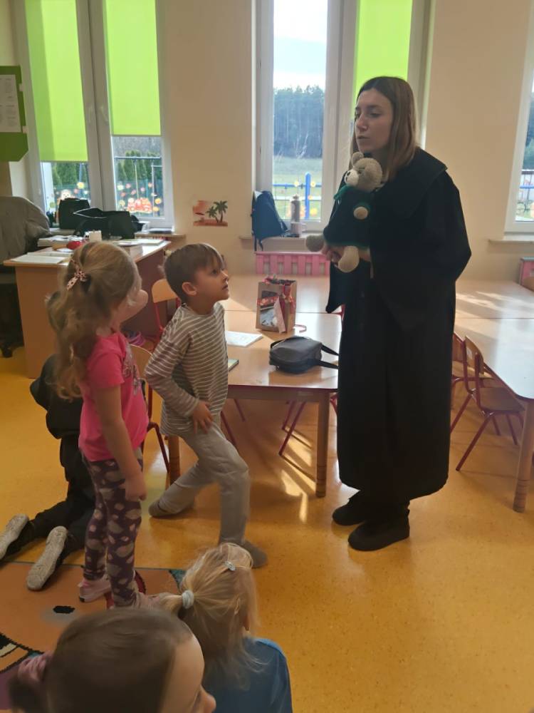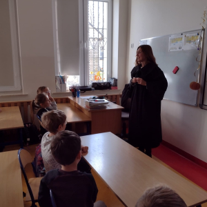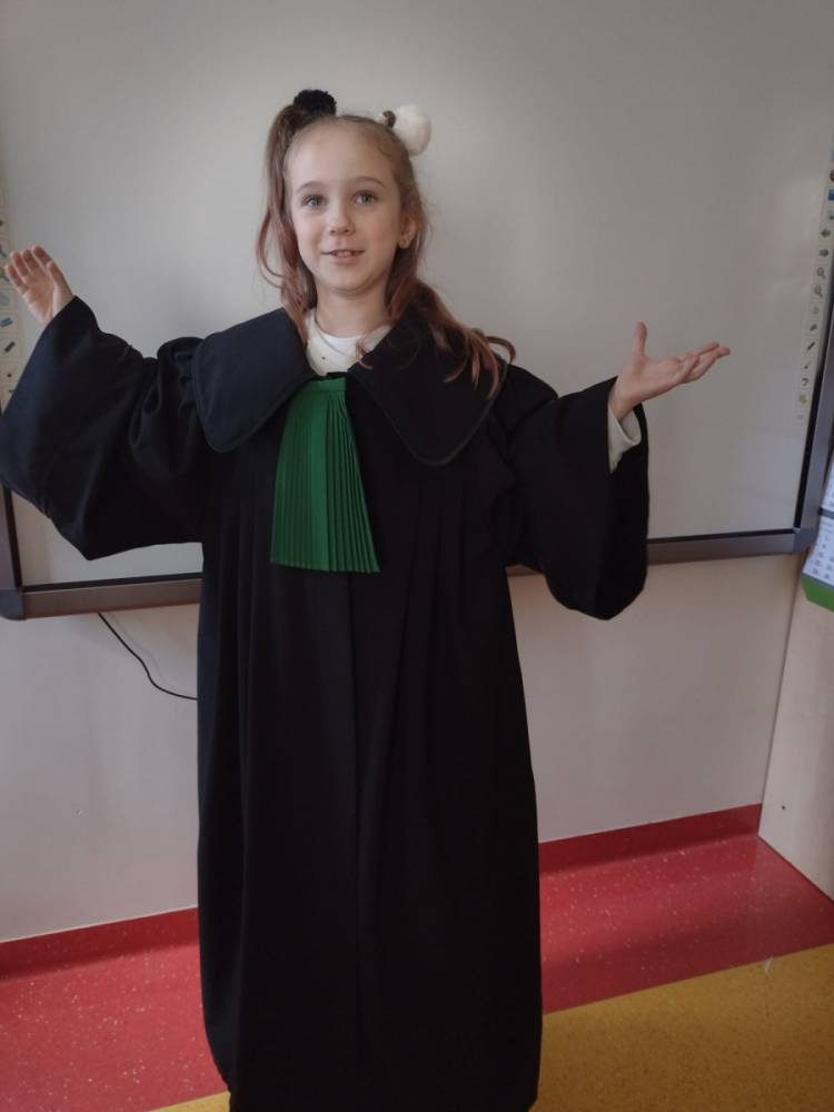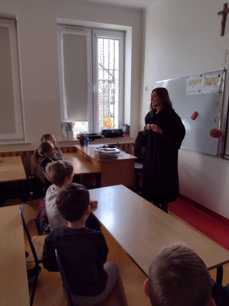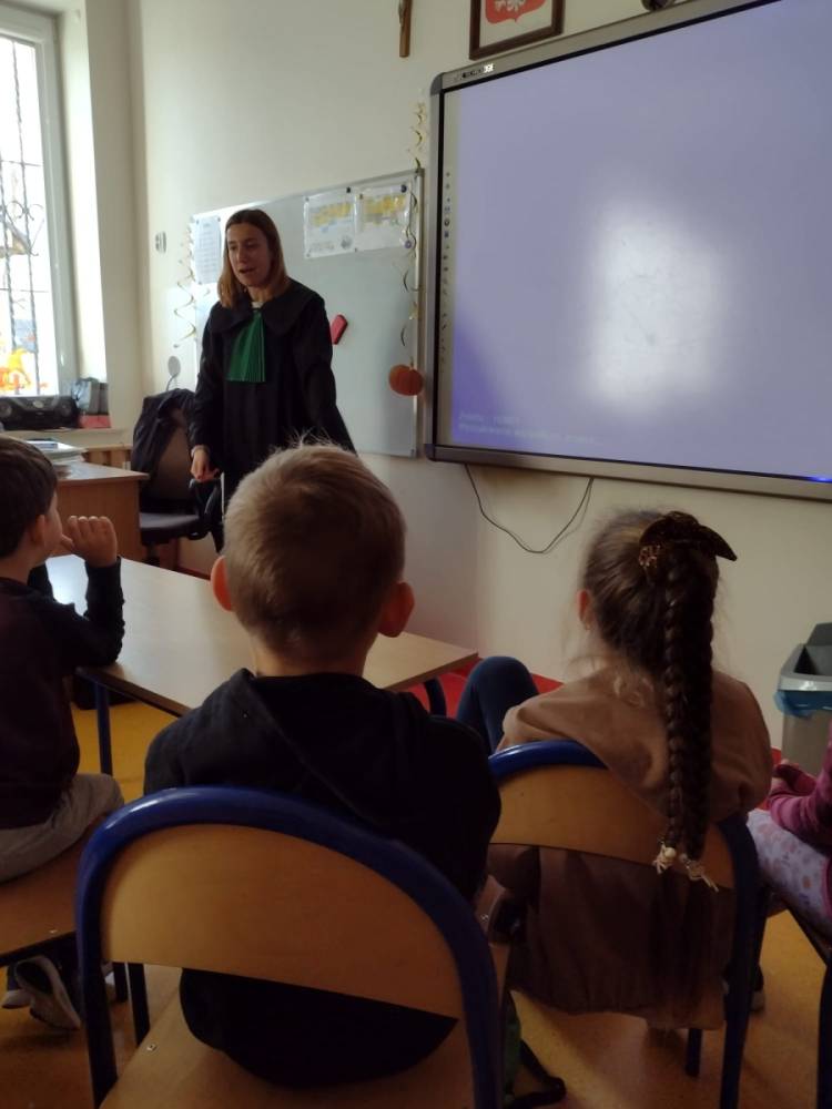 Podczas wizyty w naszej szkole Pani adwokat Julita Wcisło-Kołdras nie zapomniała o młodszych uczniach. W związku z obchodzonym 20 listopada Międzynarodowym Dniem Praw Dziecka zwróciła uwagę na znaczenie praw najmłodszych oraz na potrzeby i ochronę dzieci na całym świecie. Nie obyło się także bez prezentacji i przymierzania stroju adwokackiego. Powodzeniem cieszył się również Miś Adwokat, który towarzyszył Pani Julicie w czasie spotkań.