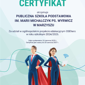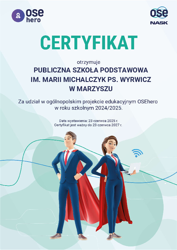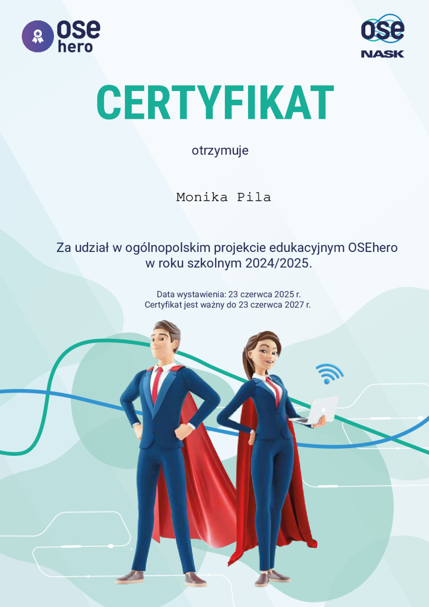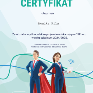 W ubiegłym roku szkolnym nasza szkoła brała udział w Ogólnopolskim Projekcie OSEhero, który skierowany był do szkół podłączonych do Ogólnopolskiej Sieci Edukacyjnej - OSE. Celem projektu było zwiększenie świadomości dotyczącej cyberzagrożeń wynikających z korzystania z internetu. W ramach projektu, na lekcjach informatyki, uczniowie uczyli się, jak reagować na niebezpieczne sytuacje w sieci, jak im zapobiegać oraz gdzie szukać pomocy w przypadku zagrożenia. Zorganizowano różne inicjatywy, mające na celu wsparcie pozytywnych zachowania online oraz rozwijanie kompetencji cyfrowych w procesie nauczania, w tym umiejętność krytycznego myślenia i refleksyjnego wykorzystywania zasobów znajdujących się w internecie. Inicjatywy skierowane były nie tylko do uczniów i nauczycieli, ale również do lokalnej społeczności. Wszystkie podjęte inicjatywy zostały zauważone i docenione przez organizatorów projektu, którzy przyznali naszej szkole Certyfikat OSEhero za działalność w roku szkolnym 2024/2025.