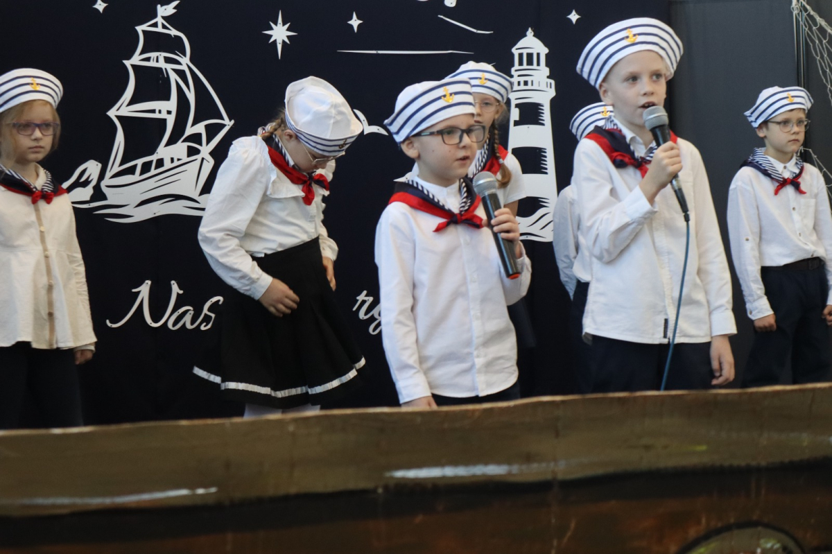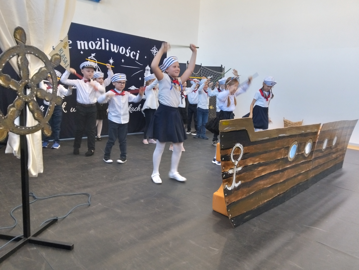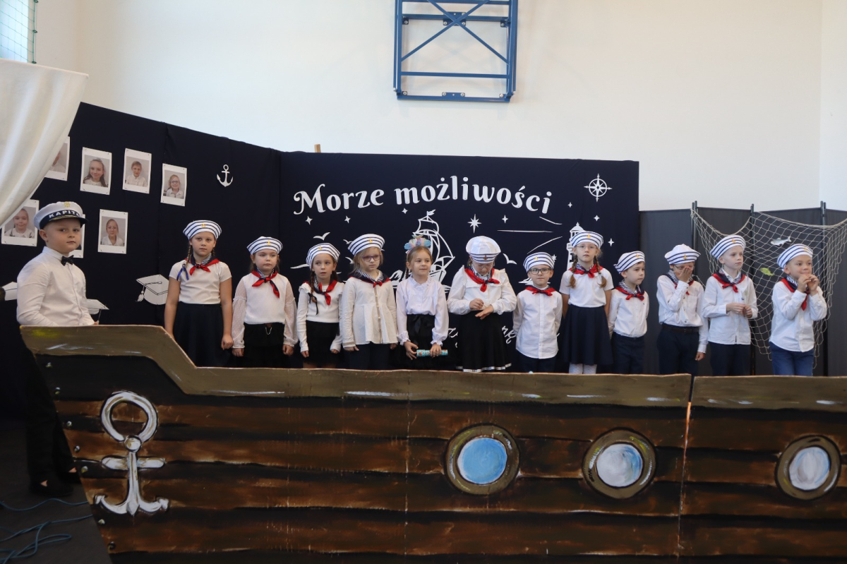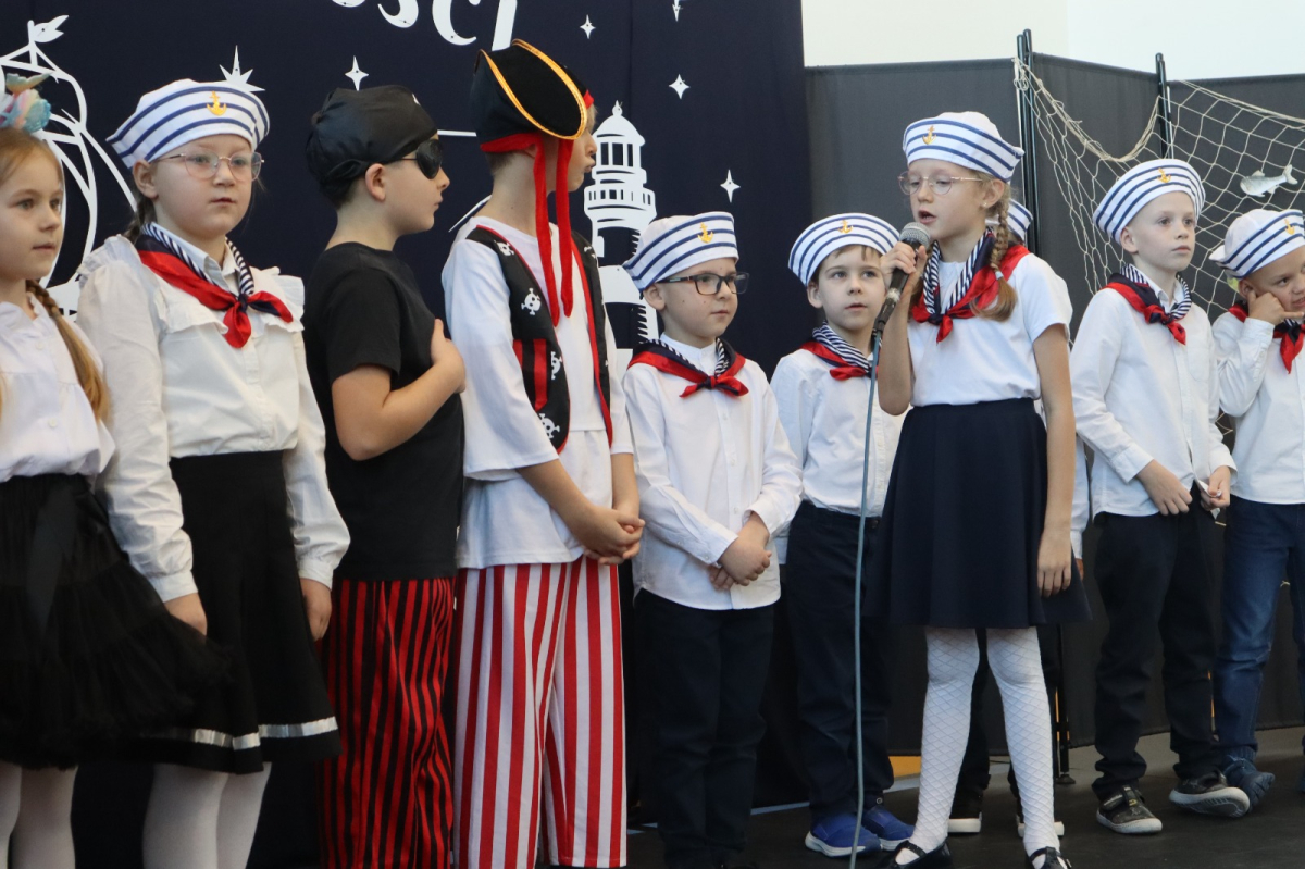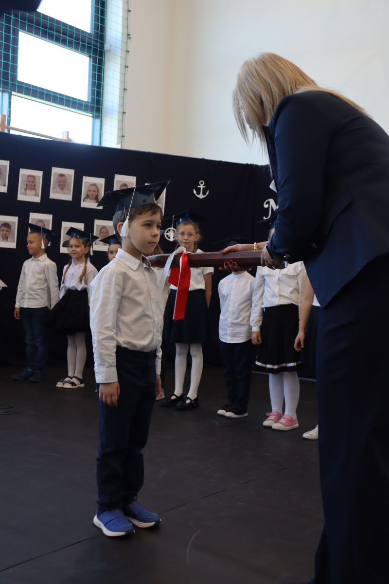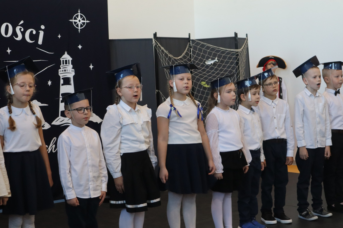 W dalszej części, uczniowie klasy pierwszej zaprezentowali program artystyczny w stylu marynistycznym, przygotowany pod kierunkiem wychowawczyni Pani Ilony Pokusy, w którym zaprezentowali swoje niezwykłe talenty wokalne, recytatorskie i taneczne. Po występach nastąpił najważniejszy moment – akt ślubowania, podczas którego 13-ścioro dzielnych i zdolnych uczniów, czego dowiedli w czasie występu, złożyło uroczystą przysięgę, zobowiązując się do sumiennego wypełniania obowiązków ucznia, dbania o dobre imię szkoły oraz bycia dobrym kolegą i koleżanką. Po złożeniu ślubowania przyszła pora na pasowanie, którego dokonała Pani Dyrektor, poprzez symbolicznie dotknięte ołówkiem. Na zakończenie Pierwszoklasiści otrzymali dyplomy i drobne upominki.