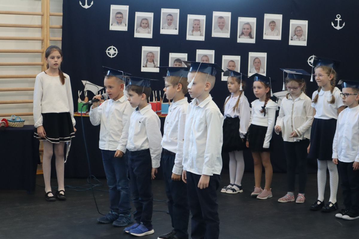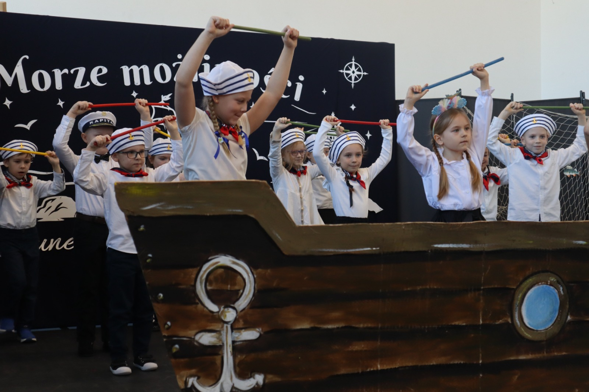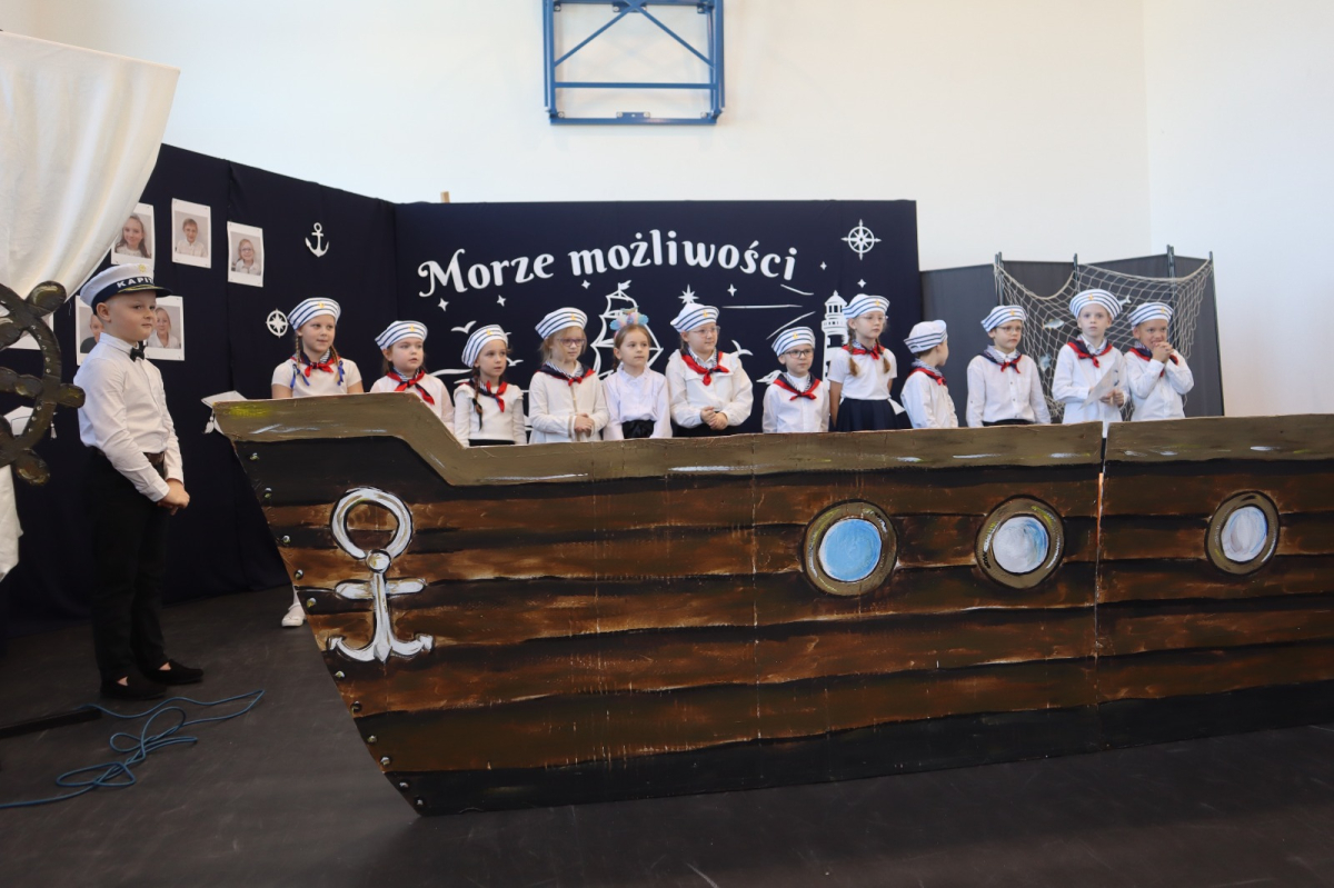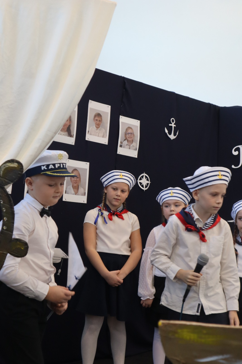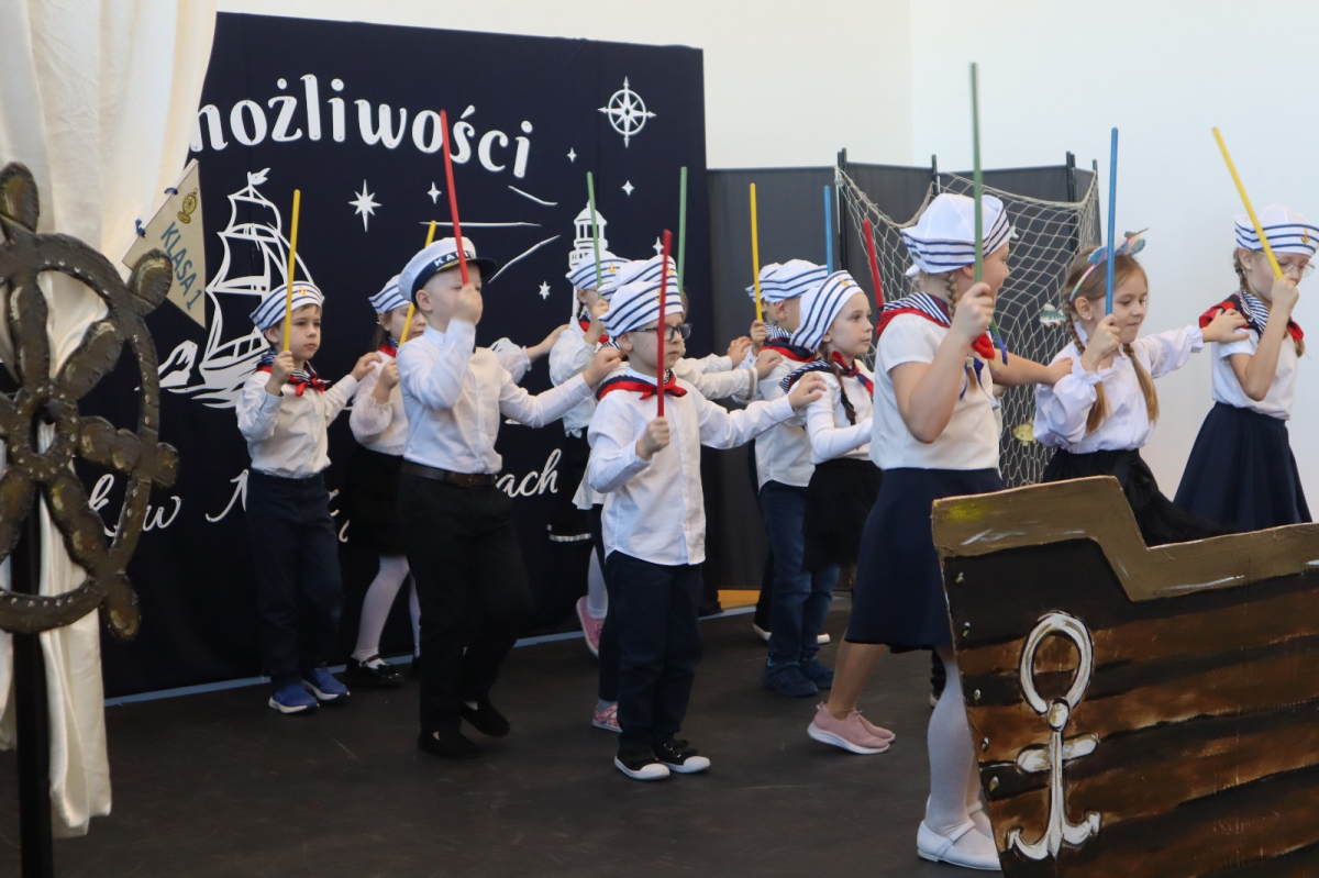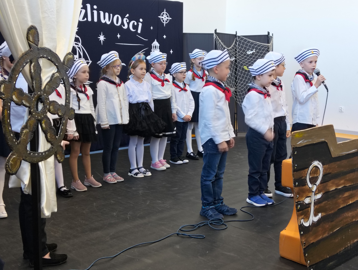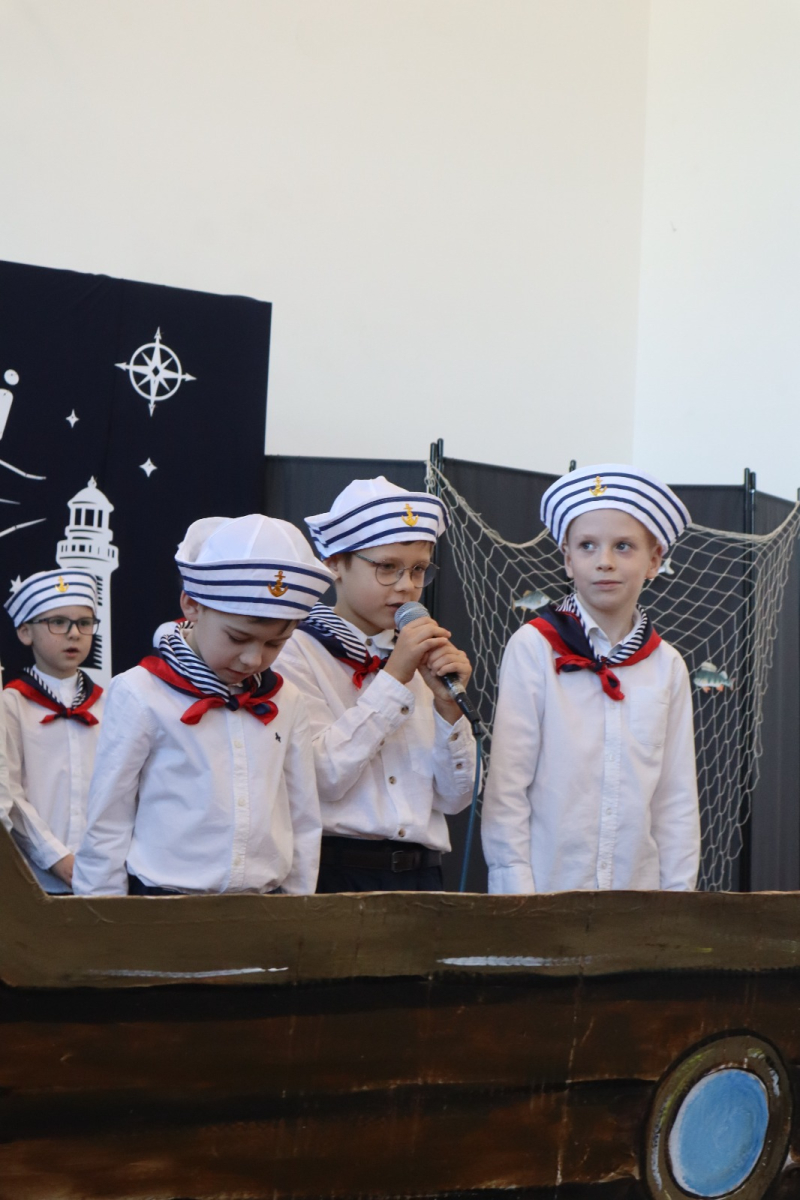 W dalszej części, uczniowie klasy pierwszej zaprezentowali program artystyczny w stylu marynistycznym, przygotowany pod kierunkiem wychowawczyni Pani Ilony Pokusy, w którym zaprezentowali swoje niezwykłe talenty wokalne, recytatorskie i taneczne. Po występach nastąpił najważniejszy moment – akt ślubowania, podczas którego 13-ścioro dzielnych i zdolnych uczniów, czego dowiedli w czasie występu, złożyło uroczystą przysięgę, zobowiązując się do sumiennego wypełniania obowiązków ucznia, dbania o dobre imię szkoły oraz bycia dobrym kolegą i koleżanką. Po złożeniu ślubowania przyszła pora na pasowanie, którego dokonała Pani Dyrektor, poprzez symbolicznie dotknięte ołówkiem. Na zakończenie Pierwszoklasiści otrzymali dyplomy i drobne upominki.
