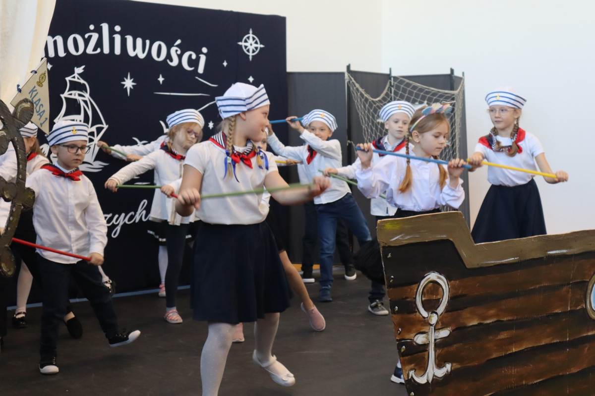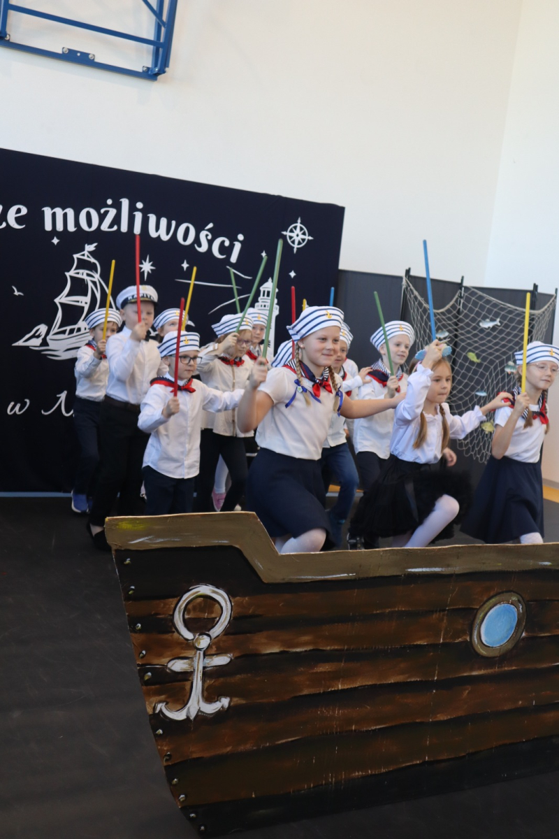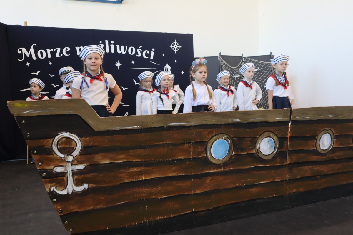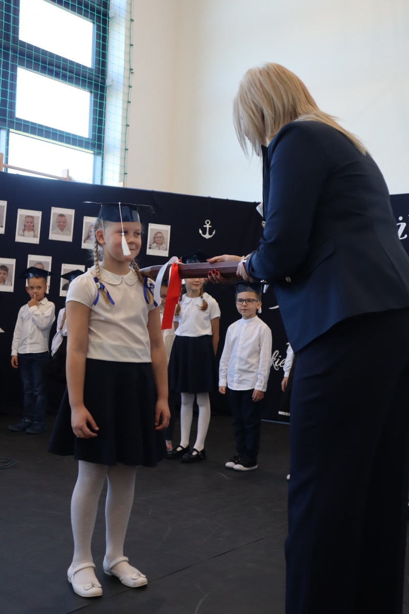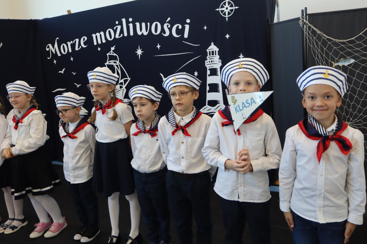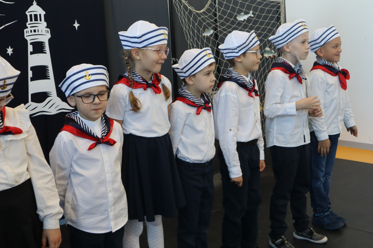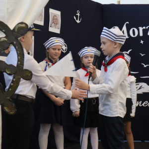 W dalszej części, uczniowie klasy pierwszej zaprezentowali program artystyczny w stylu marynistycznym, przygotowany pod kierunkiem wychowawczyni Pani Ilony Pokusy, w którym zaprezentowali swoje niezwykłe talenty wokalne, recytatorskie i taneczne. Po występach nastąpił najważniejszy moment – akt ślubowania, podczas którego 13-ścioro dzielnych i zdolnych uczniów, czego dowiedli w czasie występu, złożyło uroczystą przysięgę, zobowiązując się do sumiennego wypełniania obowiązków ucznia, dbania o dobre imię szkoły oraz bycia dobrym kolegą i koleżanką. Po złożeniu ślubowania przyszła pora na pasowanie, którego dokonała Pani Dyrektor, poprzez symbolicznie dotknięte ołówkiem. Na zakończenie Pierwszoklasiści otrzymali dyplomy i drobne upominki.