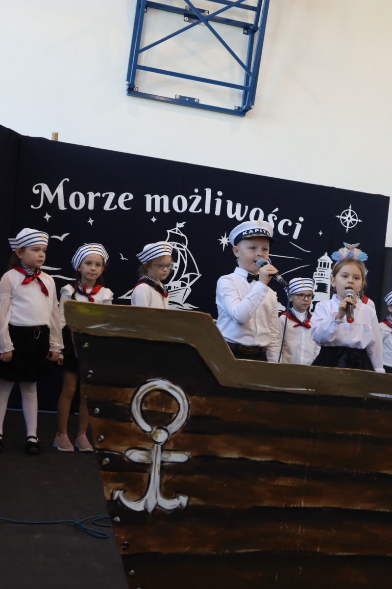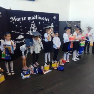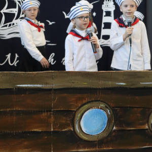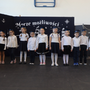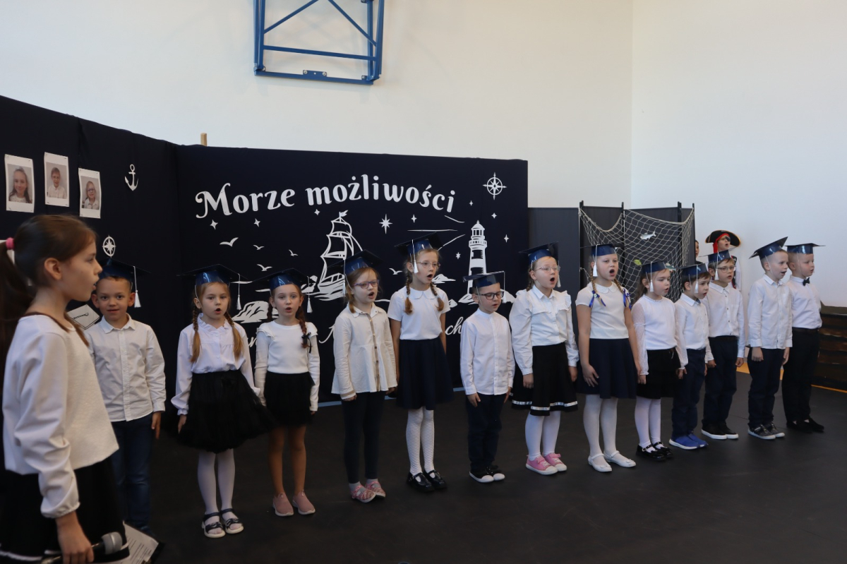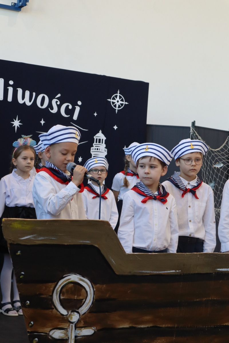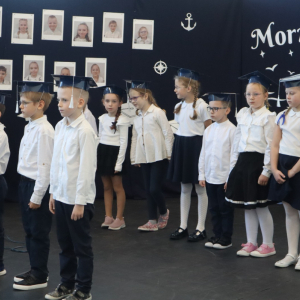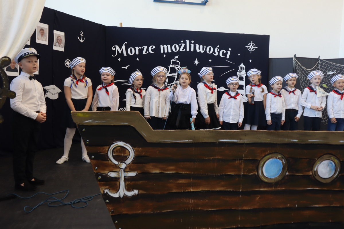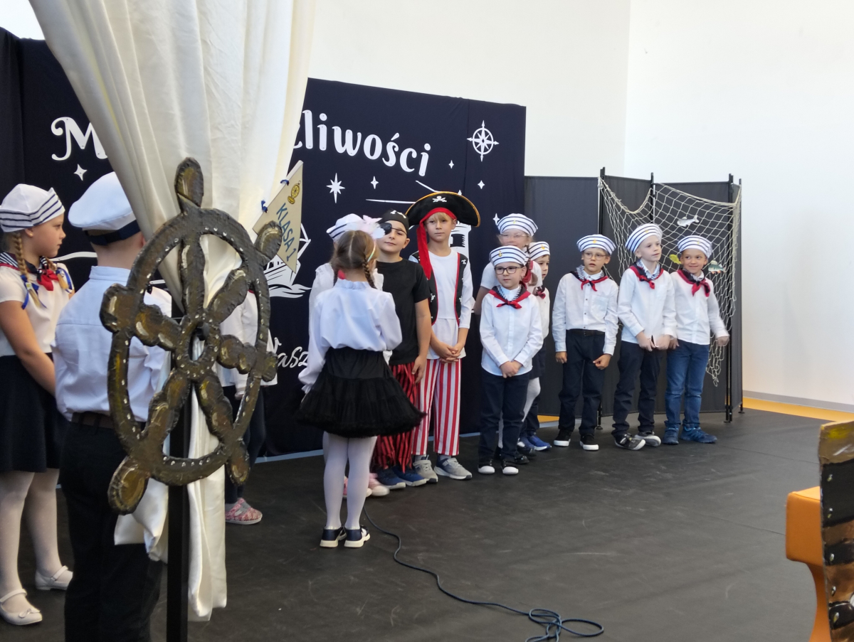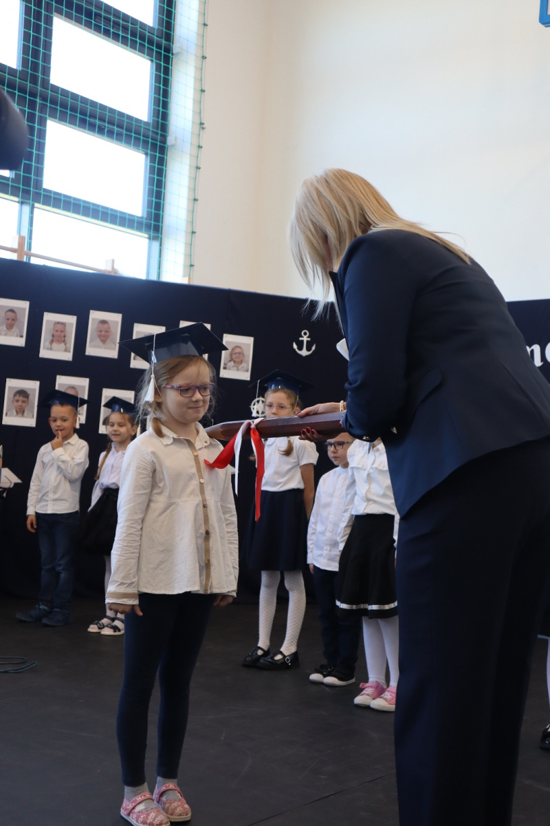 W dalszej części, uczniowie klasy pierwszej zaprezentowali program artystyczny w stylu marynistycznym, przygotowany pod kierunkiem wychowawczyni Pani Ilony Pokusy, w którym zaprezentowali swoje niezwykłe talenty wokalne, recytatorskie i taneczne. Po występach nastąpił najważniejszy moment – akt ślubowania, podczas którego 13-ścioro dzielnych i zdolnych uczniów, czego dowiedli w czasie występu, złożyło uroczystą przysięgę, zobowiązując się do sumiennego wypełniania obowiązków ucznia, dbania o dobre imię szkoły oraz bycia dobrym kolegą i koleżanką. Po złożeniu ślubowania przyszła pora na pasowanie, którego dokonała Pani Dyrektor, poprzez symbolicznie dotknięte ołówkiem. Na zakończenie Pierwszoklasiści otrzymali dyplomy i drobne upominki.