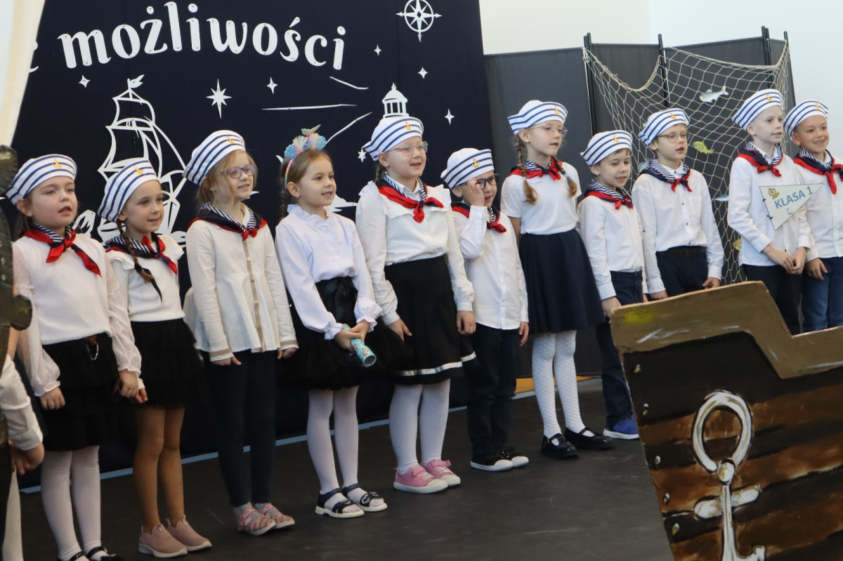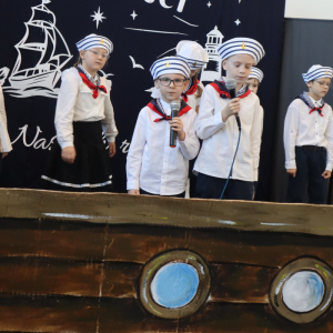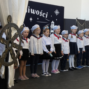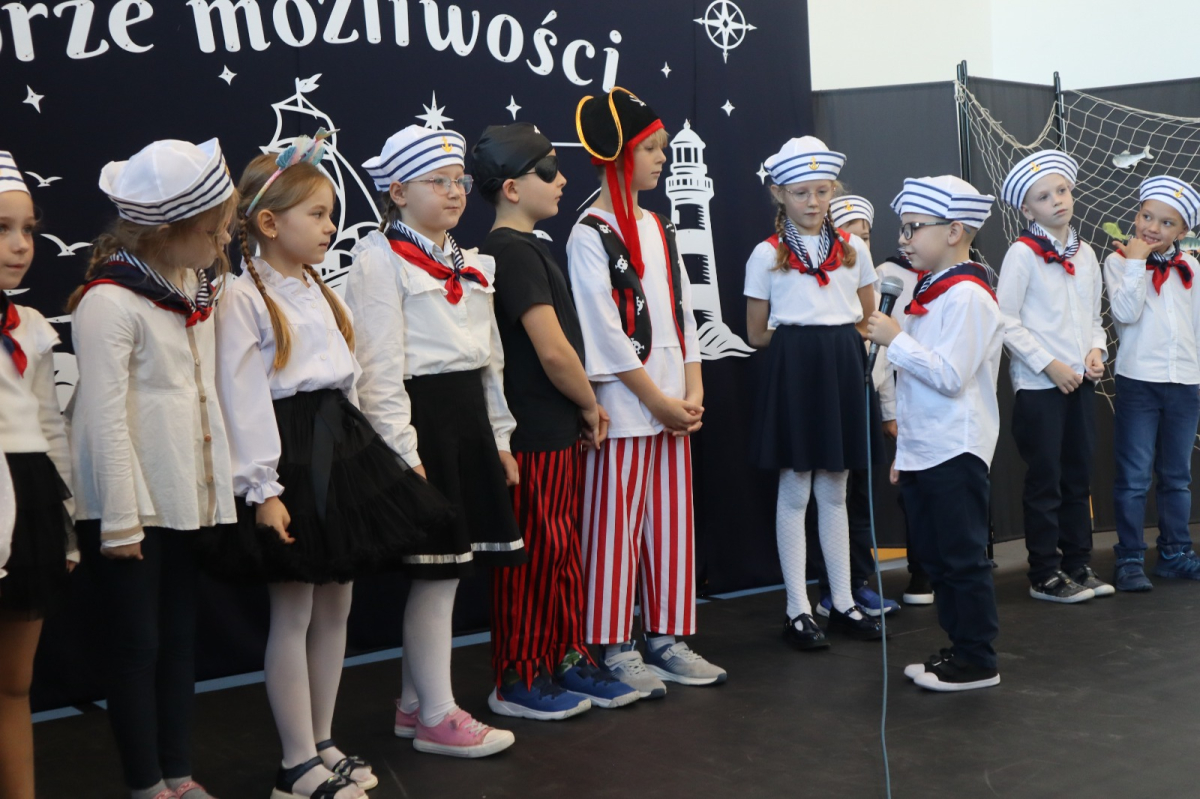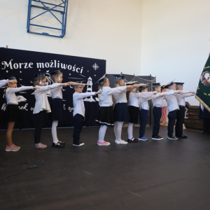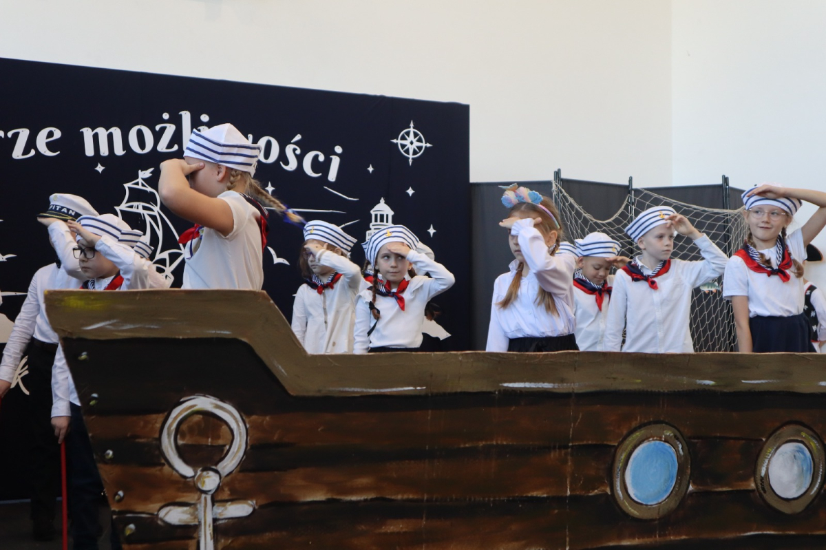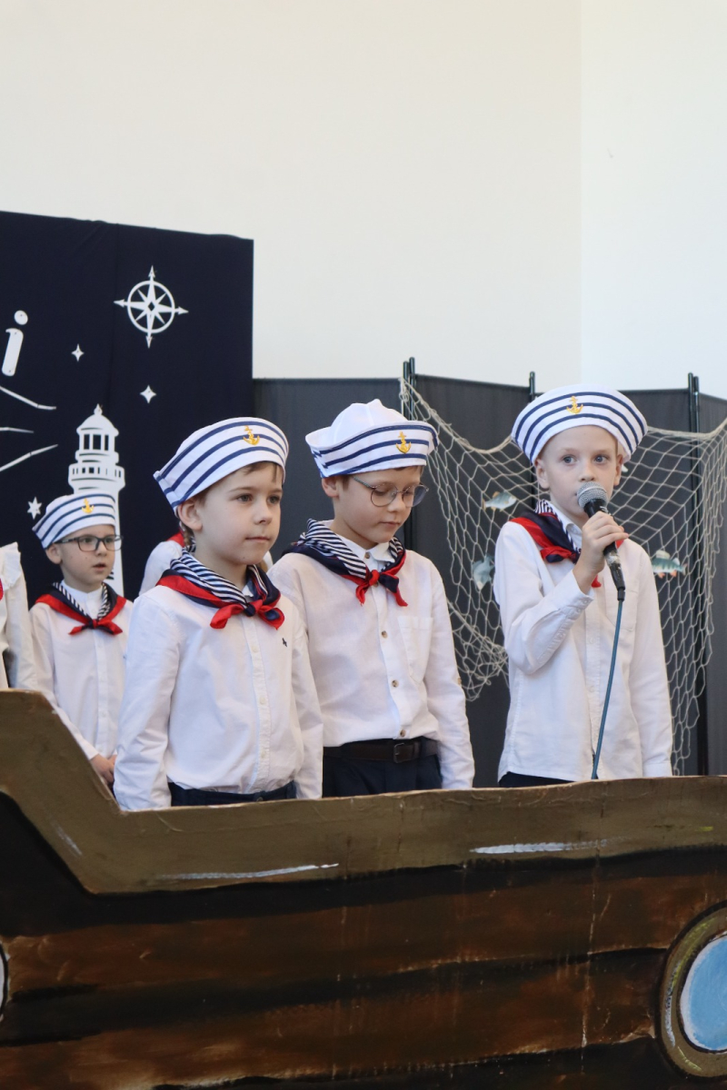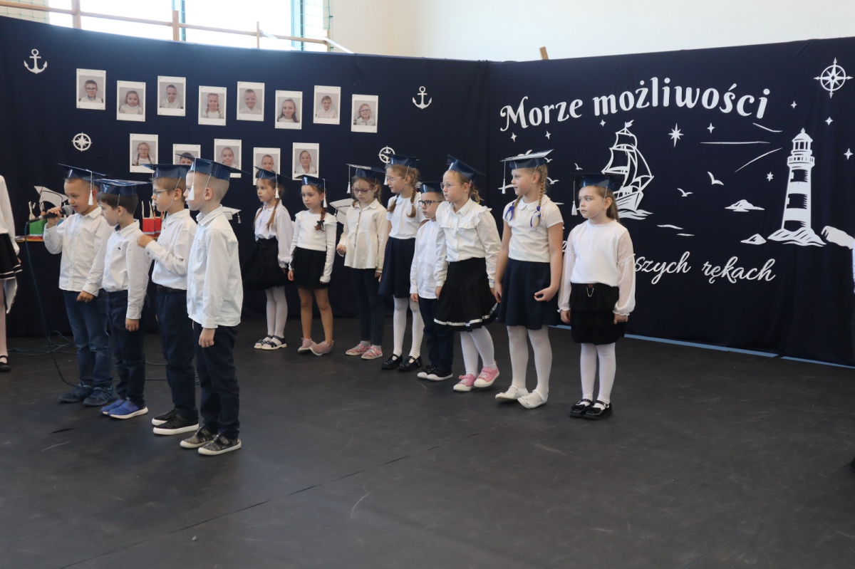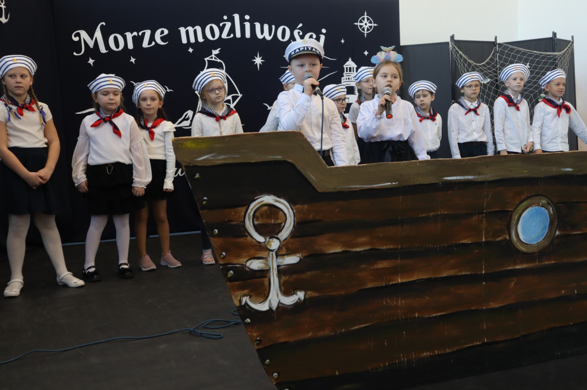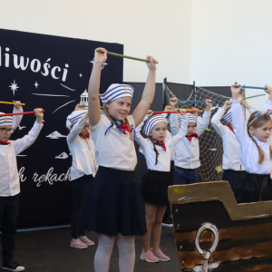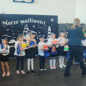 W dalszej części, uczniowie klasy pierwszej zaprezentowali program artystyczny w stylu marynistycznym, przygotowany pod kierunkiem wychowawczyni Pani Ilony Pokusy, w którym zaprezentowali swoje niezwykłe talenty wokalne, recytatorskie i taneczne. Po występach nastąpił najważniejszy moment – akt ślubowania, podczas którego 13-ścioro dzielnych i zdolnych uczniów, czego dowiedli w czasie występu, złożyło uroczystą przysięgę, zobowiązując się do sumiennego wypełniania obowiązków ucznia, dbania o dobre imię szkoły oraz bycia dobrym kolegą i koleżanką. Po złożeniu ślubowania przyszła pora na pasowanie, którego dokonała Pani Dyrektor, poprzez symbolicznie dotknięte ołówkiem. Na zakończenie Pierwszoklasiści otrzymali dyplomy i drobne upominki.