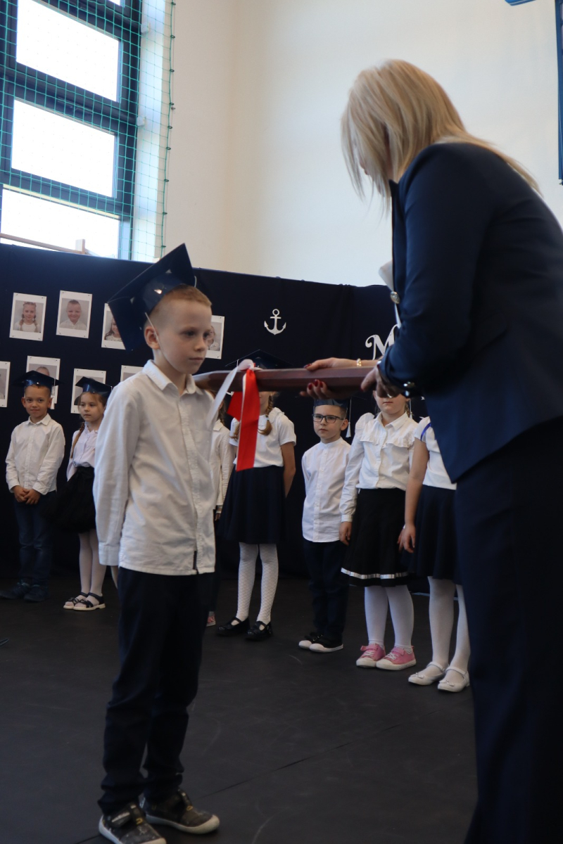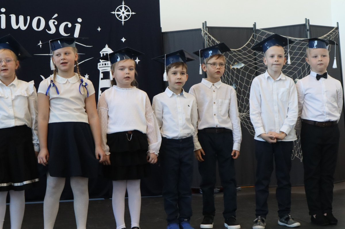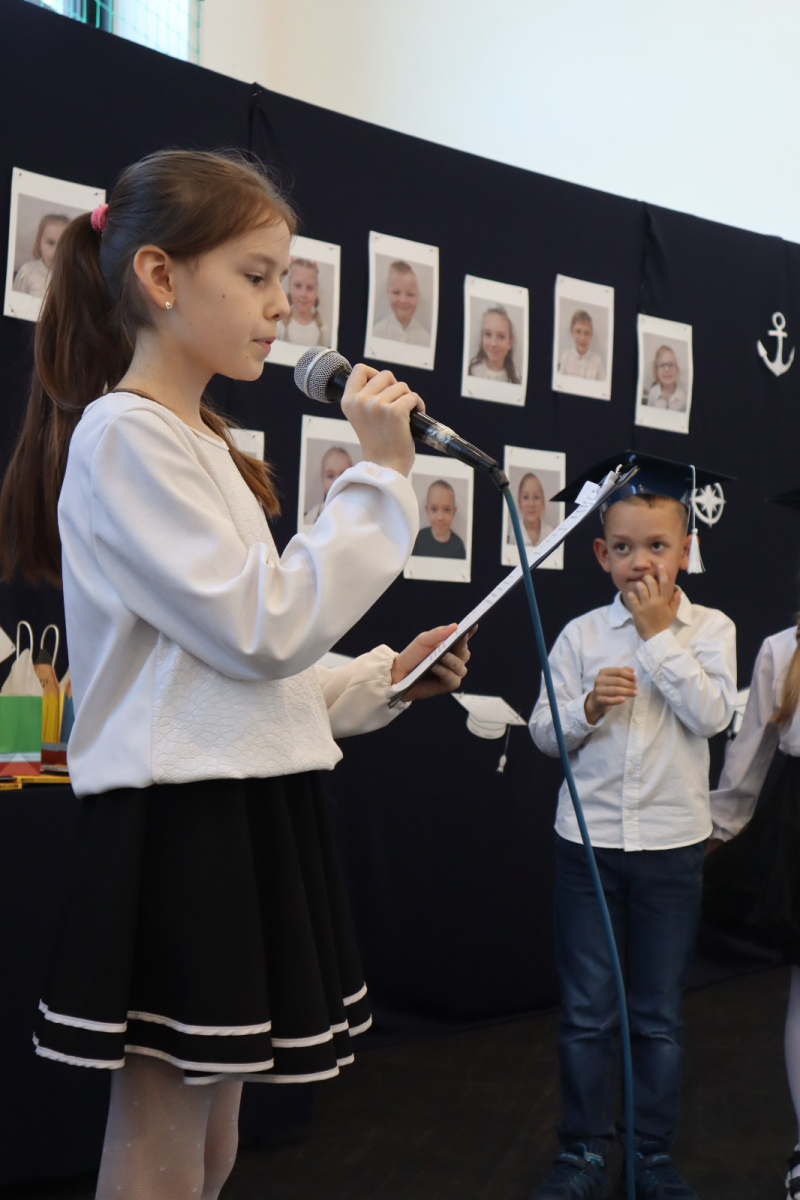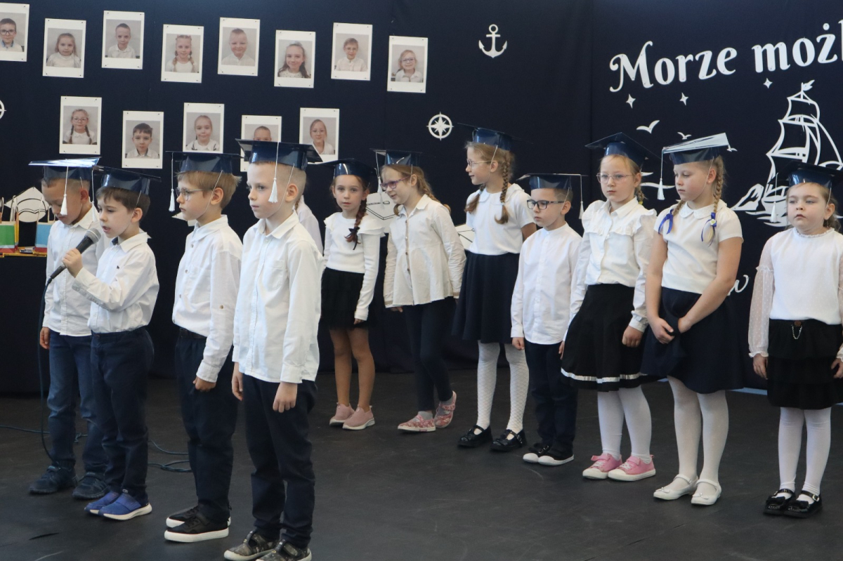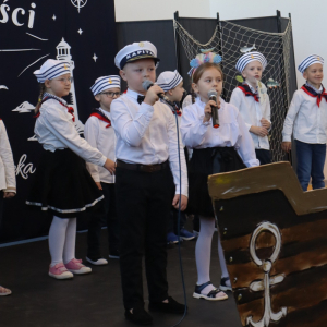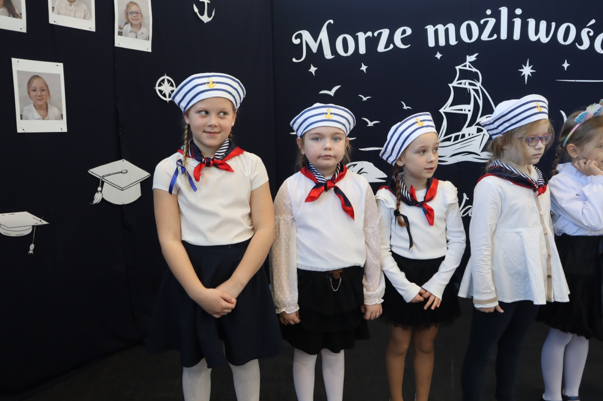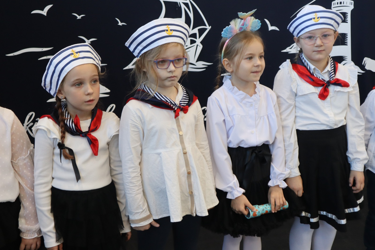 W dalszej części, uczniowie klasy pierwszej zaprezentowali program artystyczny w stylu marynistycznym, przygotowany pod kierunkiem wychowawczyni Pani Ilony Pokusy, w którym zaprezentowali swoje niezwykłe talenty wokalne, recytatorskie i taneczne. Po występach nastąpił najważniejszy moment – akt ślubowania, podczas którego 13-ścioro dzielnych i zdolnych uczniów, czego dowiedli w czasie występu, złożyło uroczystą przysięgę, zobowiązując się do sumiennego wypełniania obowiązków ucznia, dbania o dobre imię szkoły oraz bycia dobrym kolegą i koleżanką. Po złożeniu ślubowania przyszła pora na pasowanie, którego dokonała Pani Dyrektor, poprzez symbolicznie dotknięte ołówkiem. Na zakończenie Pierwszoklasiści otrzymali dyplomy i drobne upominki.
