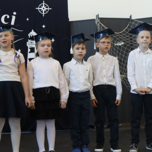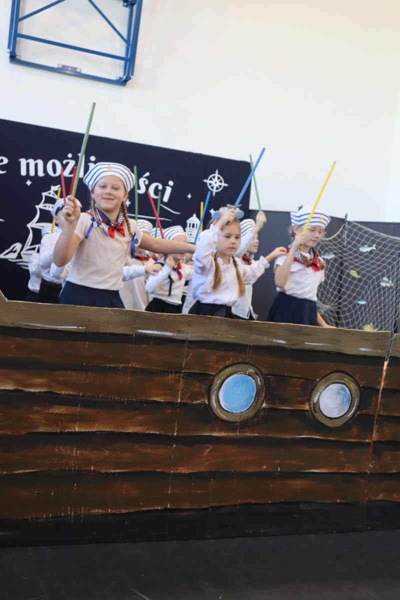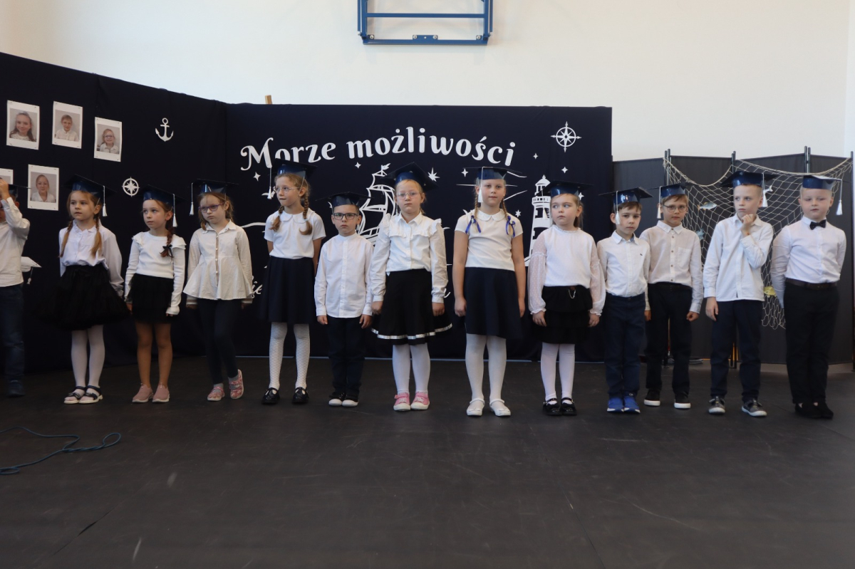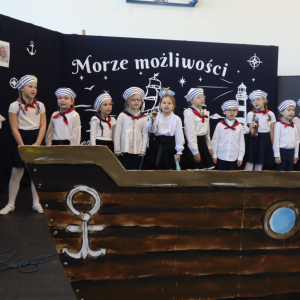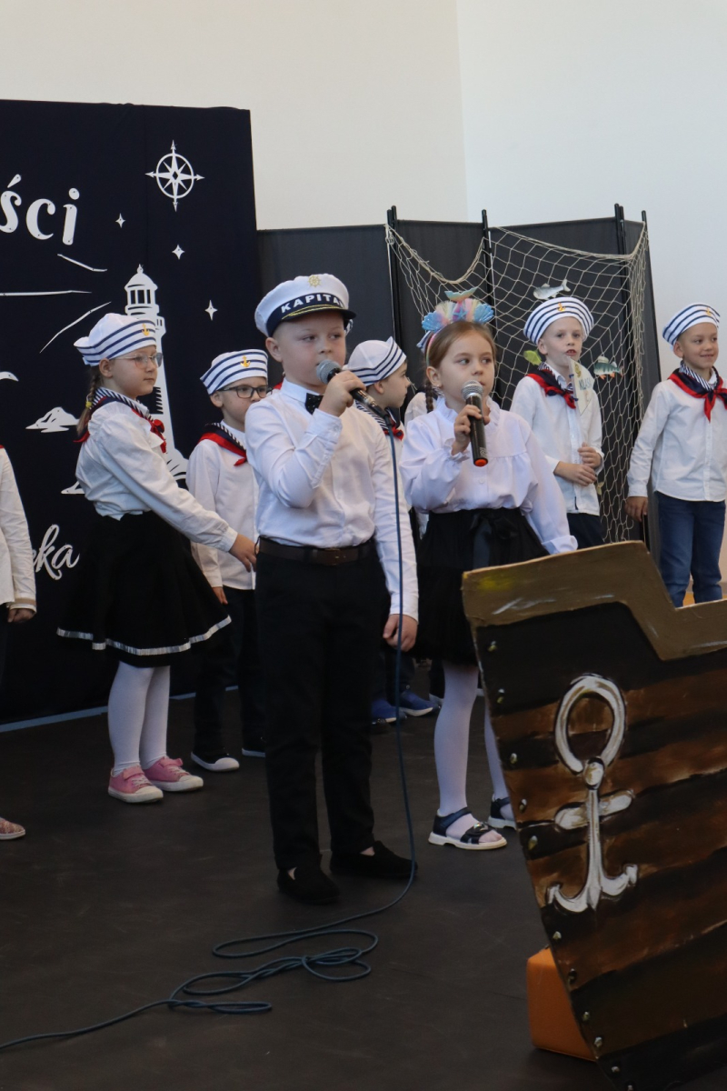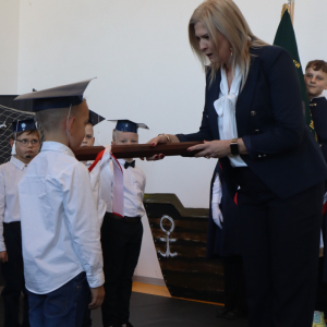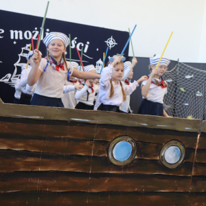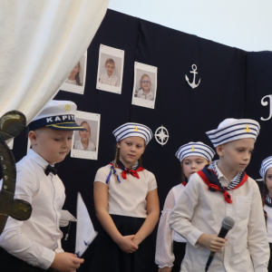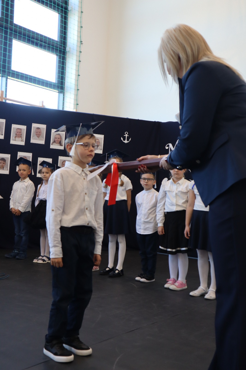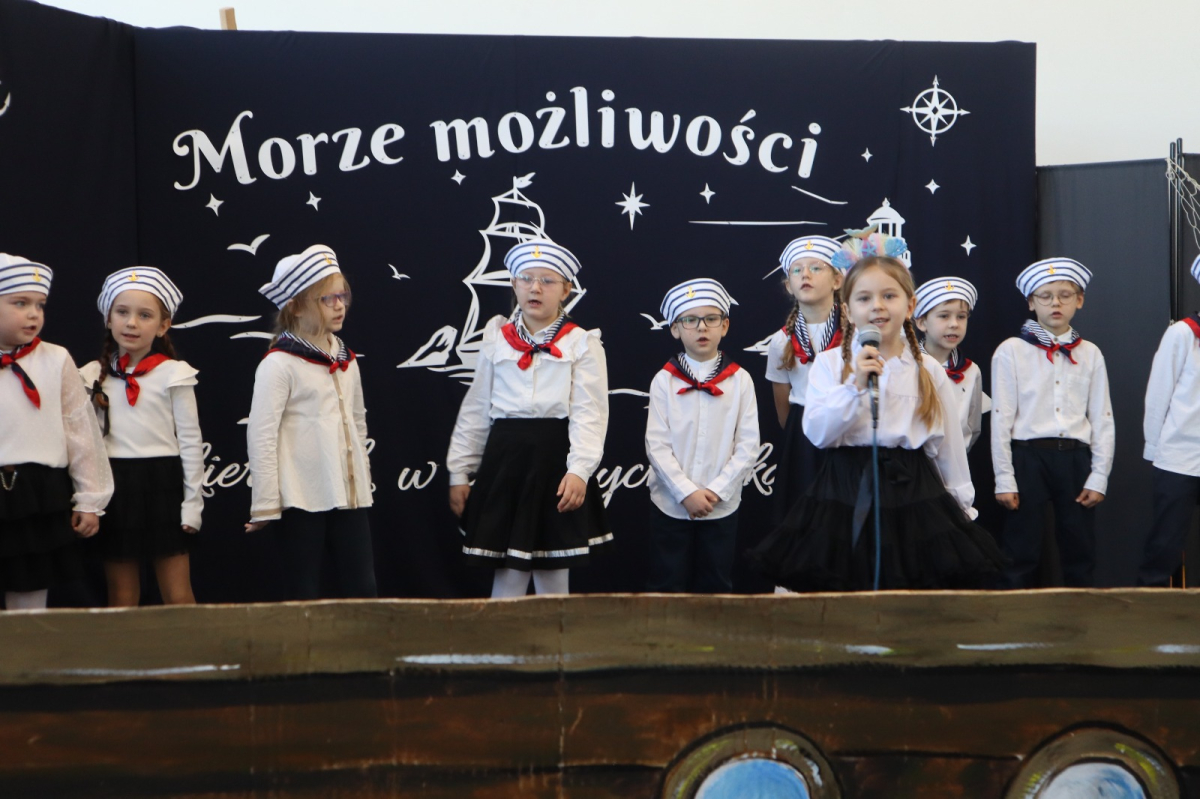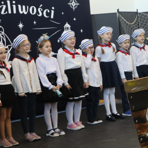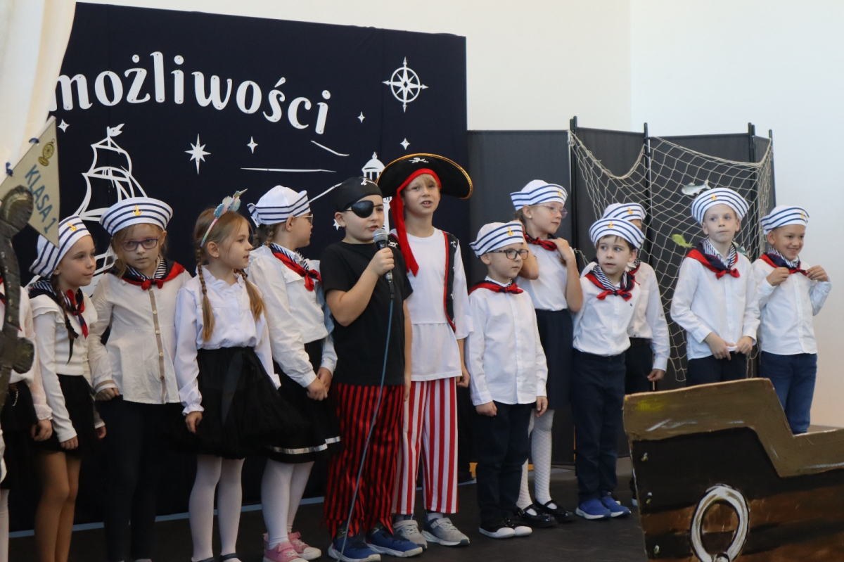 W dalszej części, uczniowie klasy pierwszej zaprezentowali program artystyczny w stylu marynistycznym, przygotowany pod kierunkiem wychowawczyni Pani Ilony Pokusy, w którym zaprezentowali swoje niezwykłe talenty wokalne, recytatorskie i taneczne. Po występach nastąpił najważniejszy moment – akt ślubowania, podczas którego 13-ścioro dzielnych i zdolnych uczniów, czego dowiedli w czasie występu, złożyło uroczystą przysięgę, zobowiązując się do sumiennego wypełniania obowiązków ucznia, dbania o dobre imię szkoły oraz bycia dobrym kolegą i koleżanką. Po złożeniu ślubowania przyszła pora na pasowanie, którego dokonała Pani Dyrektor, poprzez symbolicznie dotknięte ołówkiem. Na zakończenie Pierwszoklasiści otrzymali dyplomy i drobne upominki.
