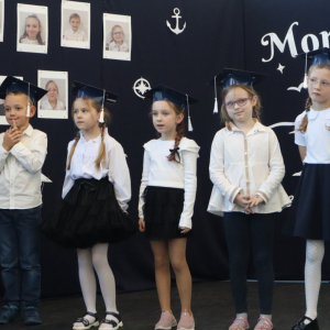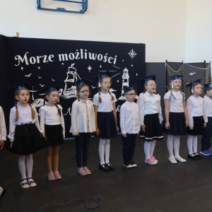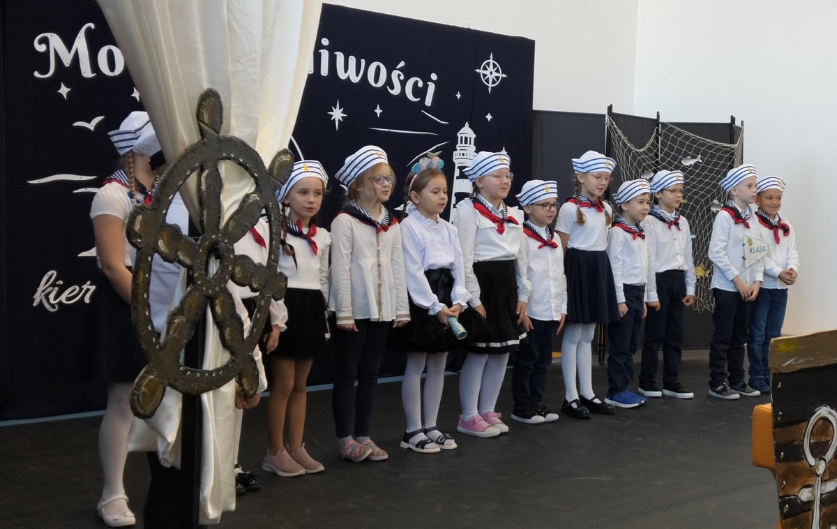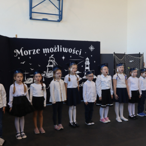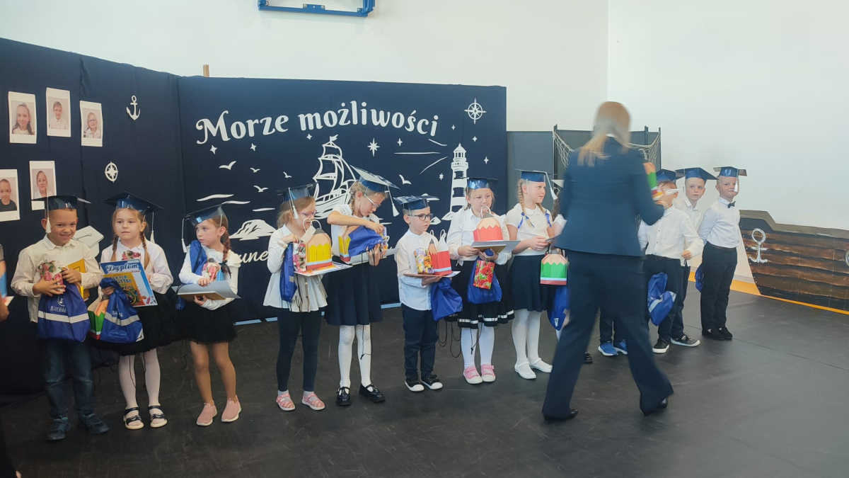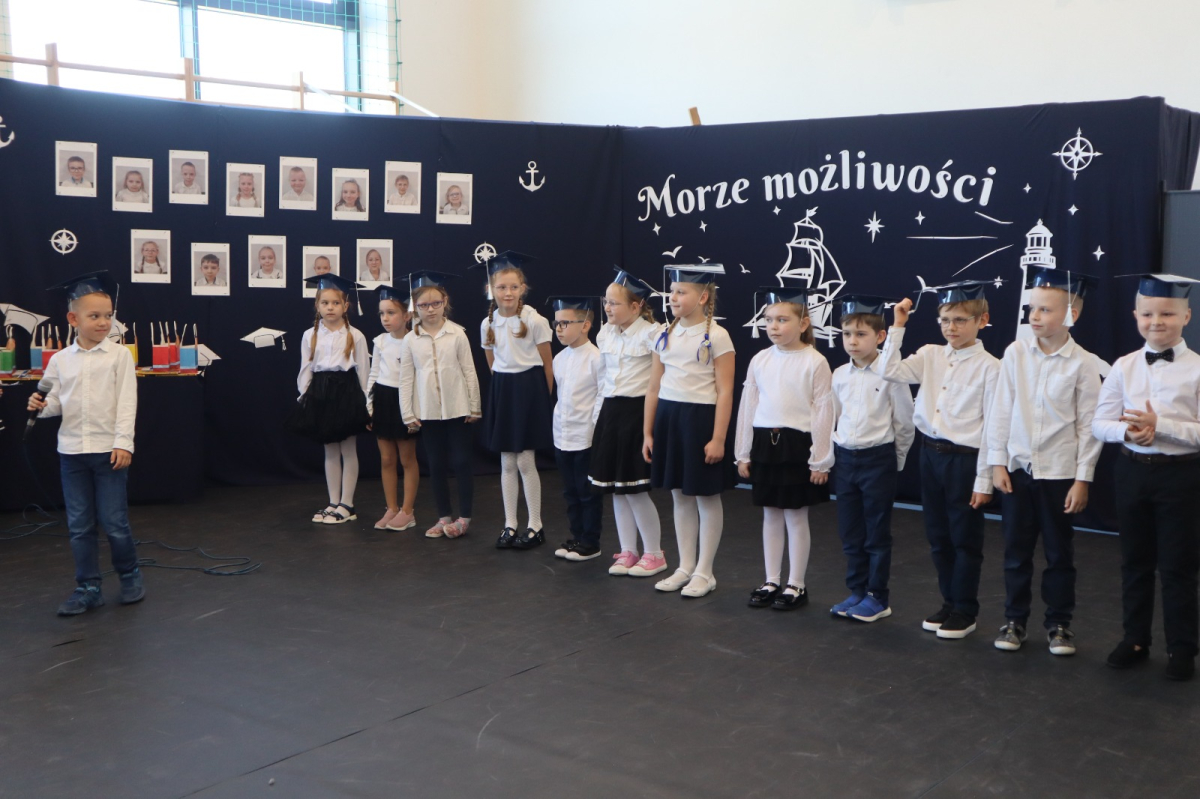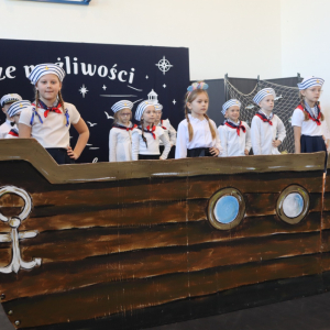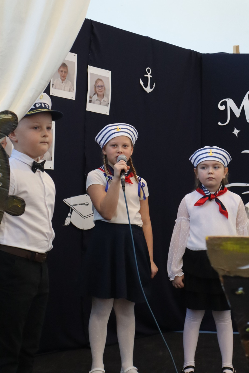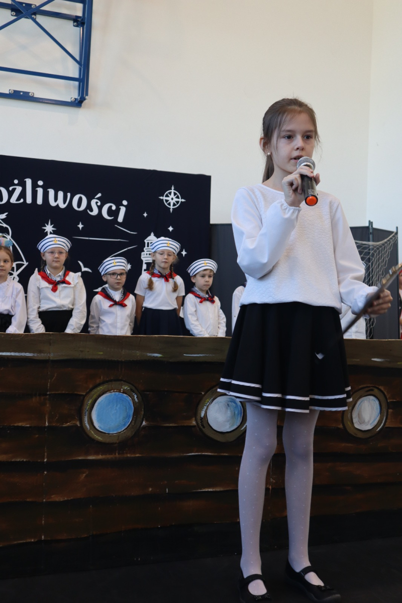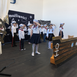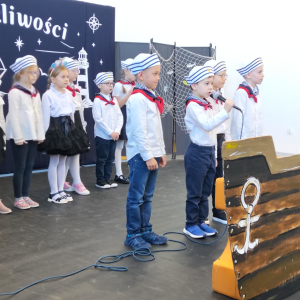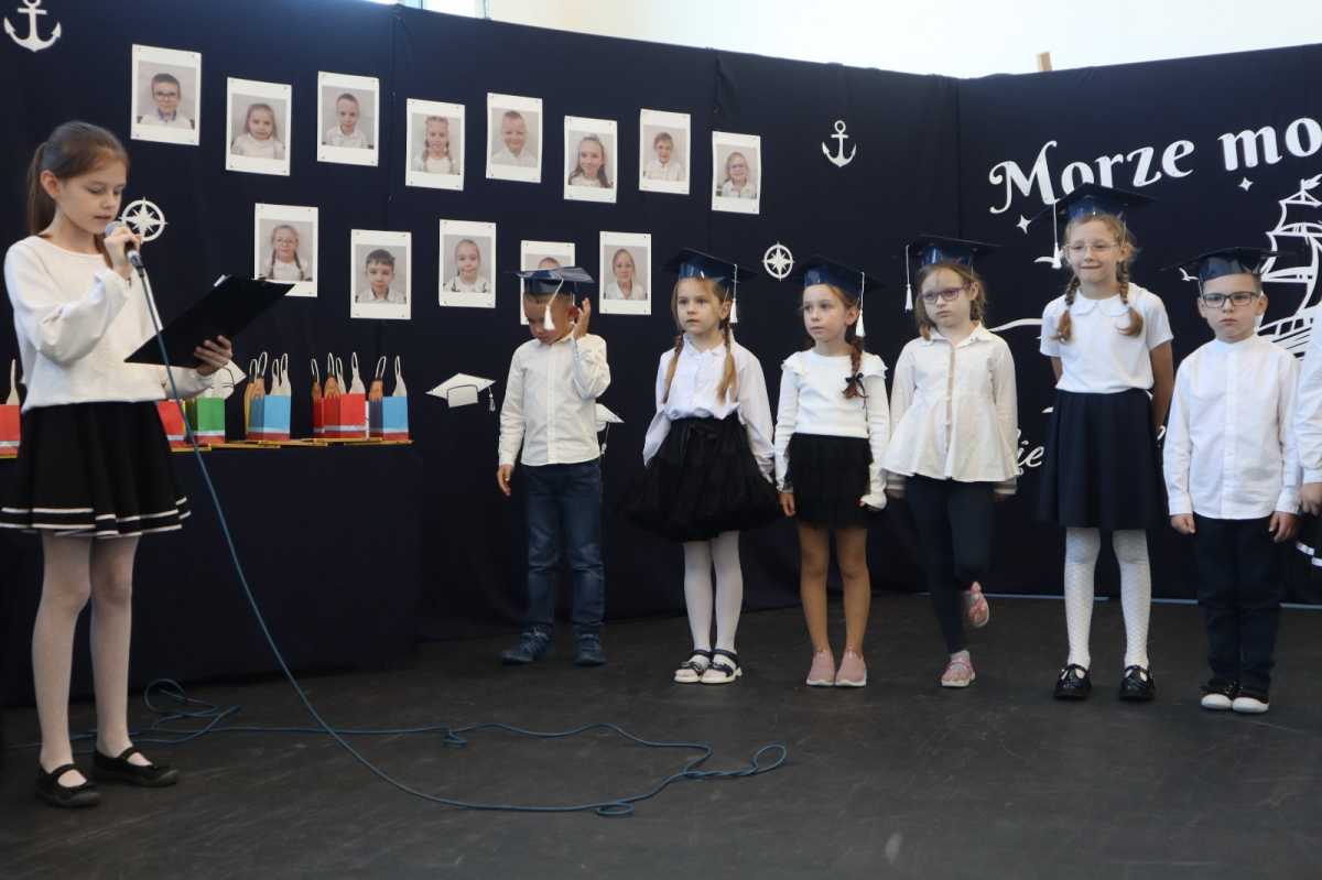 W dalszej części, uczniowie klasy pierwszej zaprezentowali program artystyczny w stylu marynistycznym, przygotowany pod kierunkiem wychowawczyni Pani Ilony Pokusy, w którym zaprezentowali swoje niezwykłe talenty wokalne, recytatorskie i taneczne. Po występach nastąpił najważniejszy moment – akt ślubowania, podczas którego 13-ścioro dzielnych i zdolnych uczniów, czego dowiedli w czasie występu, złożyło uroczystą przysięgę, zobowiązując się do sumiennego wypełniania obowiązków ucznia, dbania o dobre imię szkoły oraz bycia dobrym kolegą i koleżanką. Po złożeniu ślubowania przyszła pora na pasowanie, którego dokonała Pani Dyrektor, poprzez symbolicznie dotknięte ołówkiem. Na zakończenie Pierwszoklasiści otrzymali dyplomy i drobne upominki.