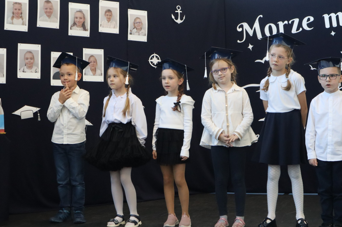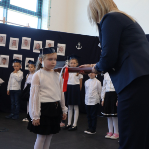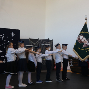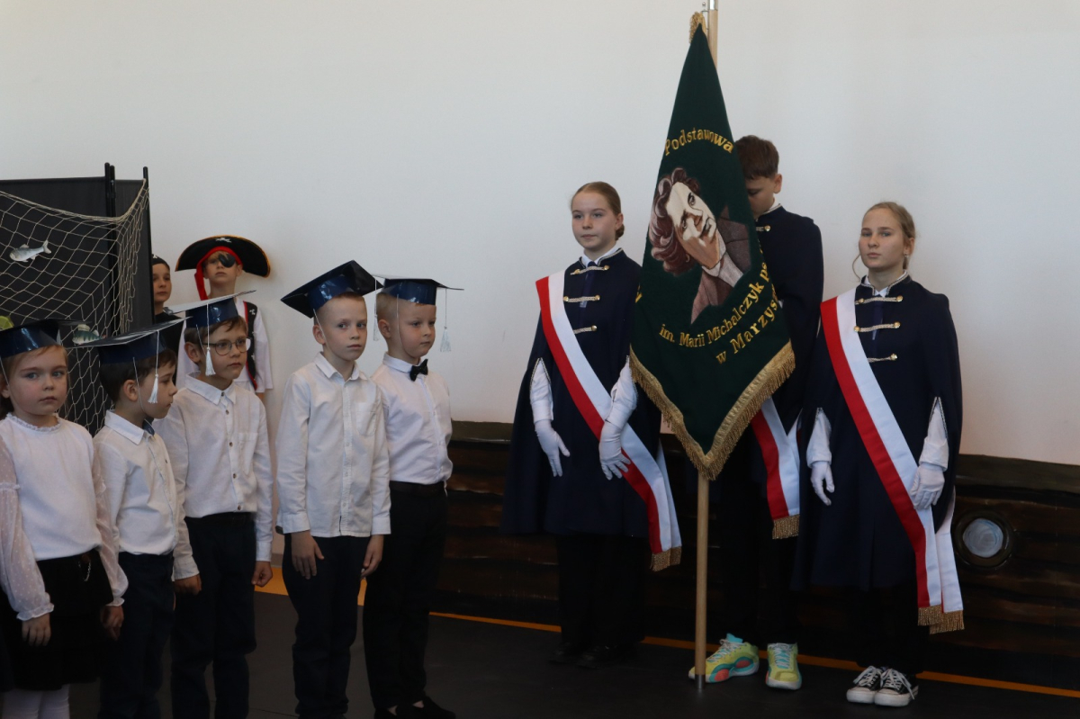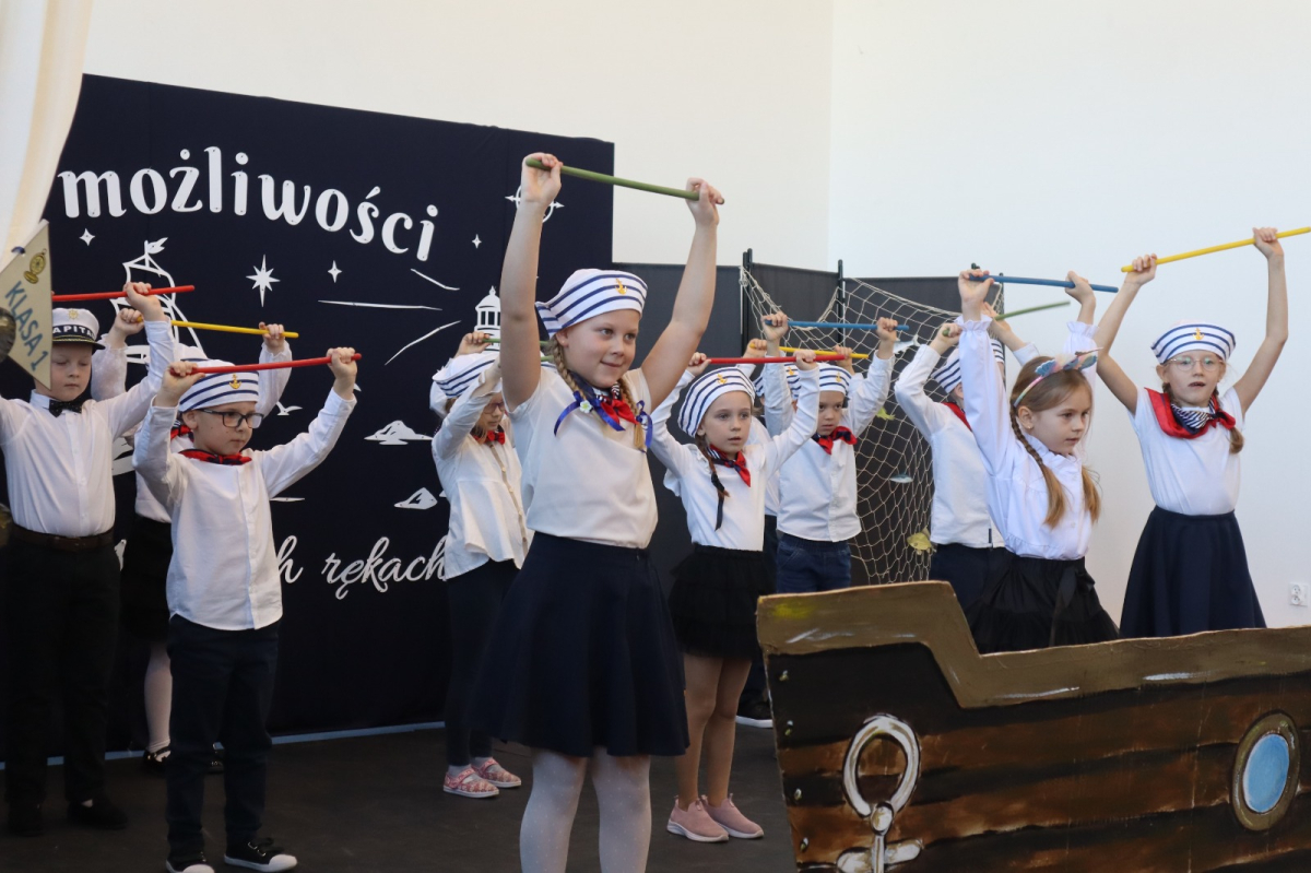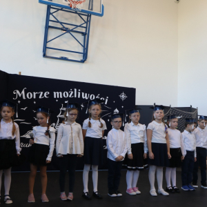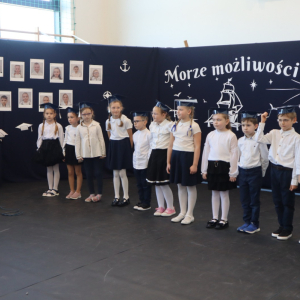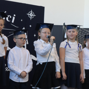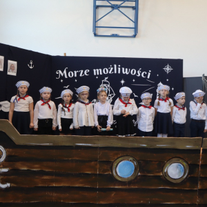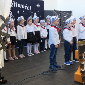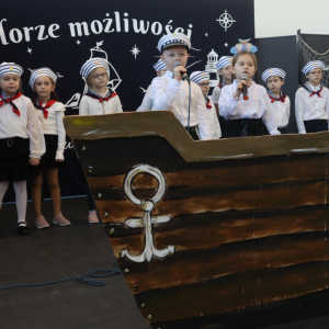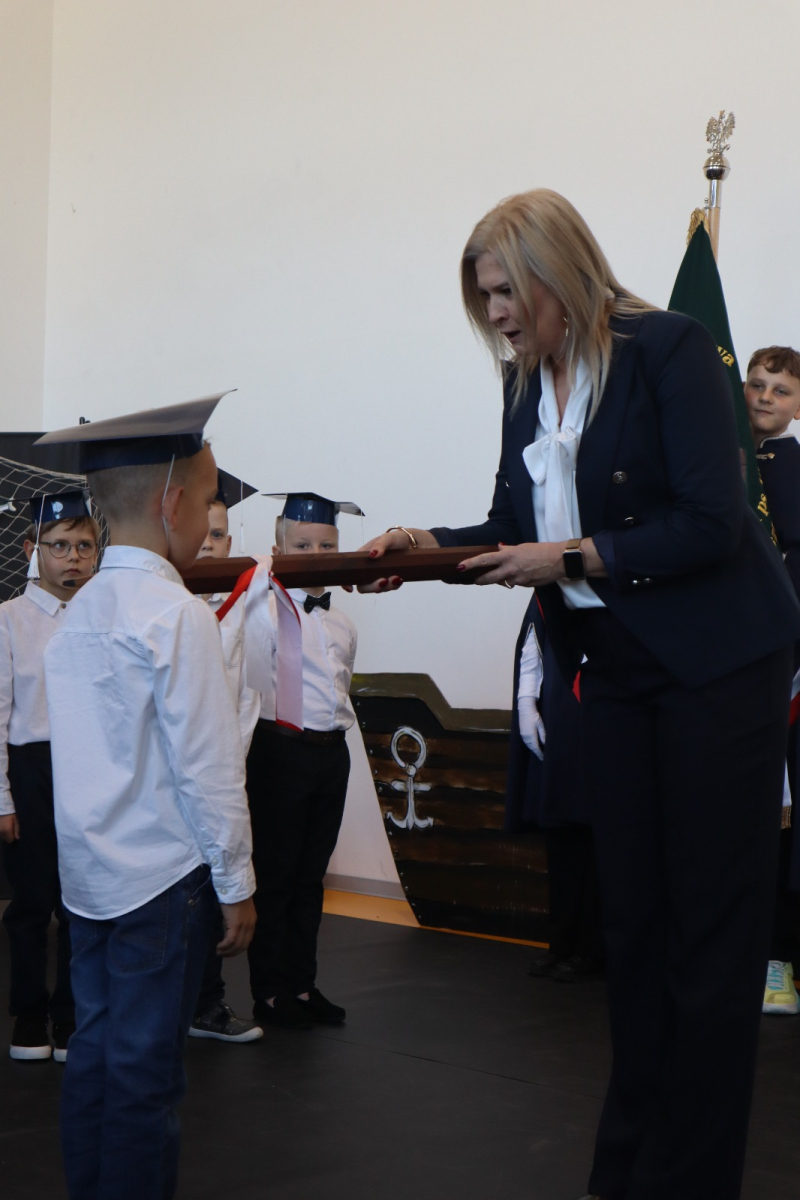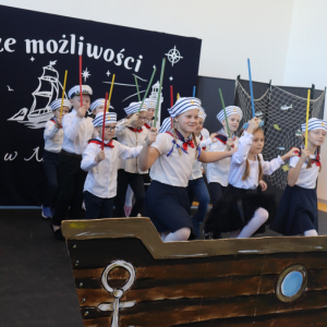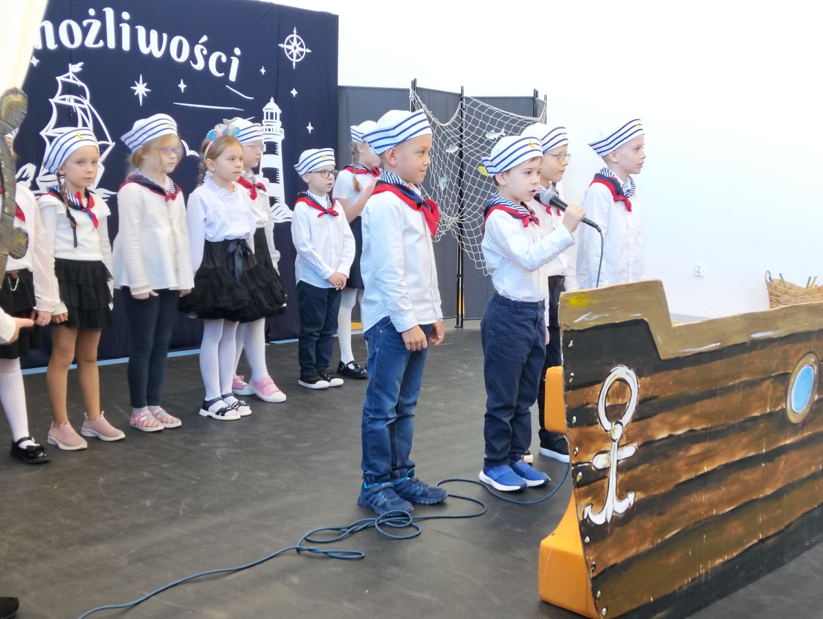 W dalszej części, uczniowie klasy pierwszej zaprezentowali program artystyczny w stylu marynistycznym, przygotowany pod kierunkiem wychowawczyni Pani Ilony Pokusy, w którym zaprezentowali swoje niezwykłe talenty wokalne, recytatorskie i taneczne. Po występach nastąpił najważniejszy moment – akt ślubowania, podczas którego 13-ścioro dzielnych i zdolnych uczniów, czego dowiedli w czasie występu, złożyło uroczystą przysięgę, zobowiązując się do sumiennego wypełniania obowiązków ucznia, dbania o dobre imię szkoły oraz bycia dobrym kolegą i koleżanką. Po złożeniu ślubowania przyszła pora na pasowanie, którego dokonała Pani Dyrektor, poprzez symbolicznie dotknięte ołówkiem. Na zakończenie Pierwszoklasiści otrzymali dyplomy i drobne upominki.