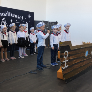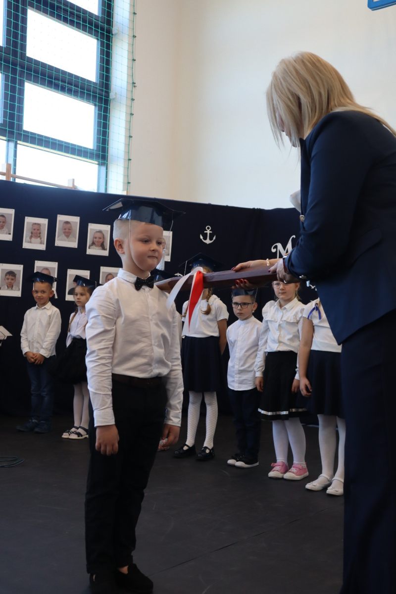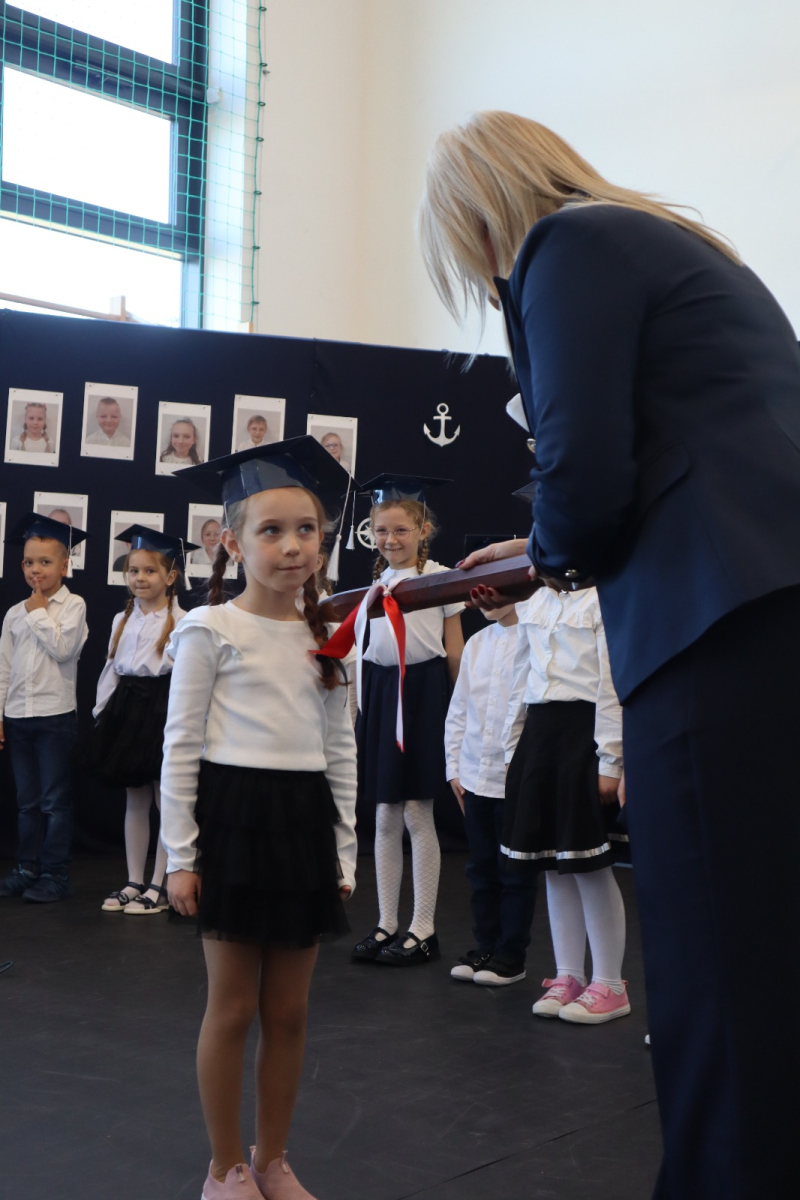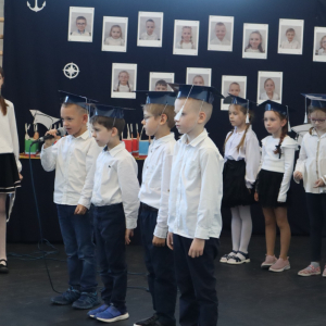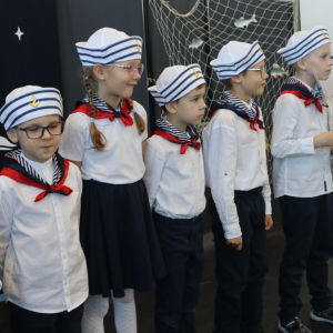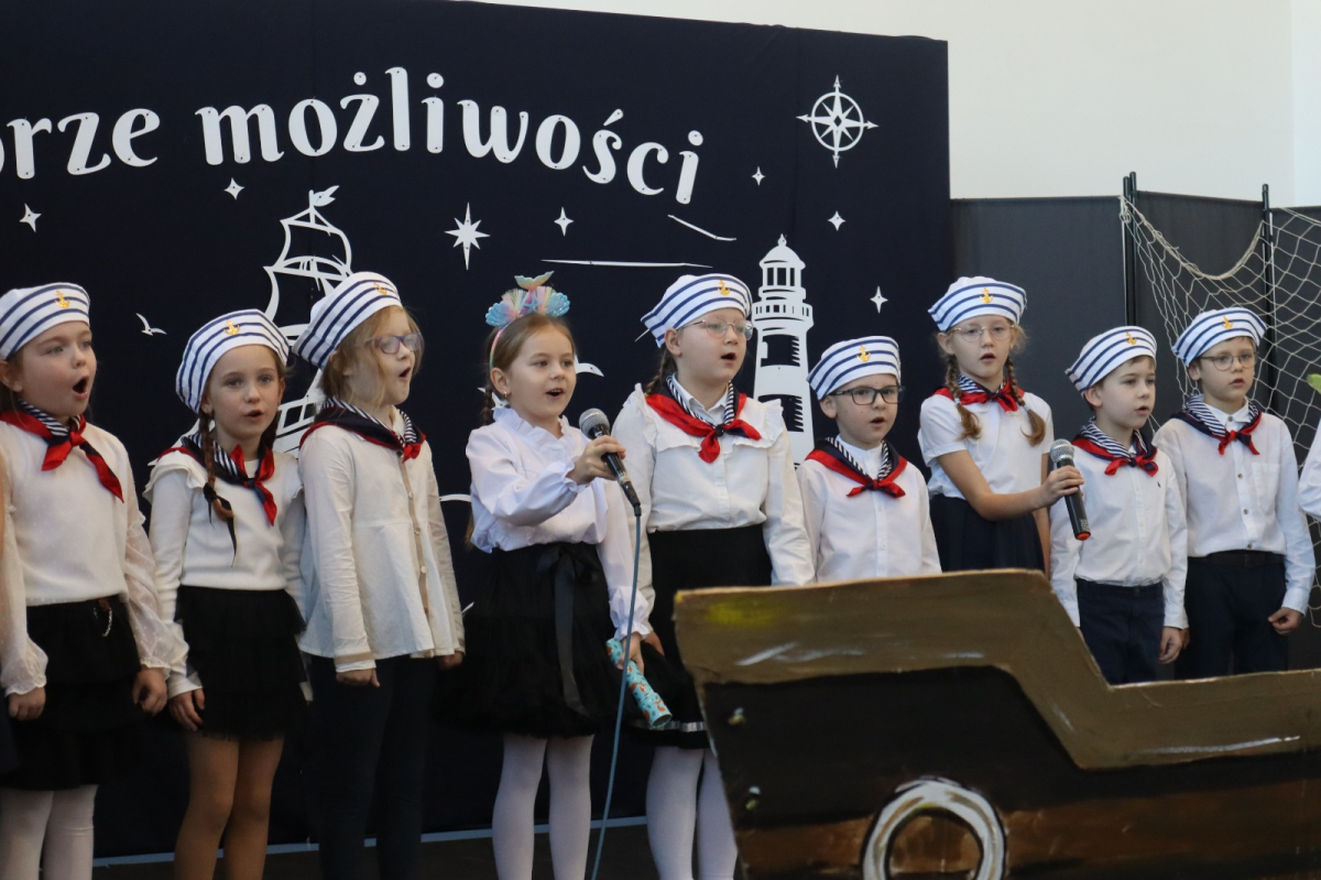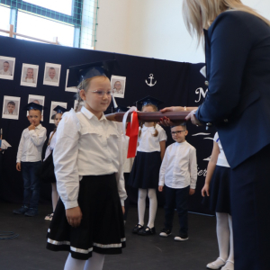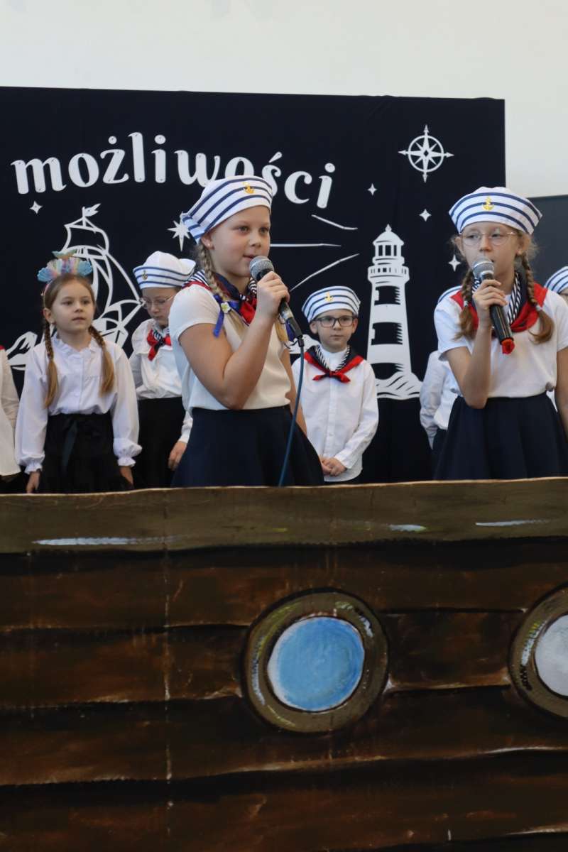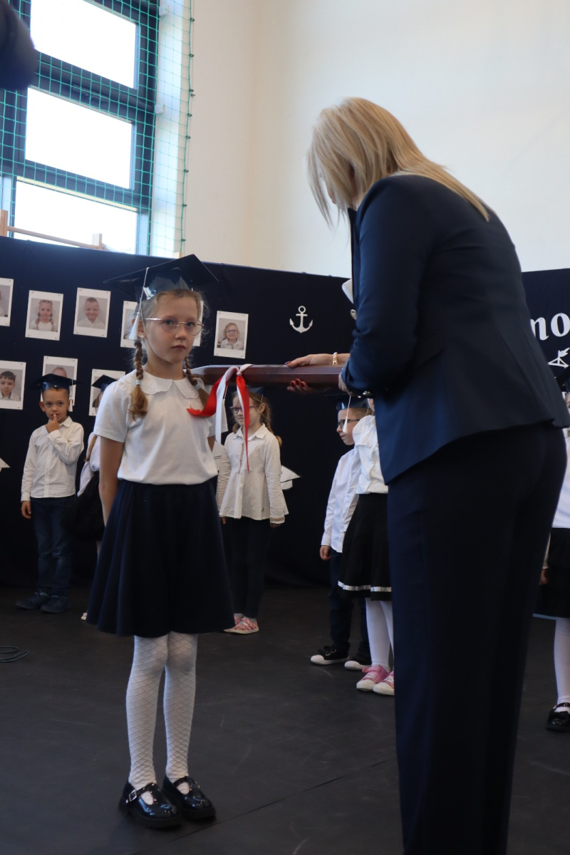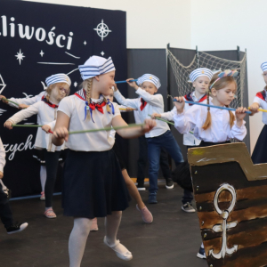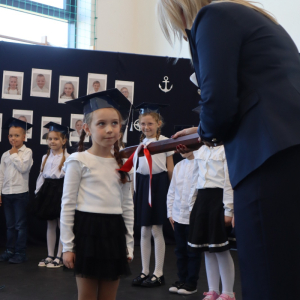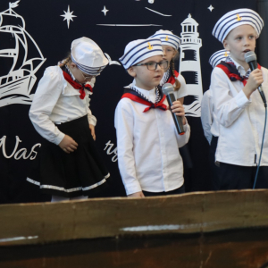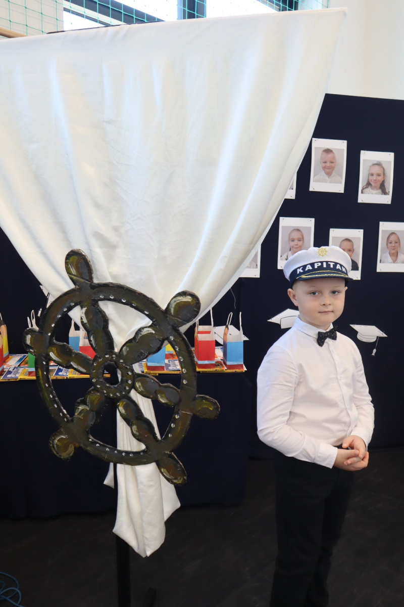 W dalszej części, uczniowie klasy pierwszej zaprezentowali program artystyczny w stylu marynistycznym, przygotowany pod kierunkiem wychowawczyni Pani Ilony Pokusy, w którym zaprezentowali swoje niezwykłe talenty wokalne, recytatorskie i taneczne. Po występach nastąpił najważniejszy moment – akt ślubowania, podczas którego 13-ścioro dzielnych i zdolnych uczniów, czego dowiedli w czasie występu, złożyło uroczystą przysięgę, zobowiązując się do sumiennego wypełniania obowiązków ucznia, dbania o dobre imię szkoły oraz bycia dobrym kolegą i koleżanką. Po złożeniu ślubowania przyszła pora na pasowanie, którego dokonała Pani Dyrektor, poprzez symbolicznie dotknięte ołówkiem. Na zakończenie Pierwszoklasiści otrzymali dyplomy i drobne upominki.