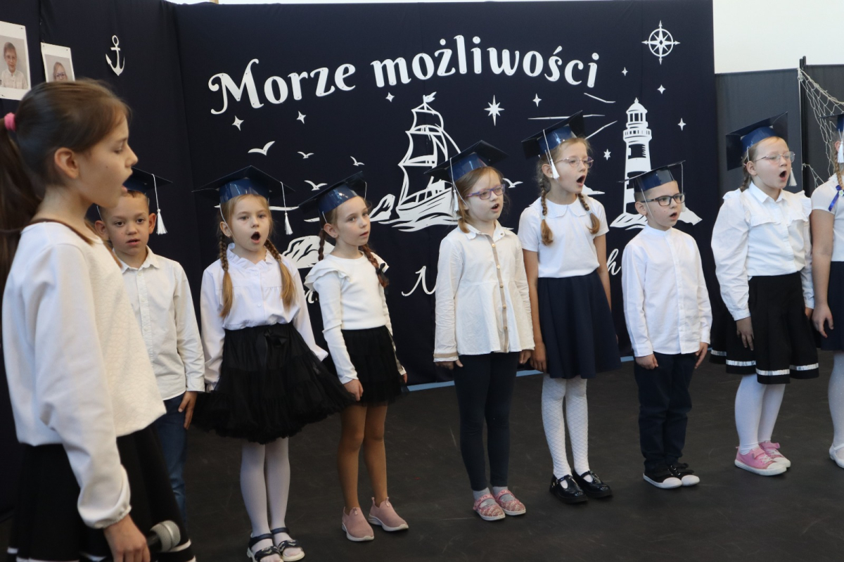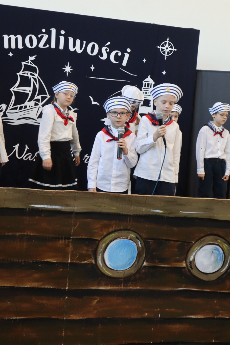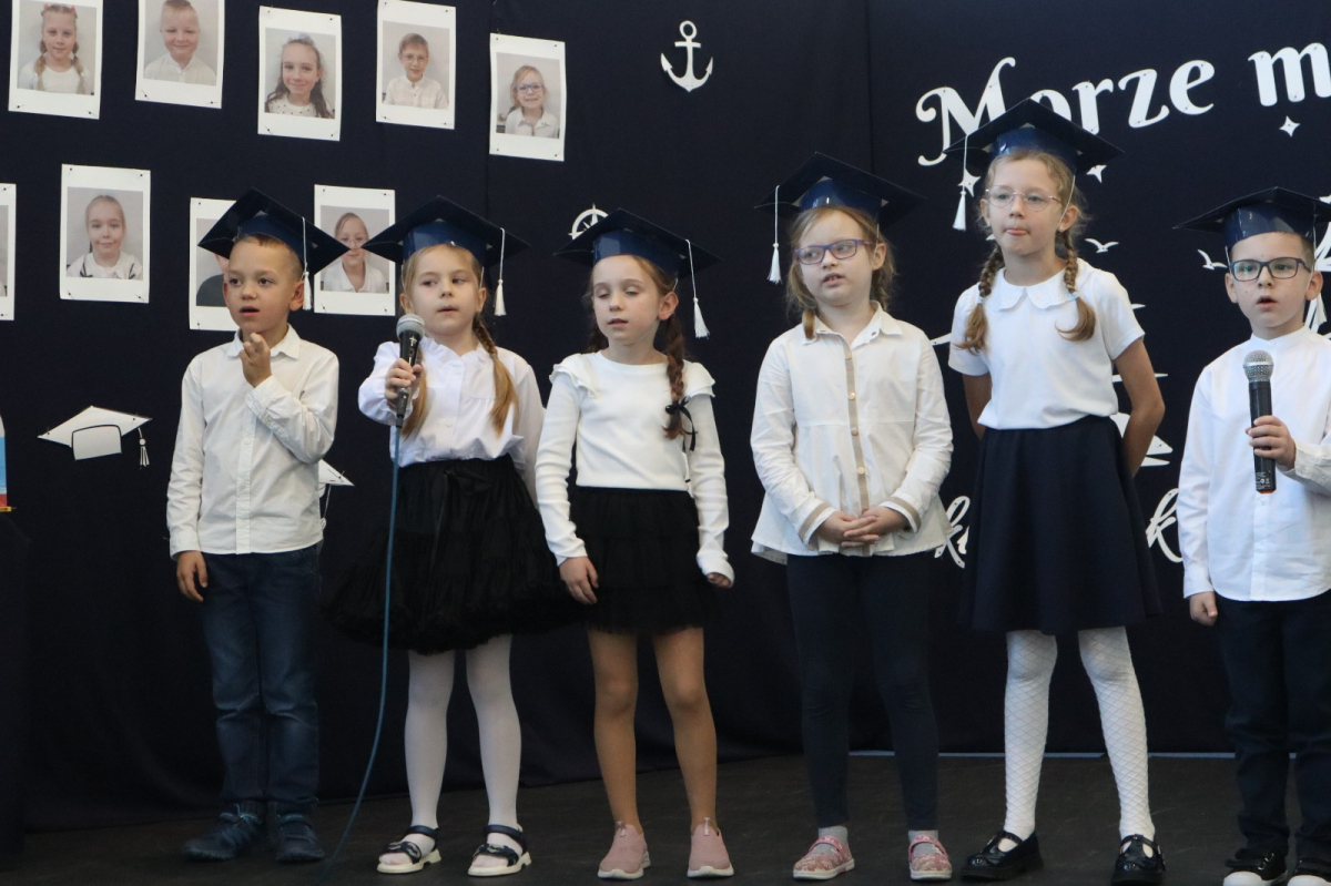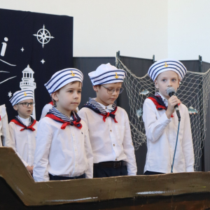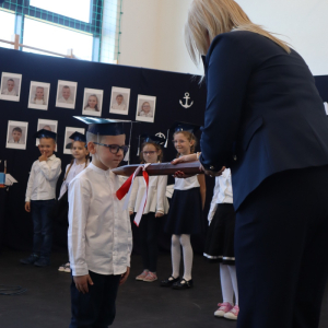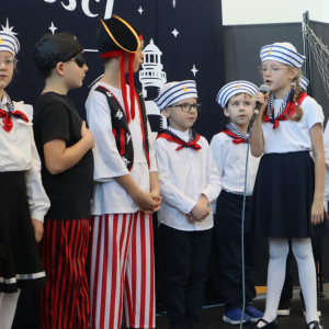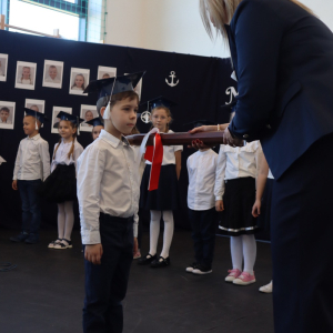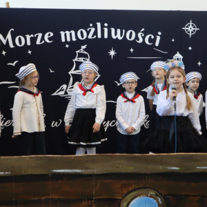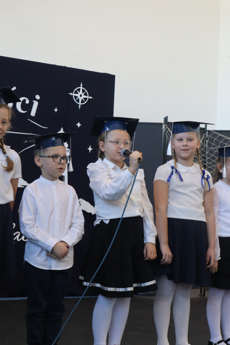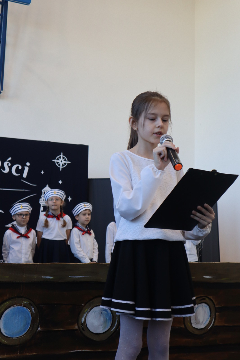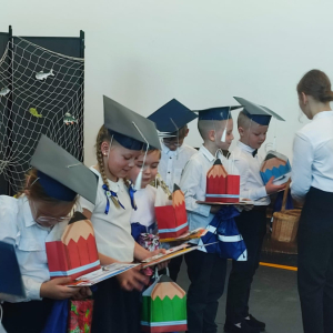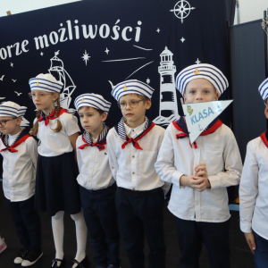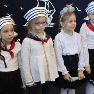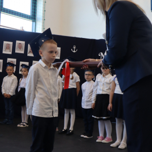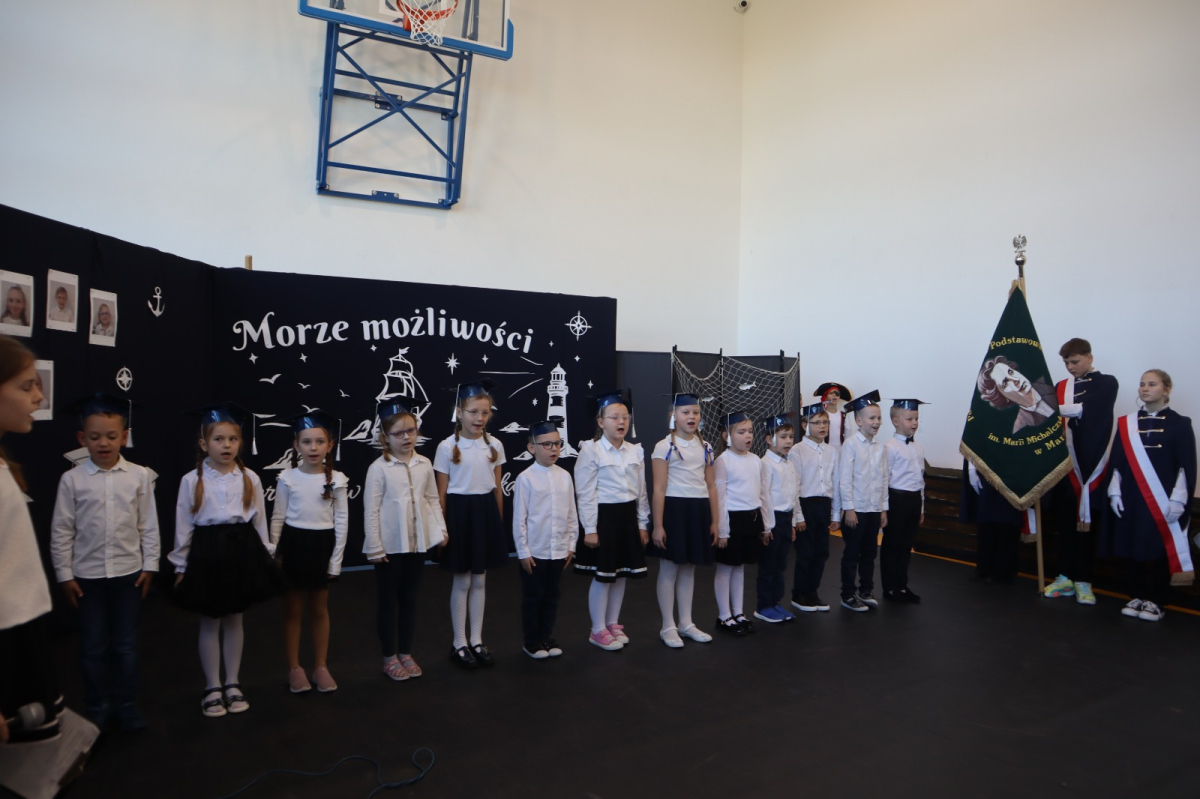 W dalszej części, uczniowie klasy pierwszej zaprezentowali program artystyczny w stylu marynistycznym, przygotowany pod kierunkiem wychowawczyni Pani Ilony Pokusy, w którym zaprezentowali swoje niezwykłe talenty wokalne, recytatorskie i taneczne. Po występach nastąpił najważniejszy moment – akt ślubowania, podczas którego 13-ścioro dzielnych i zdolnych uczniów, czego dowiedli w czasie występu, złożyło uroczystą przysięgę, zobowiązując się do sumiennego wypełniania obowiązków ucznia, dbania o dobre imię szkoły oraz bycia dobrym kolegą i koleżanką. Po złożeniu ślubowania przyszła pora na pasowanie, którego dokonała Pani Dyrektor, poprzez symbolicznie dotknięte ołówkiem. Na zakończenie Pierwszoklasiści otrzymali dyplomy i drobne upominki.