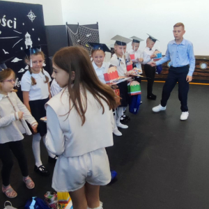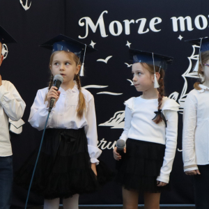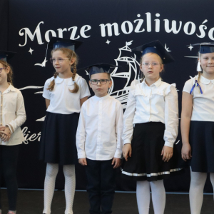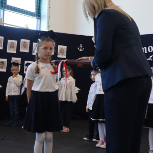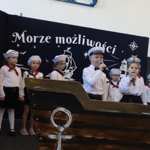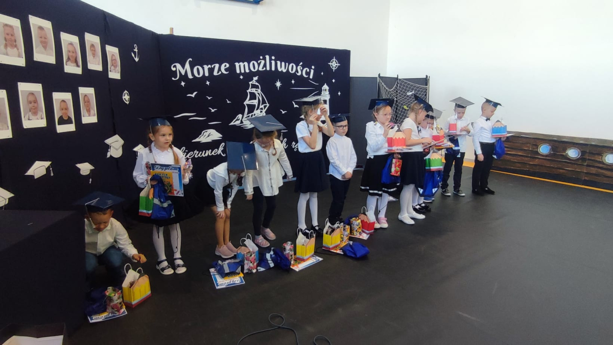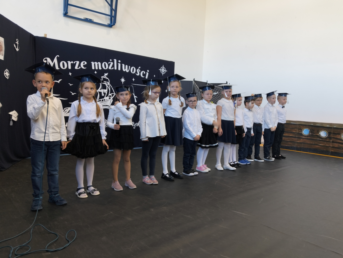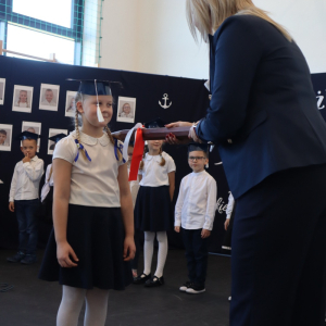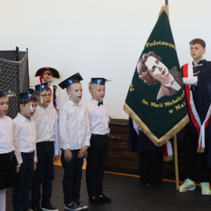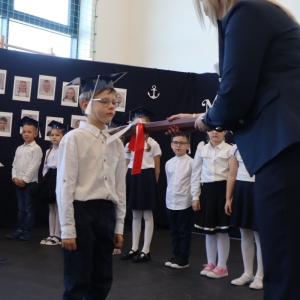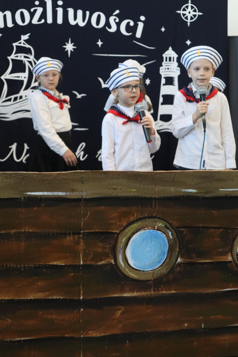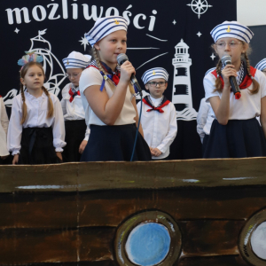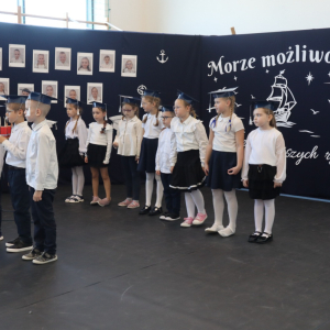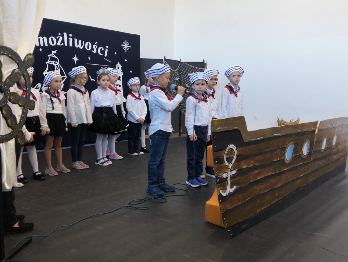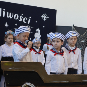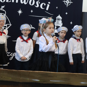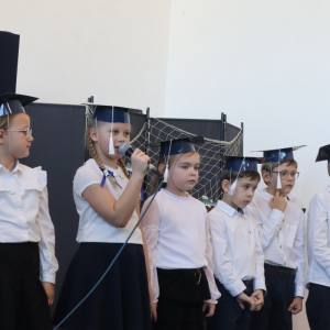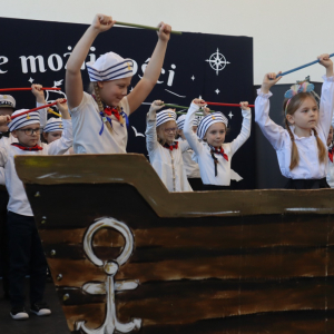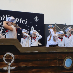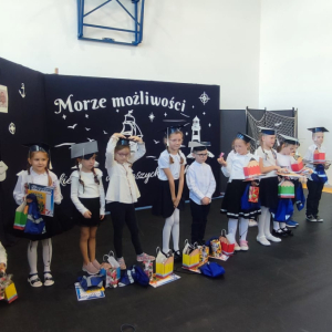 W dalszej części, uczniowie klasy pierwszej zaprezentowali program artystyczny w stylu marynistycznym, przygotowany pod kierunkiem wychowawczyni Pani Ilony Pokusy, w którym zaprezentowali swoje niezwykłe talenty wokalne, recytatorskie i taneczne. Po występach nastąpił najważniejszy moment – akt ślubowania, podczas którego 13-ścioro dzielnych i zdolnych uczniów, czego dowiedli w czasie występu, złożyło uroczystą przysięgę, zobowiązując się do sumiennego wypełniania obowiązków ucznia, dbania o dobre imię szkoły oraz bycia dobrym kolegą i koleżanką. Po złożeniu ślubowania przyszła pora na pasowanie, którego dokonała Pani Dyrektor, poprzez symbolicznie dotknięte ołówkiem. Na zakończenie Pierwszoklasiści otrzymali dyplomy i drobne upominki.