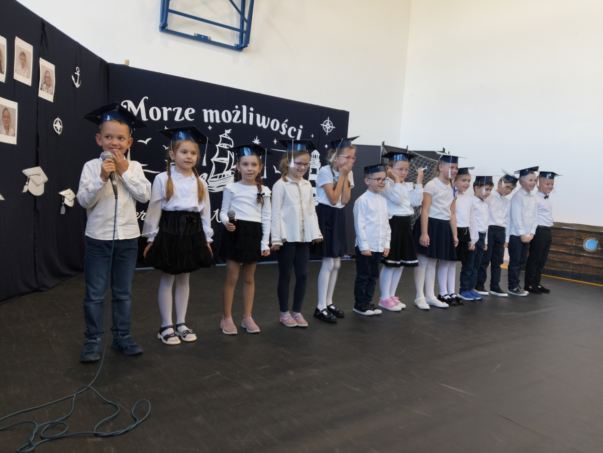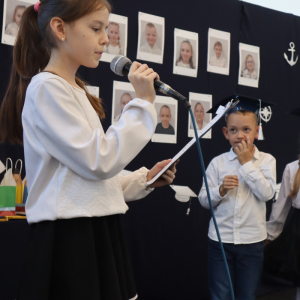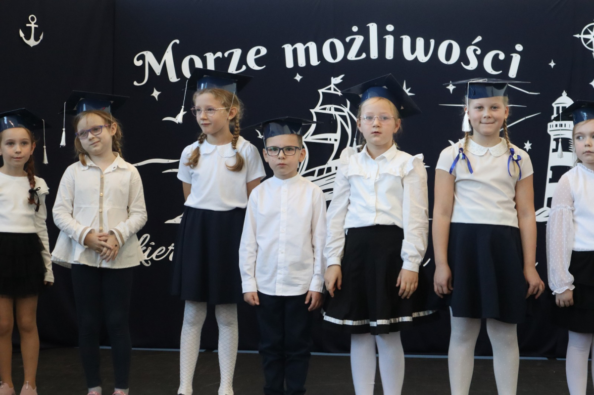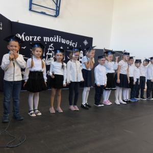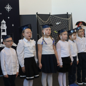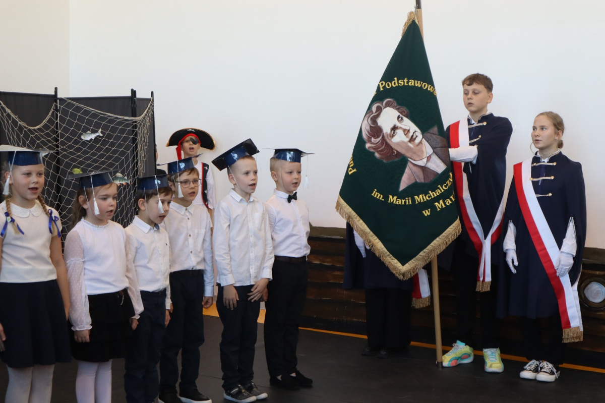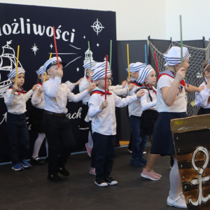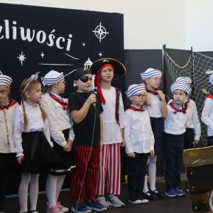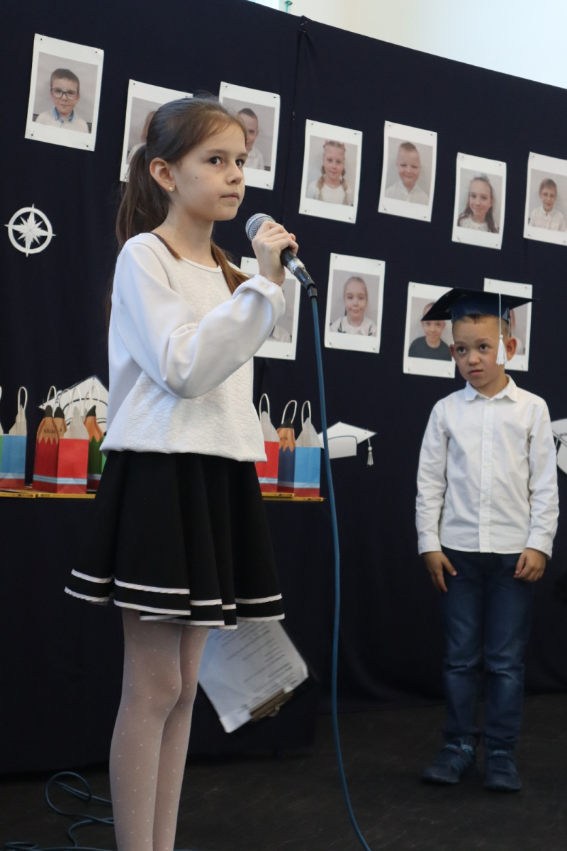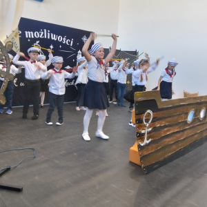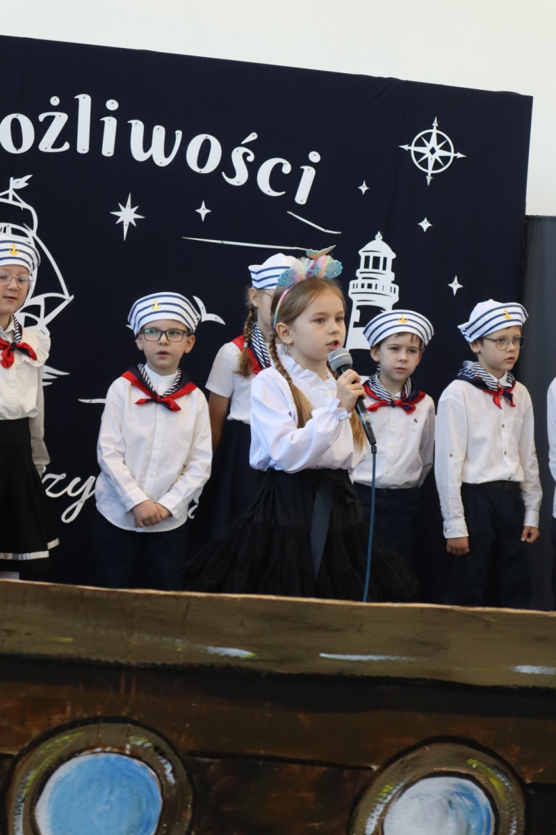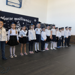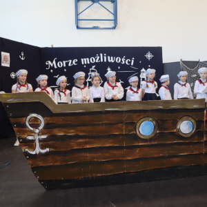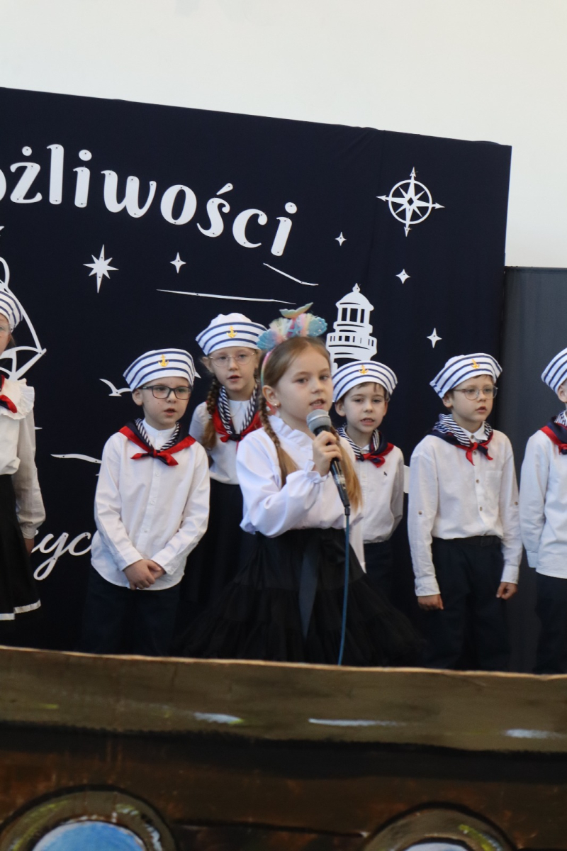 W dalszej części, uczniowie klasy pierwszej zaprezentowali program artystyczny w stylu marynistycznym, przygotowany pod kierunkiem wychowawczyni Pani Ilony Pokusy, w którym zaprezentowali swoje niezwykłe talenty wokalne, recytatorskie i taneczne. Po występach nastąpił najważniejszy moment – akt ślubowania, podczas którego 13-ścioro dzielnych i zdolnych uczniów, czego dowiedli w czasie występu, złożyło uroczystą przysięgę, zobowiązując się do sumiennego wypełniania obowiązków ucznia, dbania o dobre imię szkoły oraz bycia dobrym kolegą i koleżanką. Po złożeniu ślubowania przyszła pora na pasowanie, którego dokonała Pani Dyrektor, poprzez symbolicznie dotknięte ołówkiem. Na zakończenie Pierwszoklasiści otrzymali dyplomy i drobne upominki.