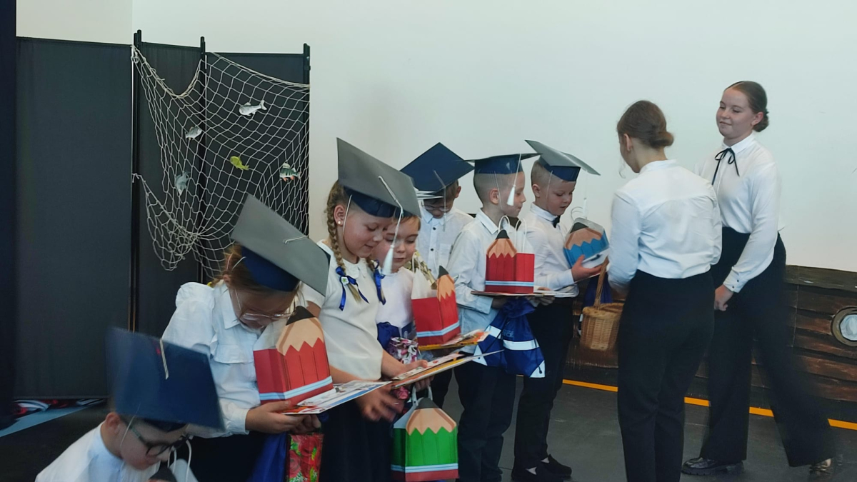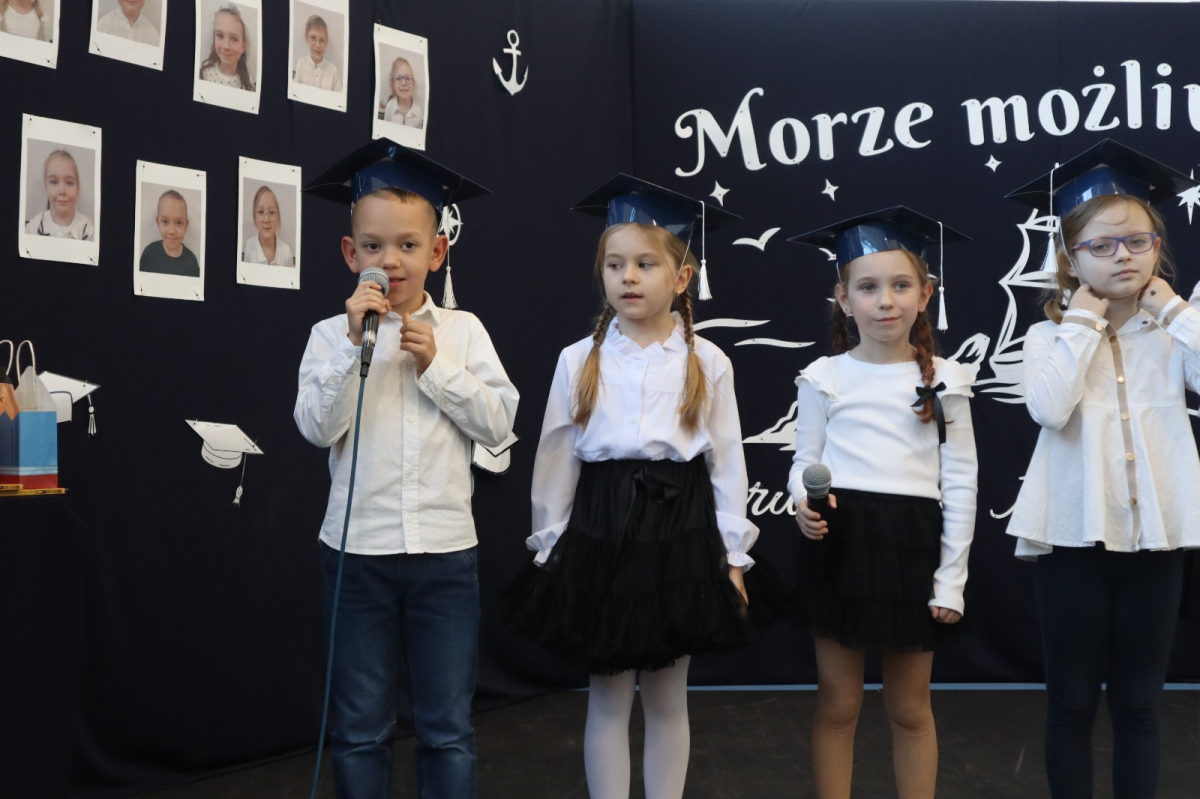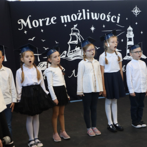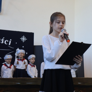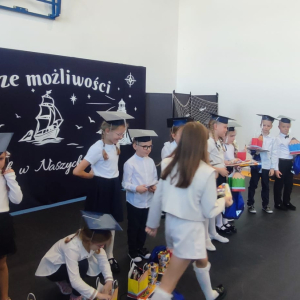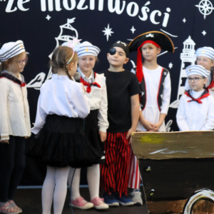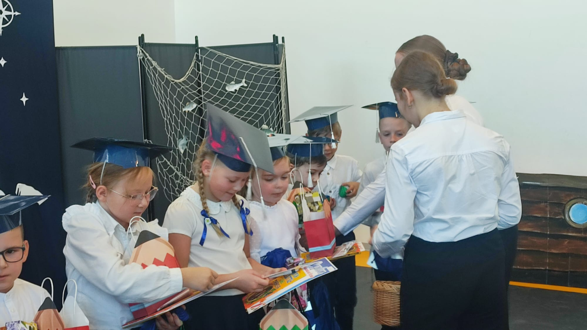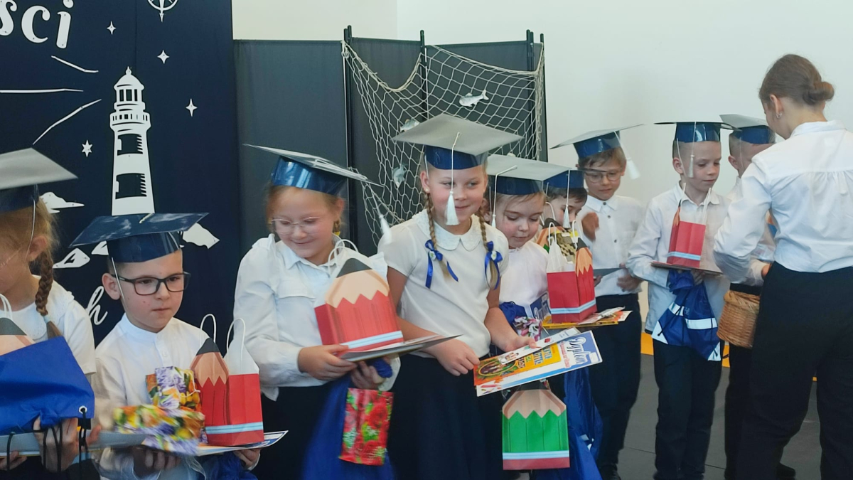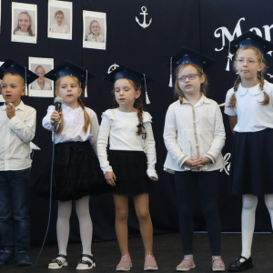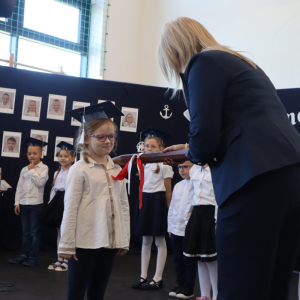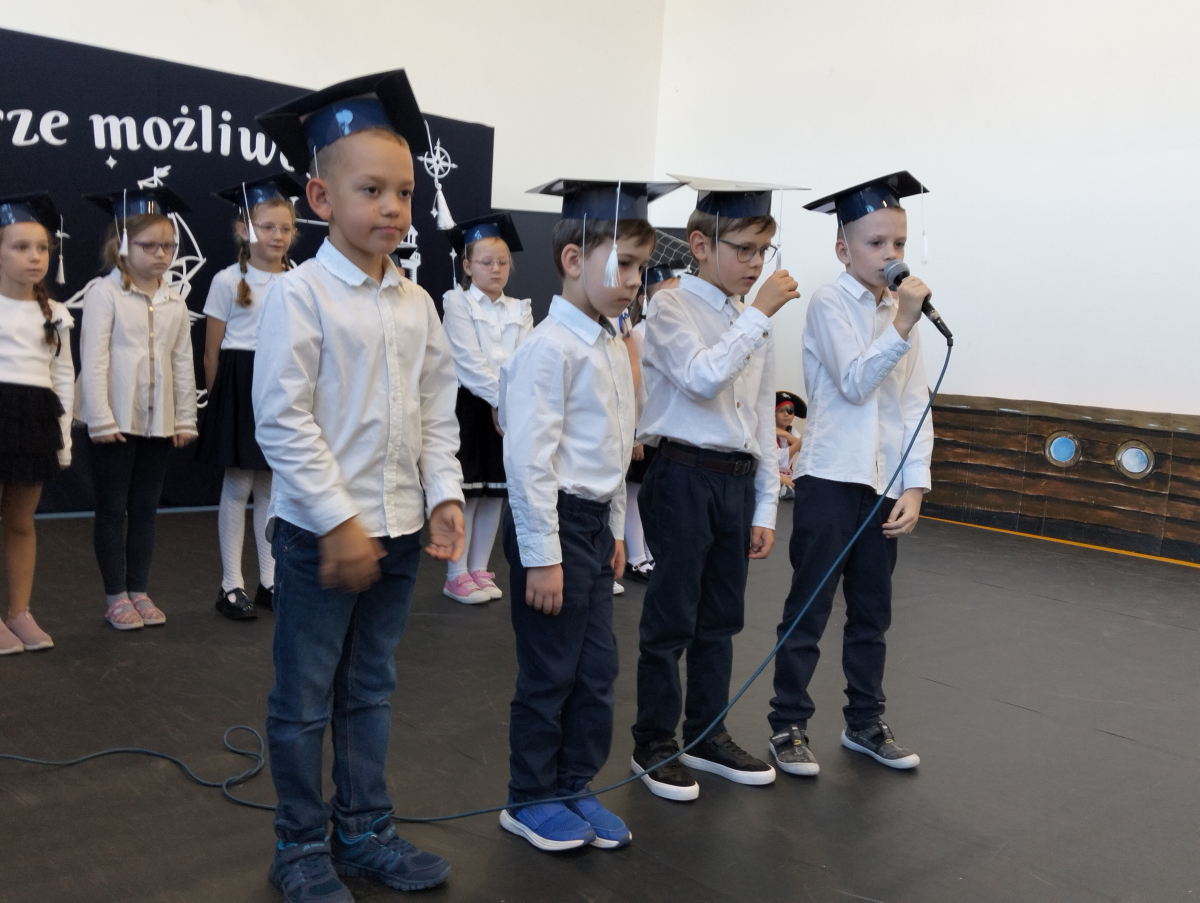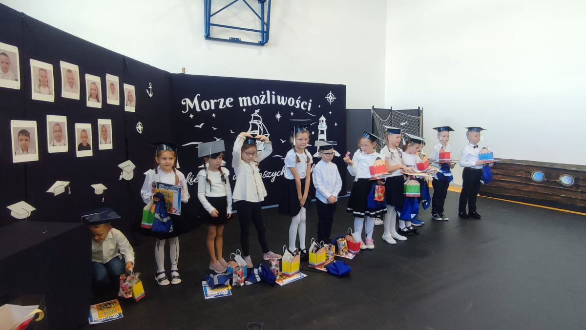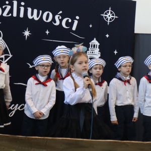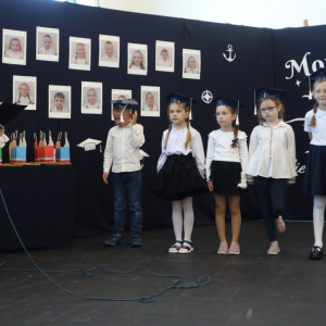 W dalszej części, uczniowie klasy pierwszej zaprezentowali program artystyczny w stylu marynistycznym, przygotowany pod kierunkiem wychowawczyni Pani Ilony Pokusy, w którym zaprezentowali swoje niezwykłe talenty wokalne, recytatorskie i taneczne. Po występach nastąpił najważniejszy moment – akt ślubowania, podczas którego 13-ścioro dzielnych i zdolnych uczniów, czego dowiedli w czasie występu, złożyło uroczystą przysięgę, zobowiązując się do sumiennego wypełniania obowiązków ucznia, dbania o dobre imię szkoły oraz bycia dobrym kolegą i koleżanką. Po złożeniu ślubowania przyszła pora na pasowanie, którego dokonała Pani Dyrektor, poprzez symbolicznie dotknięte ołówkiem. Na zakończenie Pierwszoklasiści otrzymali dyplomy i drobne upominki.
