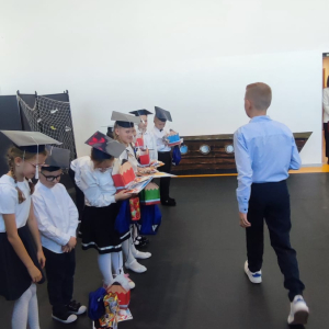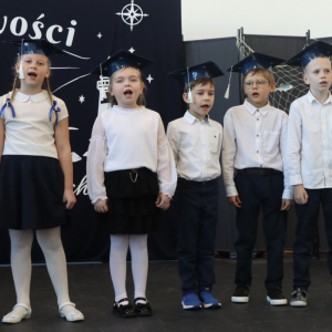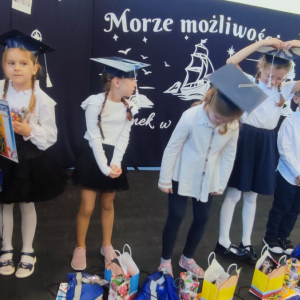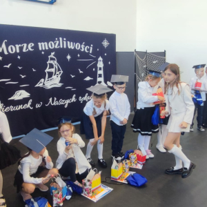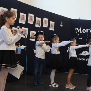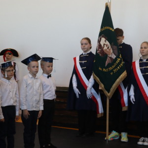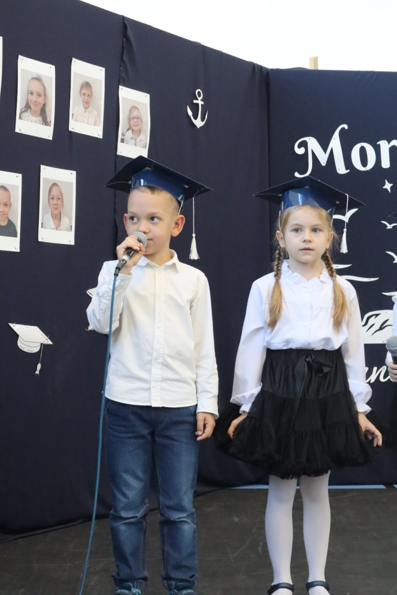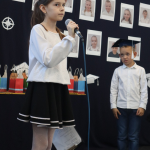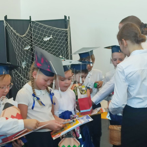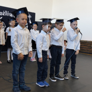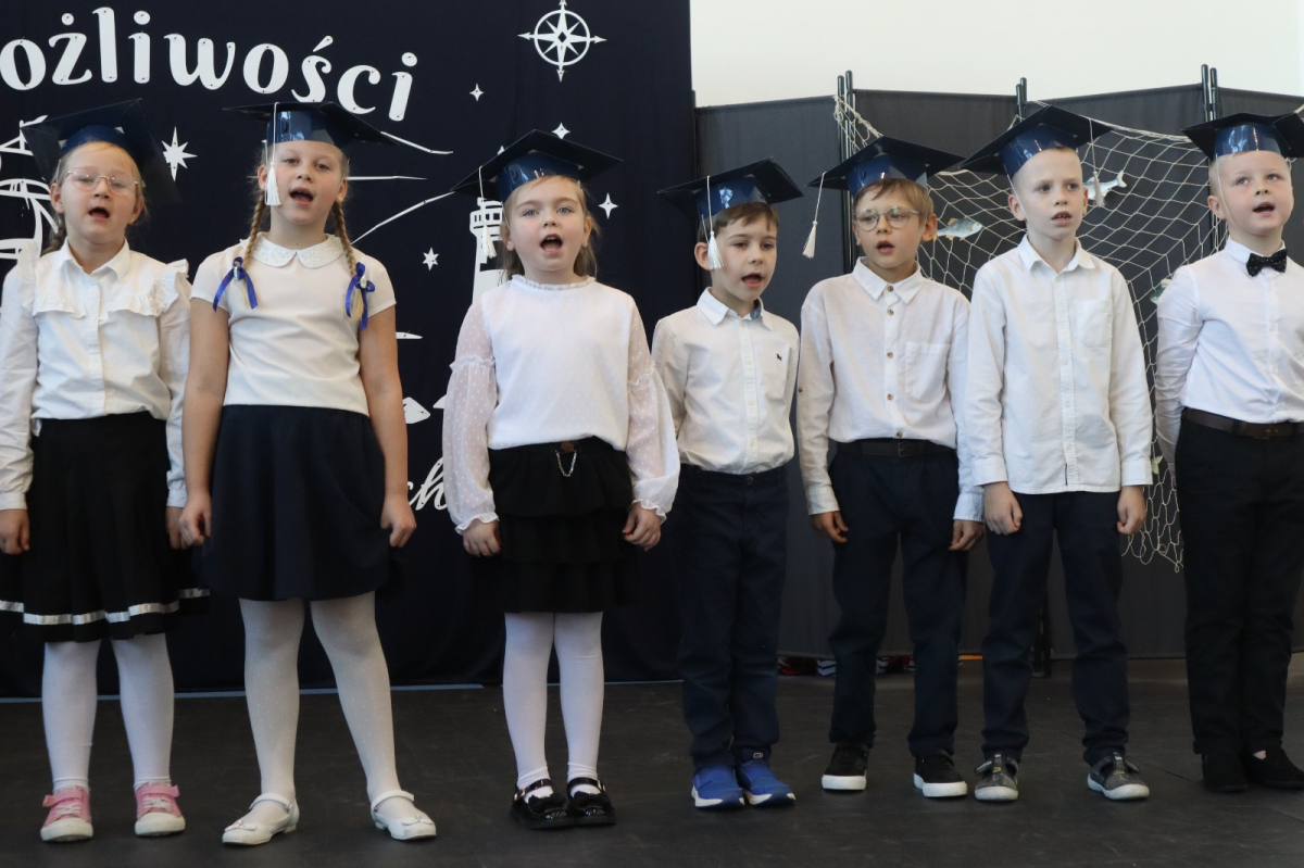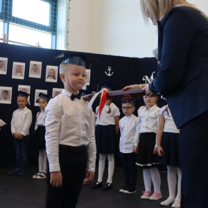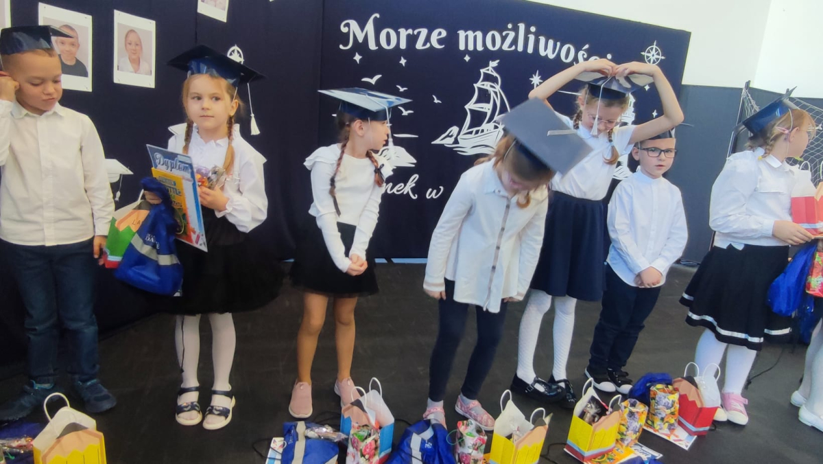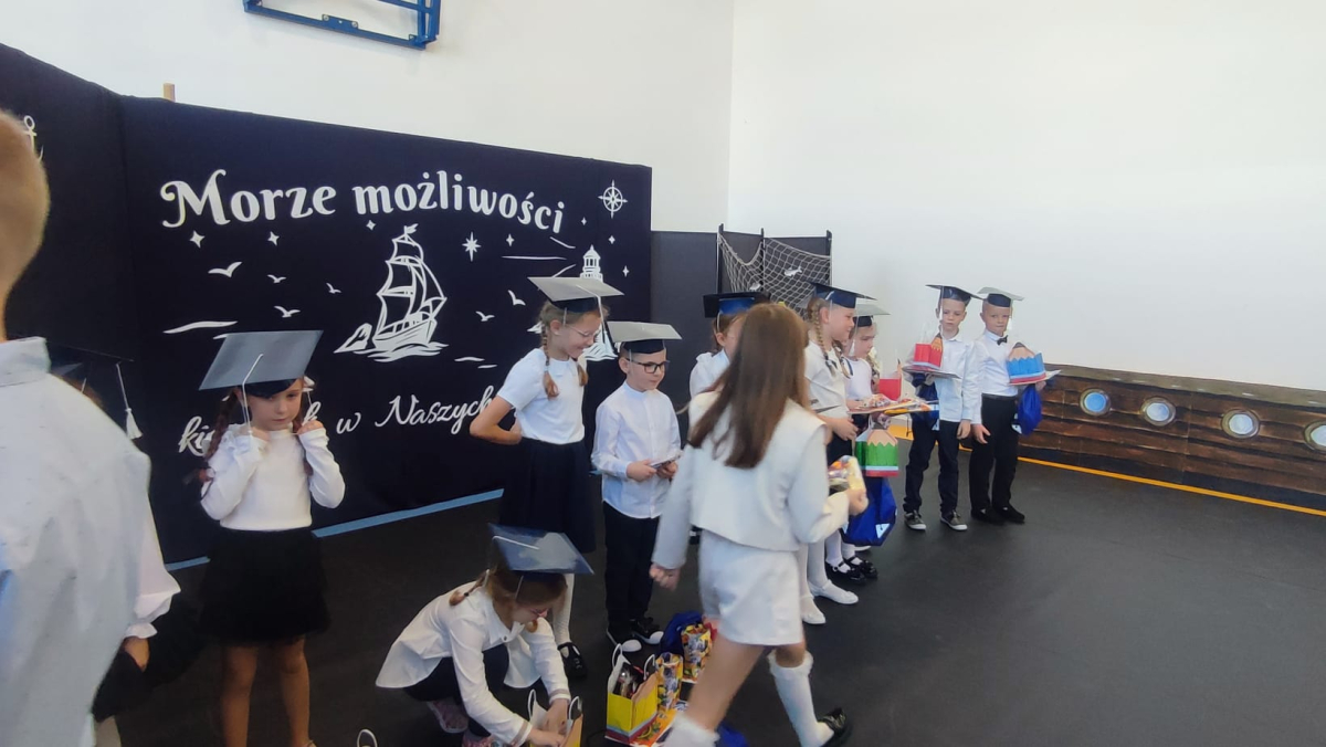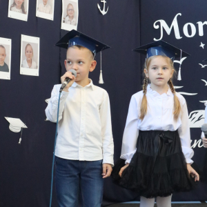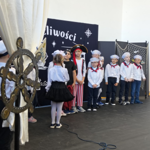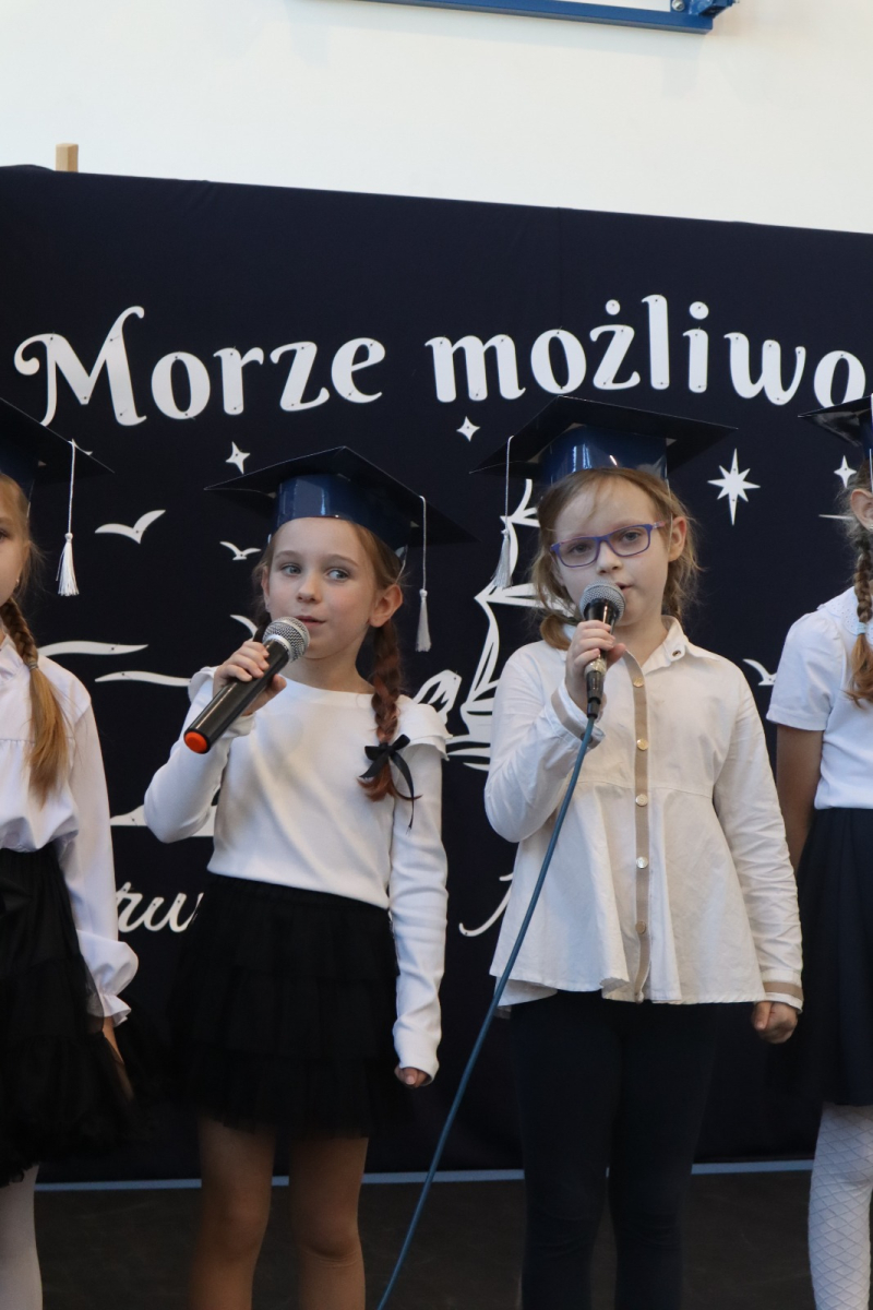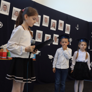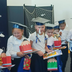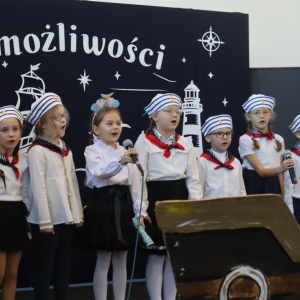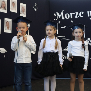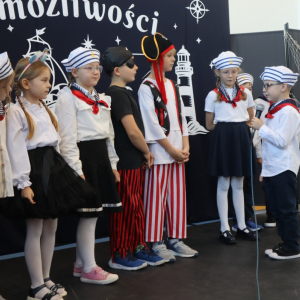 W dalszej części, uczniowie klasy pierwszej zaprezentowali program artystyczny w stylu marynistycznym, przygotowany pod kierunkiem wychowawczyni Pani Ilony Pokusy, w którym zaprezentowali swoje niezwykłe talenty wokalne, recytatorskie i taneczne. Po występach nastąpił najważniejszy moment – akt ślubowania, podczas którego 13-ścioro dzielnych i zdolnych uczniów, czego dowiedli w czasie występu, złożyło uroczystą przysięgę, zobowiązując się do sumiennego wypełniania obowiązków ucznia, dbania o dobre imię szkoły oraz bycia dobrym kolegą i koleżanką. Po złożeniu ślubowania przyszła pora na pasowanie, którego dokonała Pani Dyrektor, poprzez symbolicznie dotknięte ołówkiem. Na zakończenie Pierwszoklasiści otrzymali dyplomy i drobne upominki.